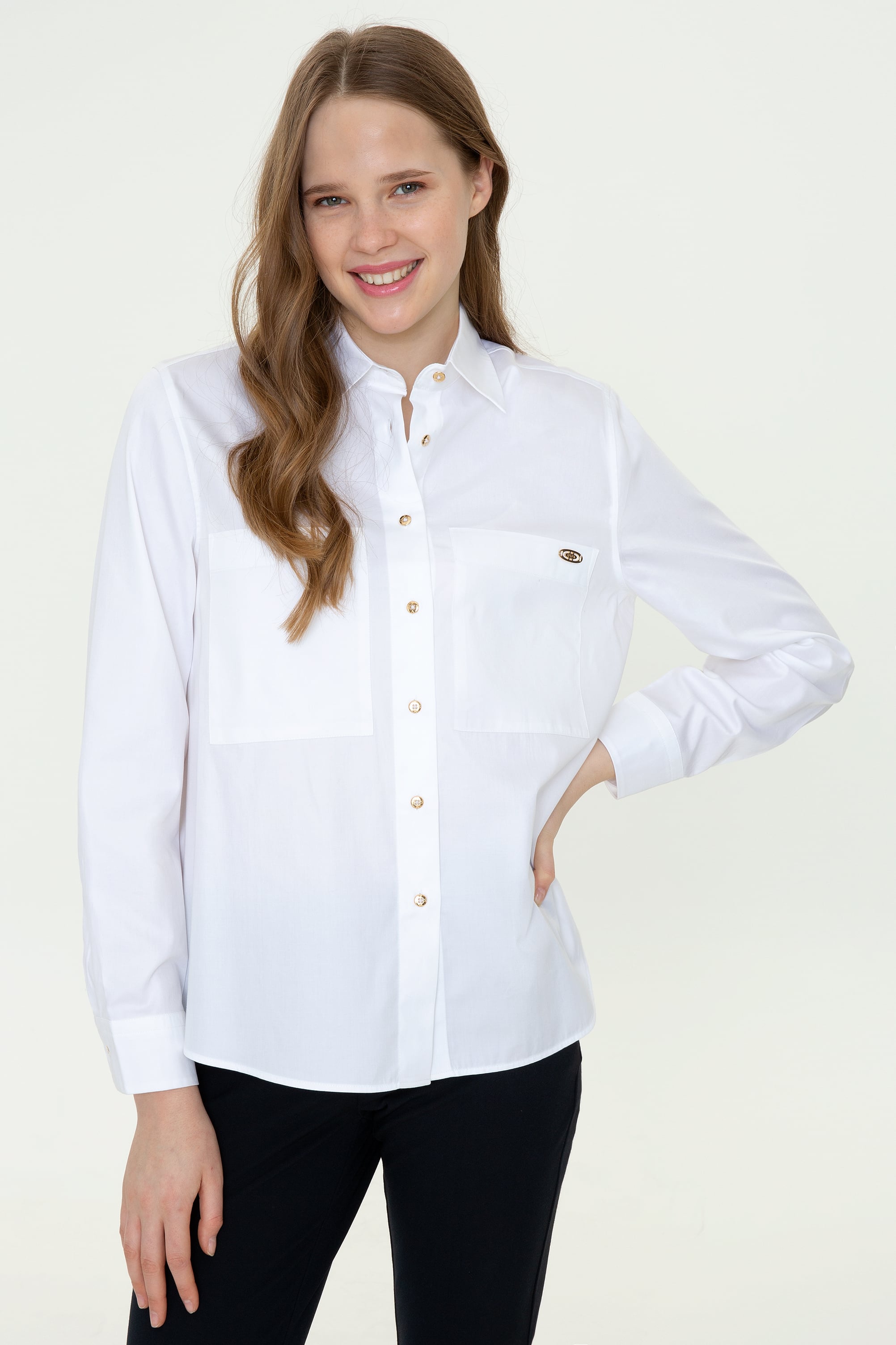 %100 pamuk kumaşı cildinizin hava almasına olanak verirken, comfort fit kesimi sayesinde kadın cepli gömlek modelimizi gün boyu konforlu bir şekilde kullanabilirsiniz.