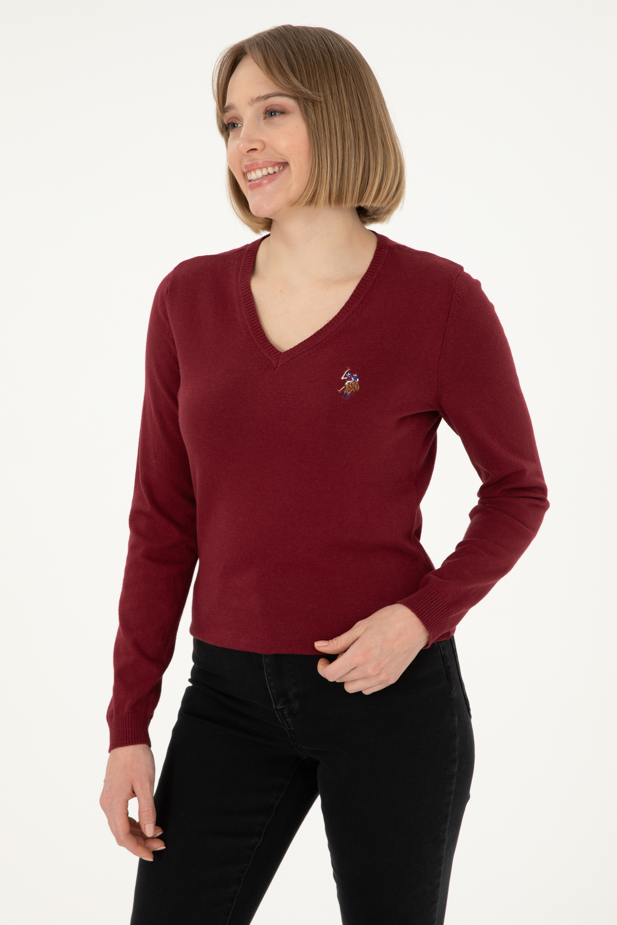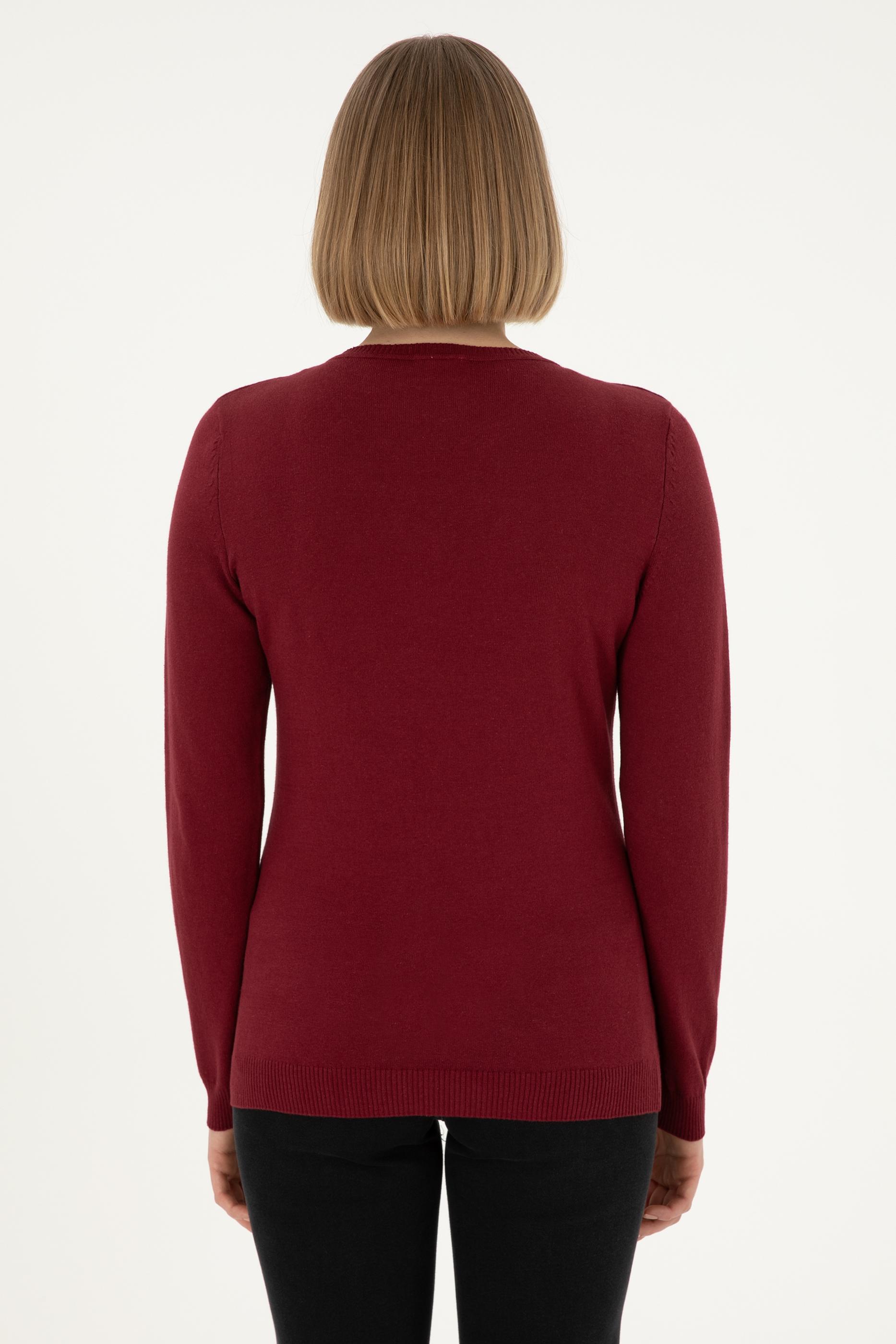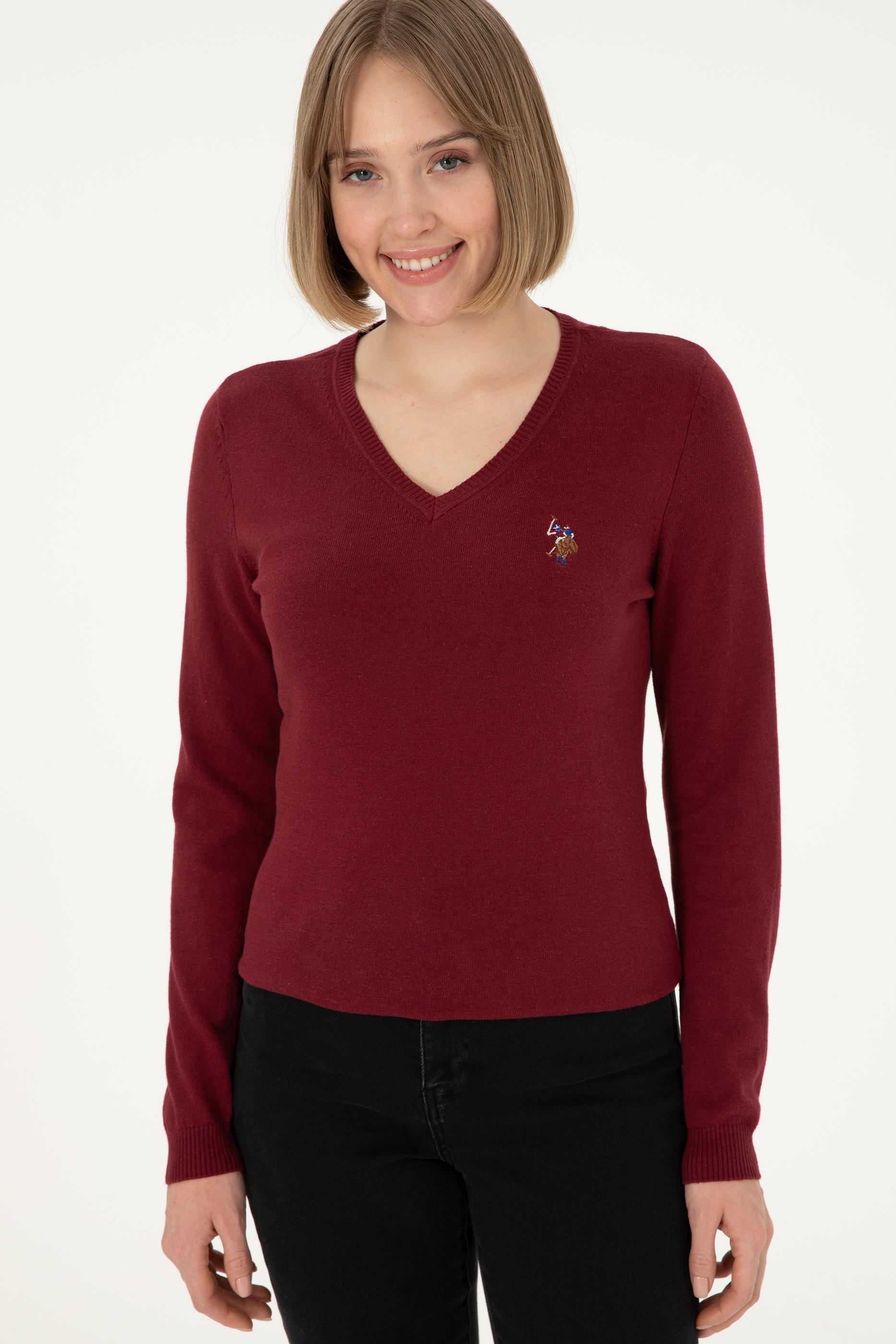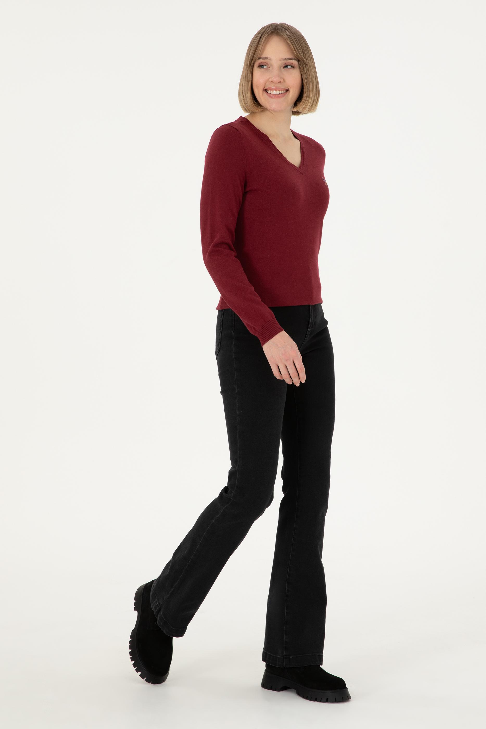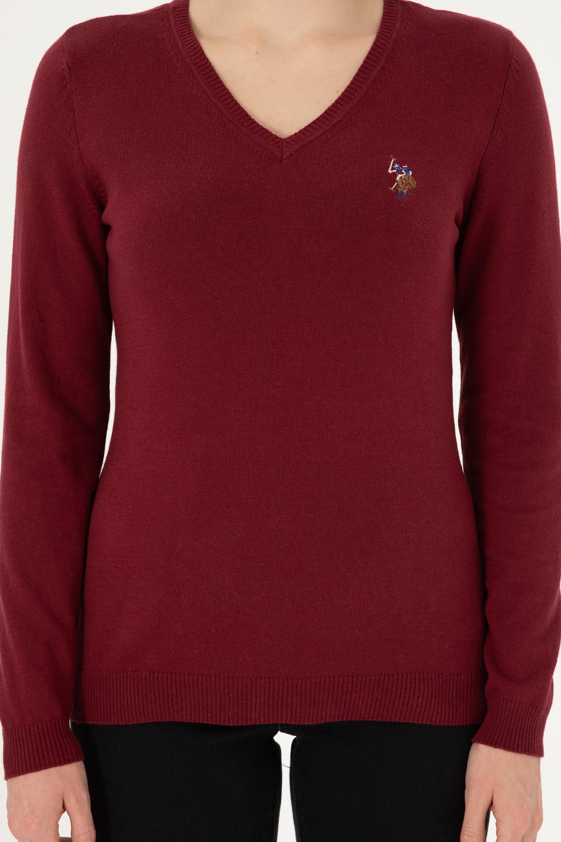 Kadın Bordo V Yaka Basic Kazak