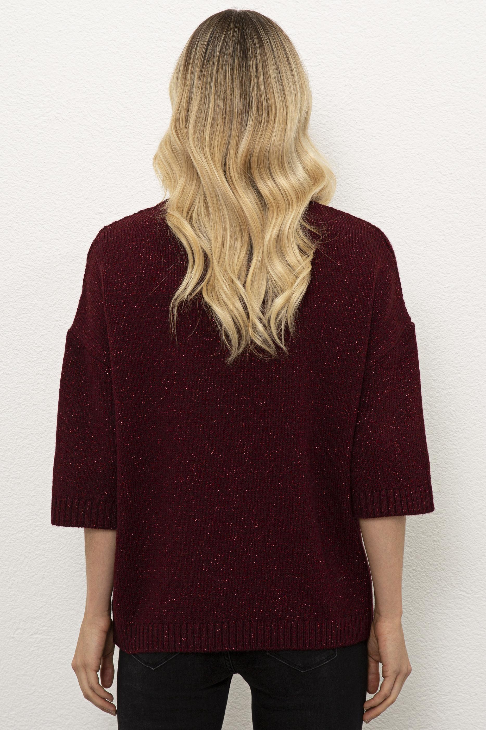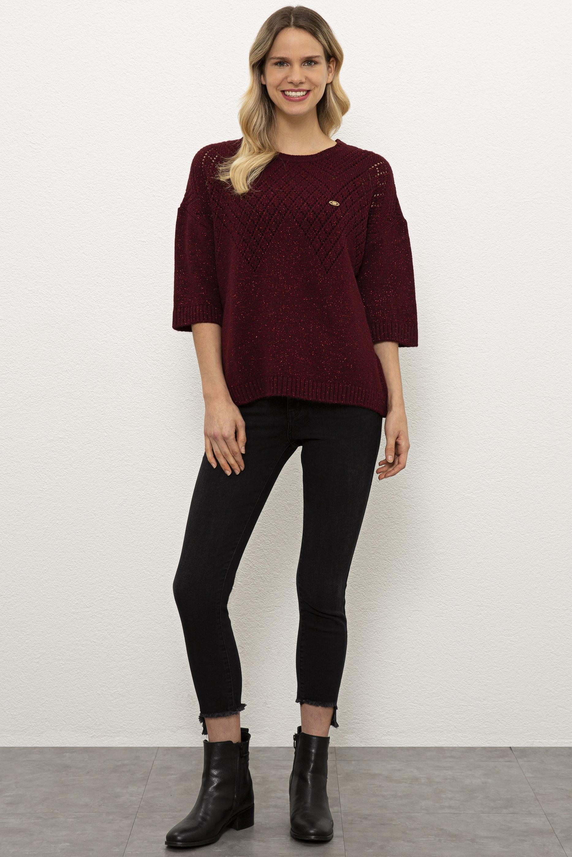 %85 akrilik, %9 poliester ve %6 polyamid karışımlı bisiklet yaka kadın triko kazak modelimiz 3/4 kol tasarımıyla öne çıkıyor.
