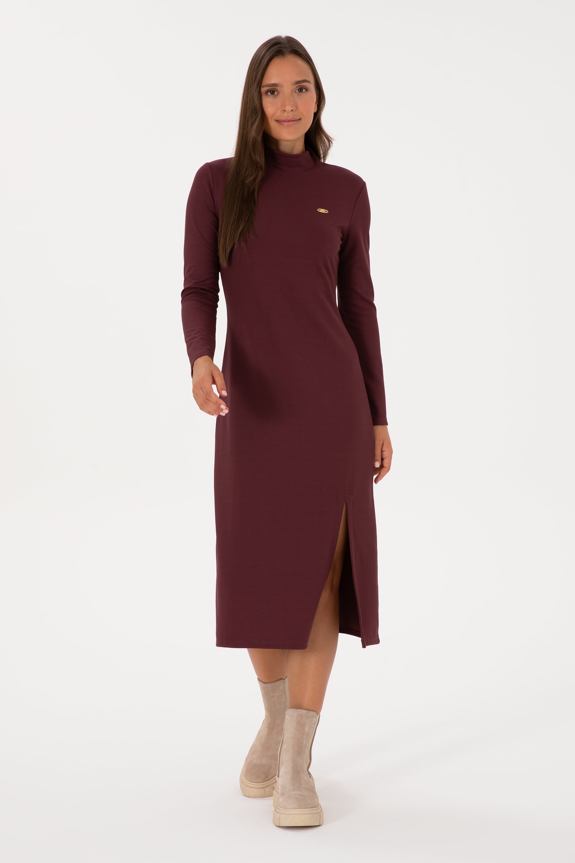 Kadın Bordo Yırtmaçlı Dik Yaka Midi Boy Örme Elbise