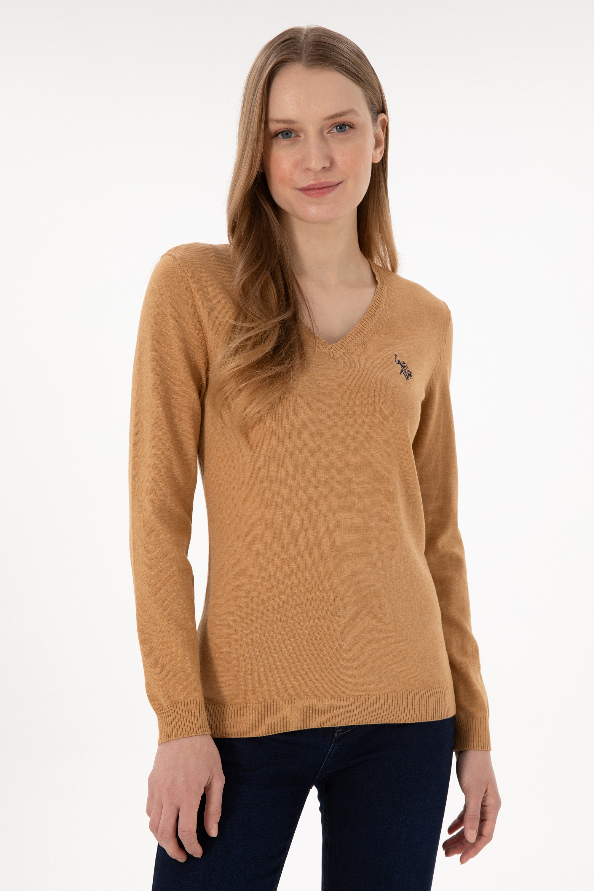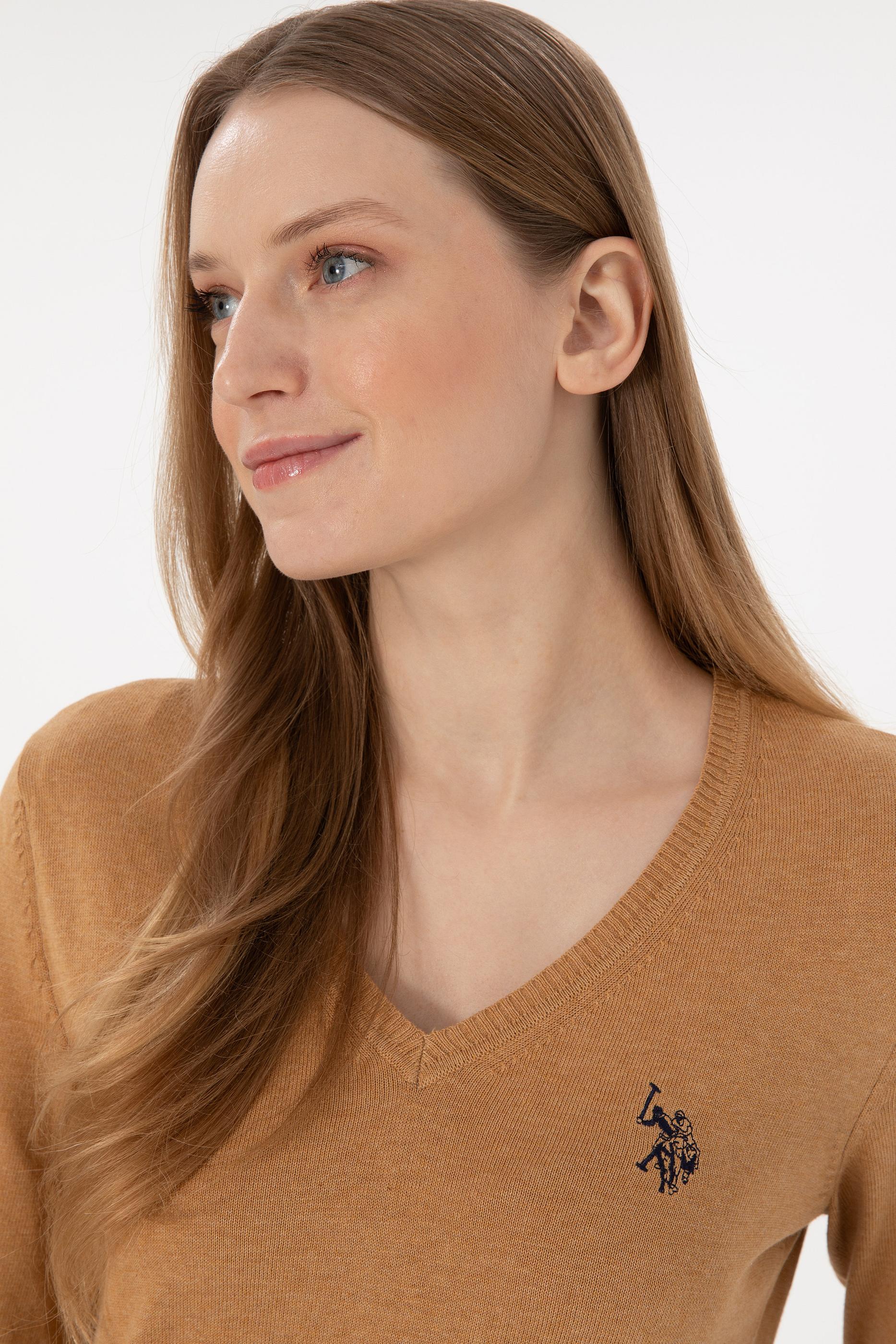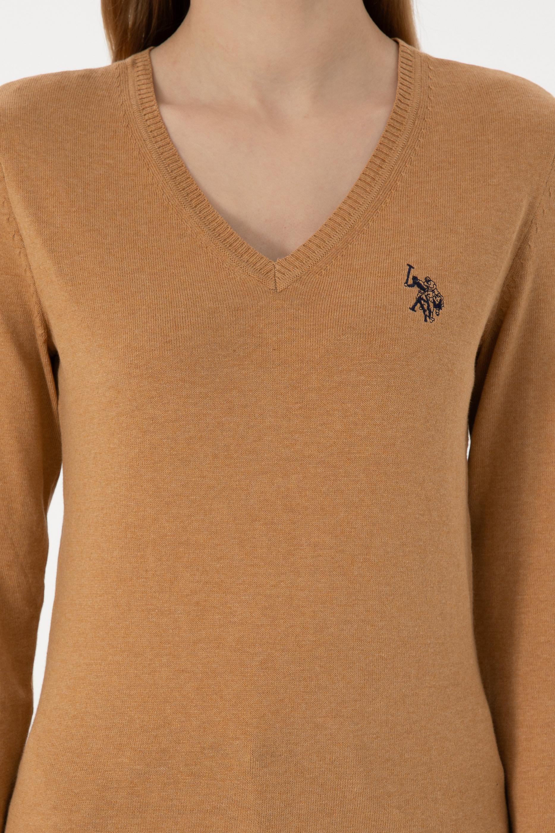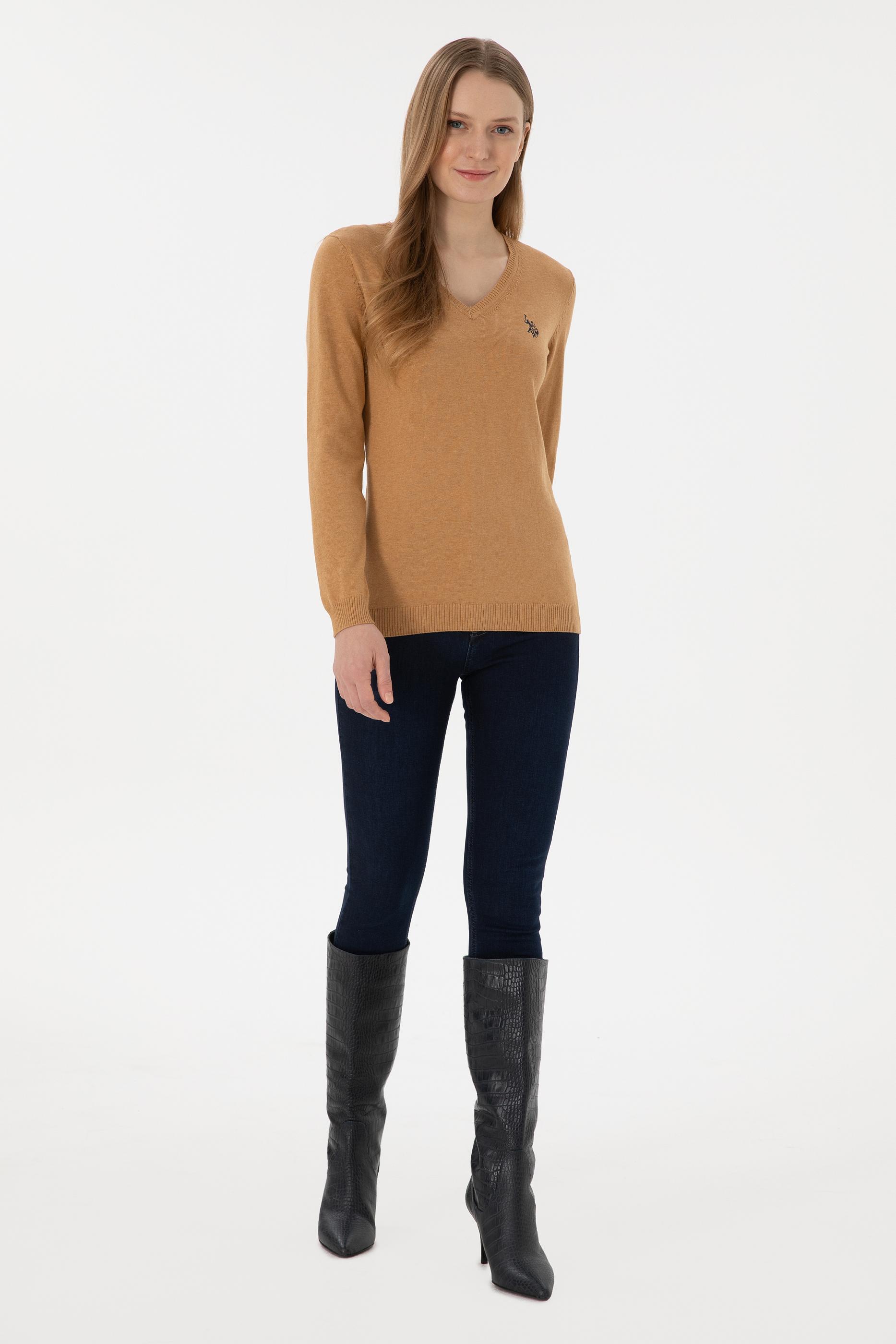 Kadın Camel Melanj V Yaka Basic Kazak