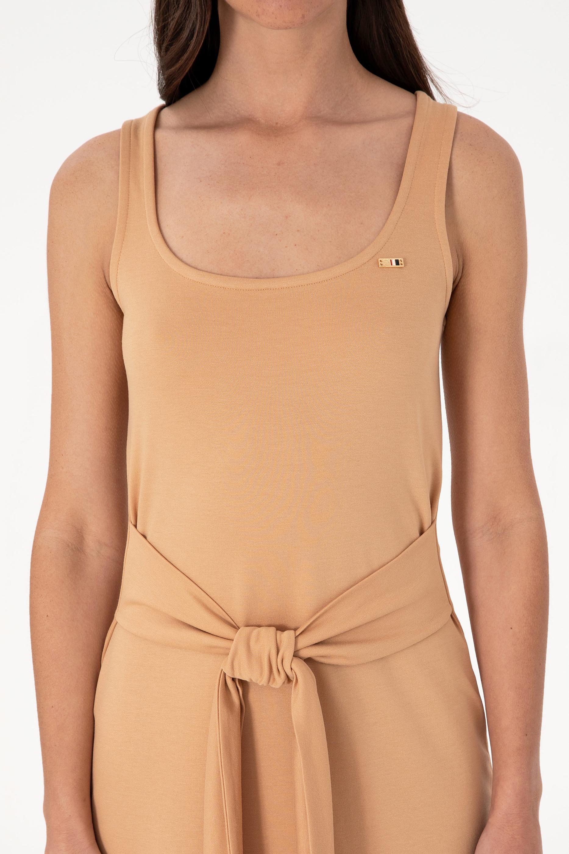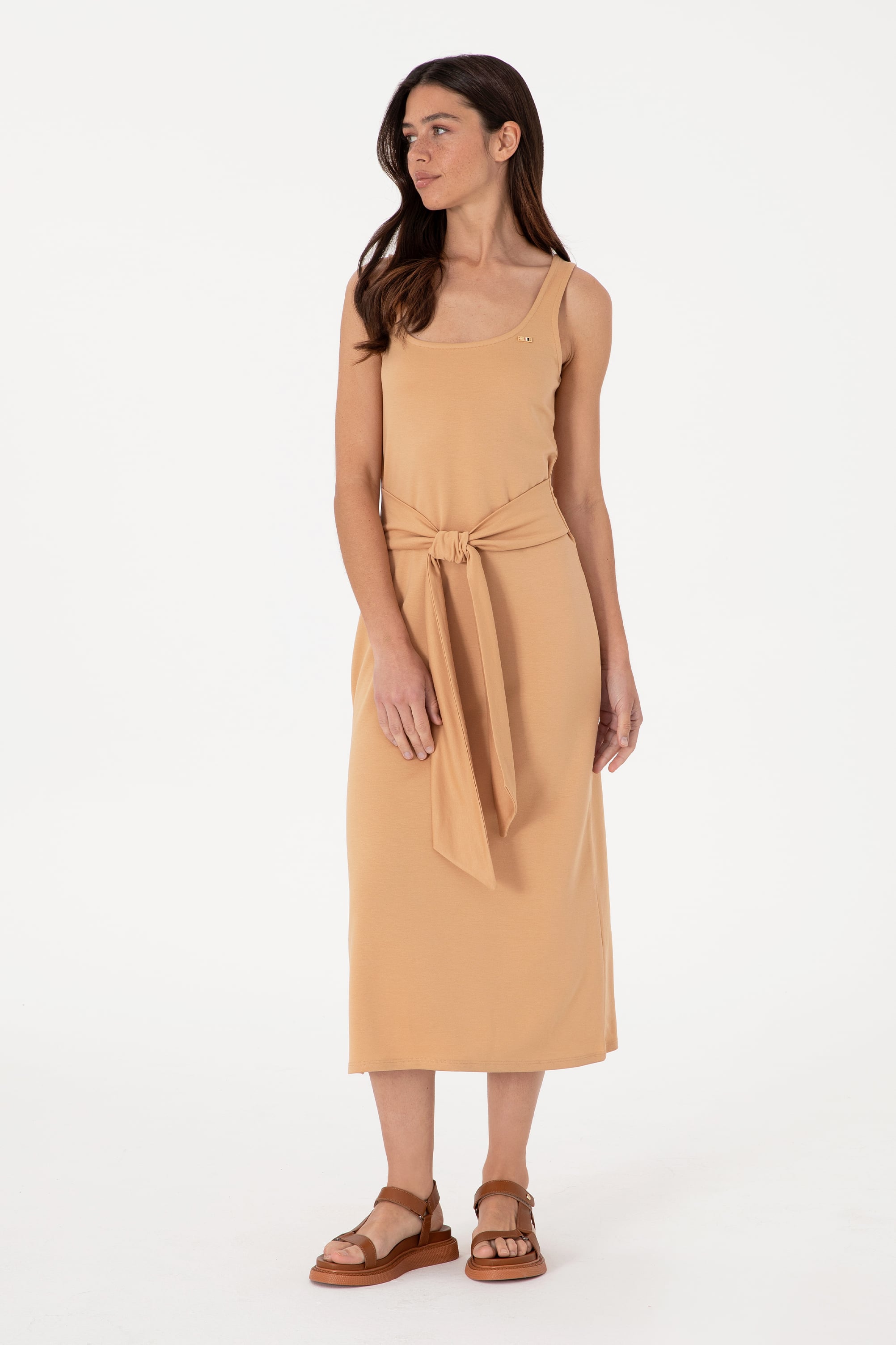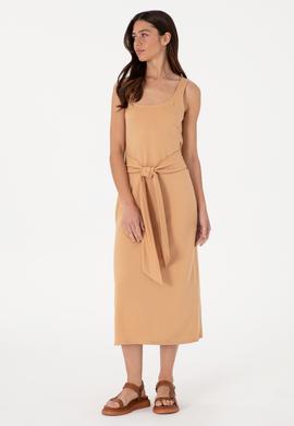 U.S. Polo Assn. stilini zarif dokunuşlarla yansıtan bu camel renkli kolsuz elbise, beldeki bağlama detayı ve yırtmaçlı eteğiyle sade şıklığı dinamik bir çizgiyle buluşturuyor. Hafif örme kumaşı ve dökümlü formu sayesinde yaz günlerinde ferah bir kullanım sunarken, bisiklet yaka kesimiyle doğal bir duruş sergiler. Bel kısmındaki uzun kuşak, vücut hatlarını nazikçe ortaya çıkarırken; etek ucundaki yırtmaç adımlarınıza özgürlük ve feminen bir hava katar. Sandalet, hasır çanta ve altın tonlu aksesuarlarla birleştiğinde sezonun en şık kombinlerinden birini oluşturur.
