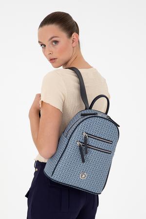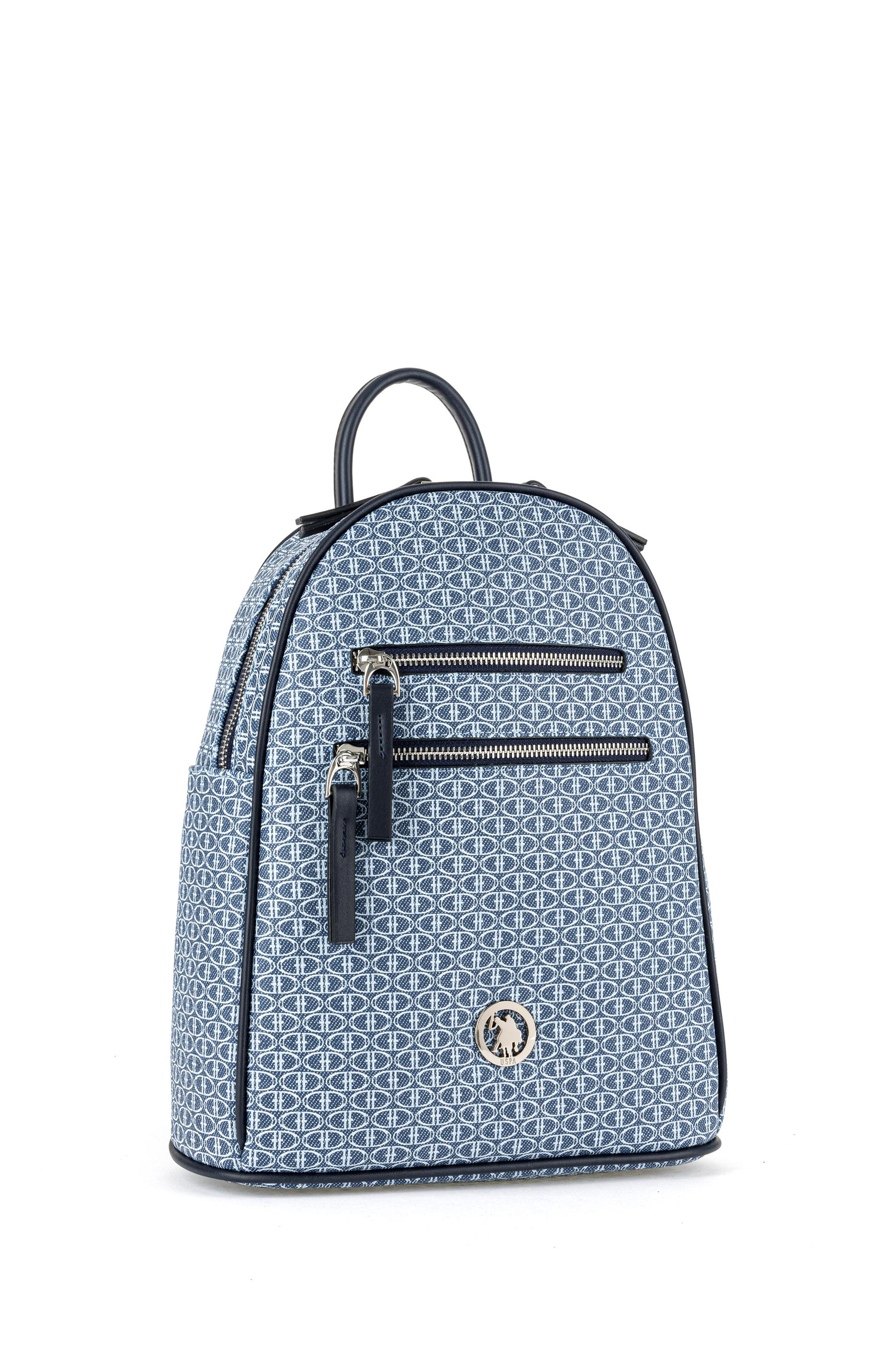 U.S. Polo Assn. denim sırt çantası, klasik sırt çantası formunu zarif detaylarla buluşturan kompakt bir modeldir. Tüm yüzeyi açık tonlu geometrik desenlerle kaplı olup, ön bölümde altın renkli yuvarlak metal logo yer alır. İki adet fermuarlı ön cep ve fermuarlı ana bölme sayesinde düzenli kullanım imkânı sunar. Fermuar uçlarında lacivert deri görünümlü şerit detaylar bulunur. Üst kısmında kısa bir tutma sapı yer alırken, ayarlanabilir omuz askıları sayesinde çanta konforlu bir şekilde taşınabilir. Denim ve lacivert tonlarının dengeli uyumu, modeli hem sade hem de dikkat çekici hâle getirir.