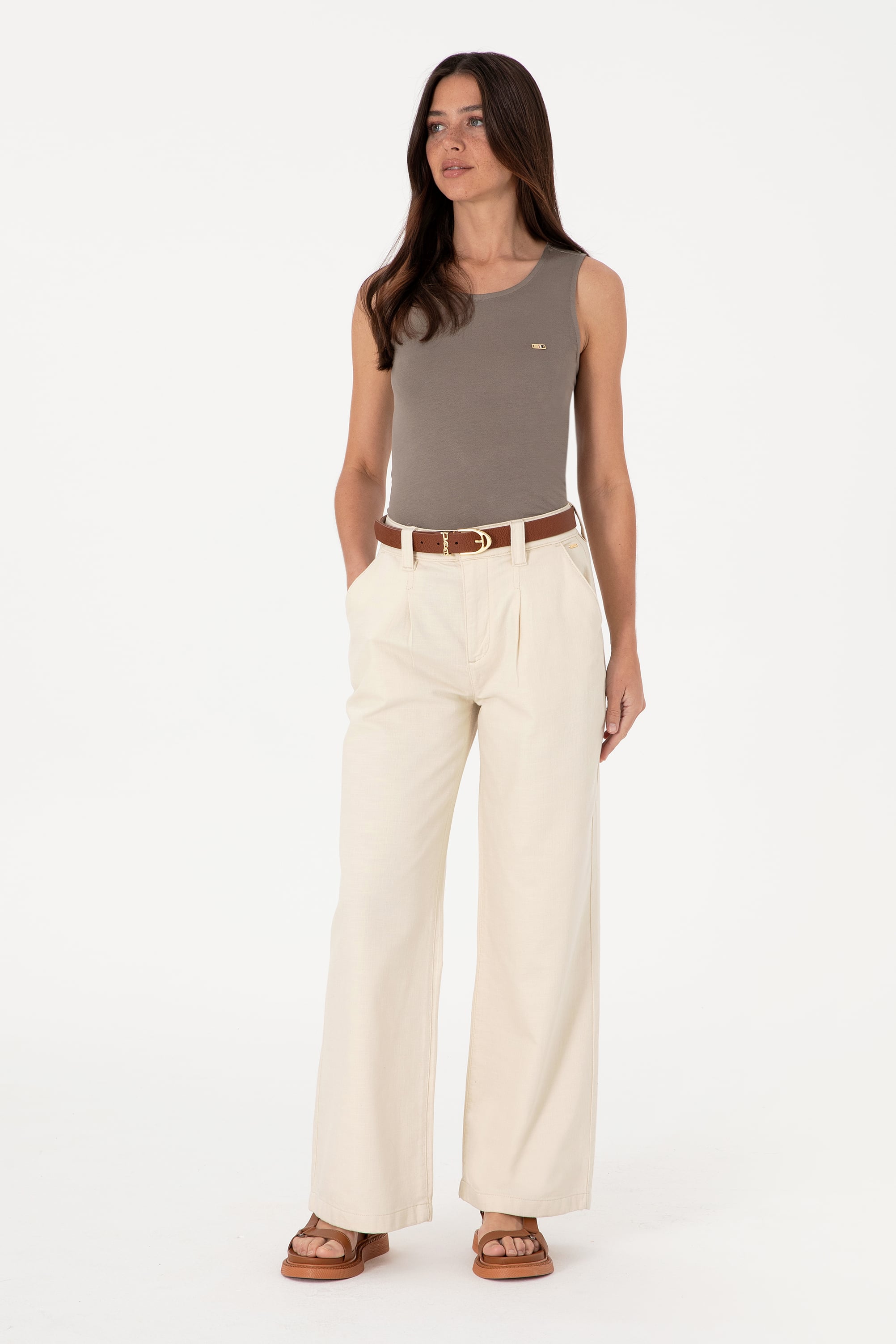 - Kadın Ekru Loose Fit Kanvas Pantolon