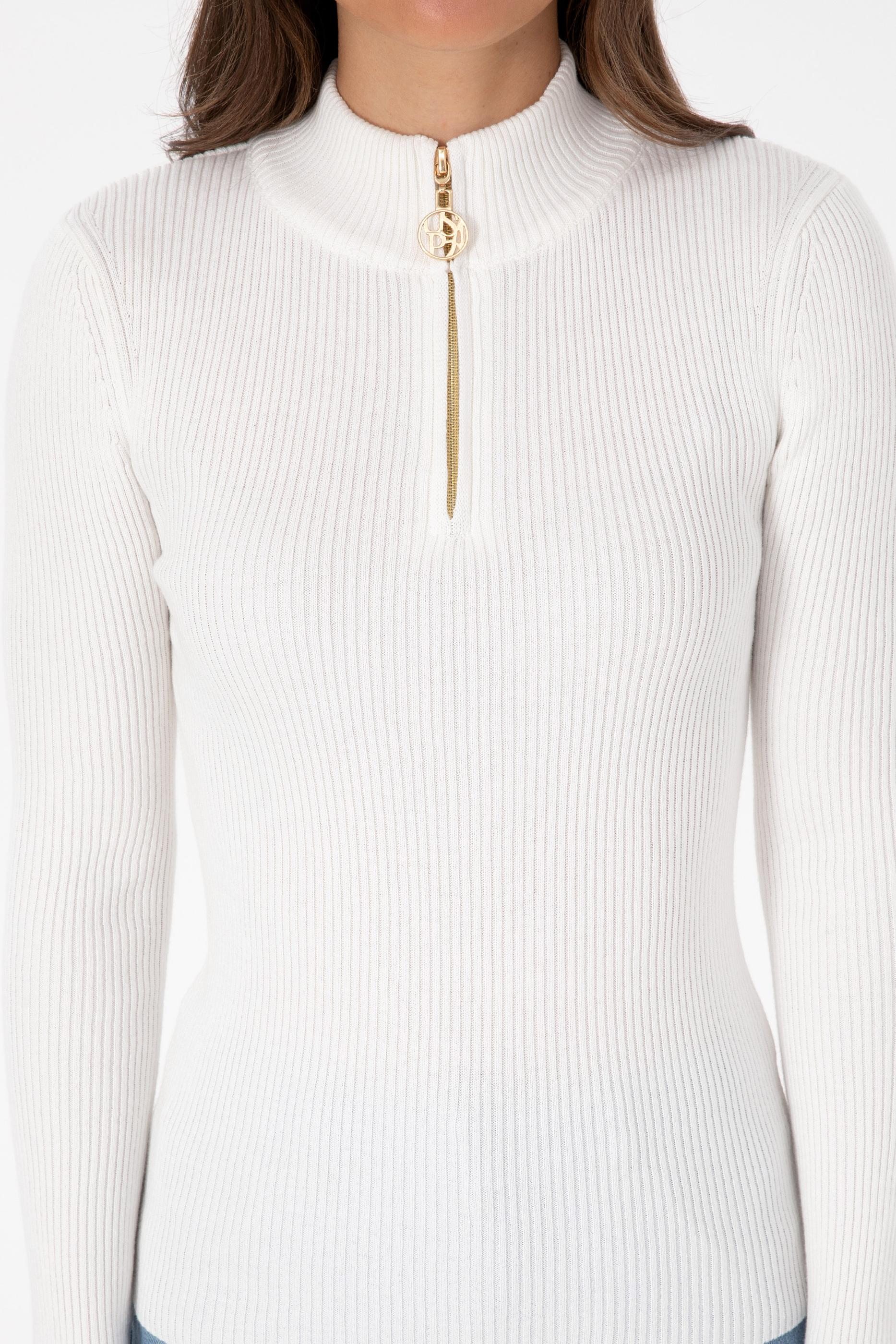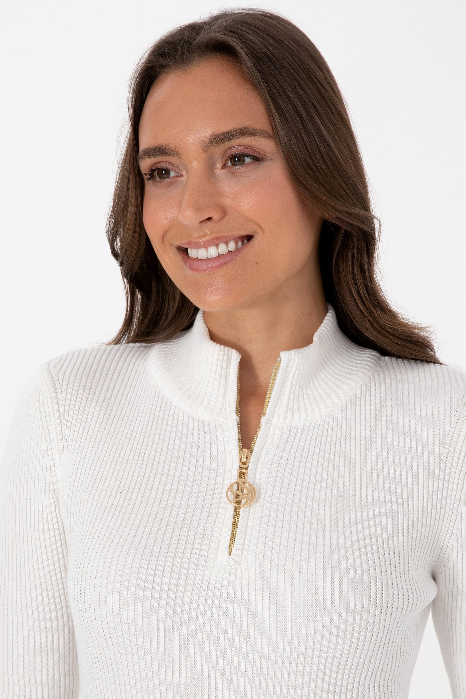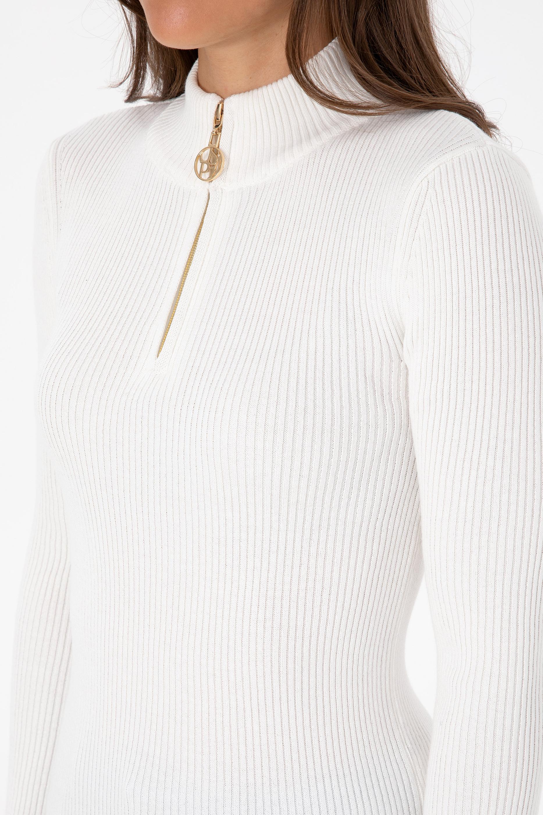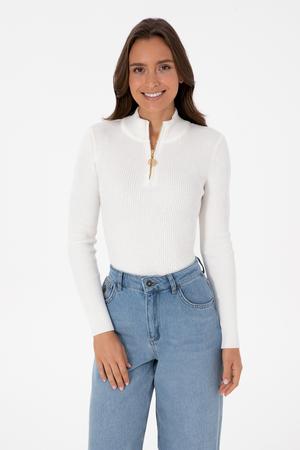Kadın Ekru V Yaka Fermuarlı Kazak