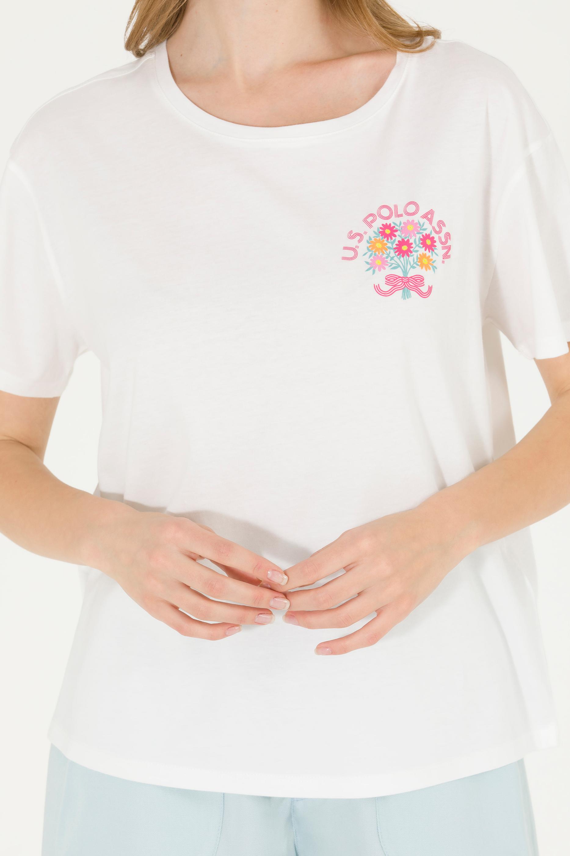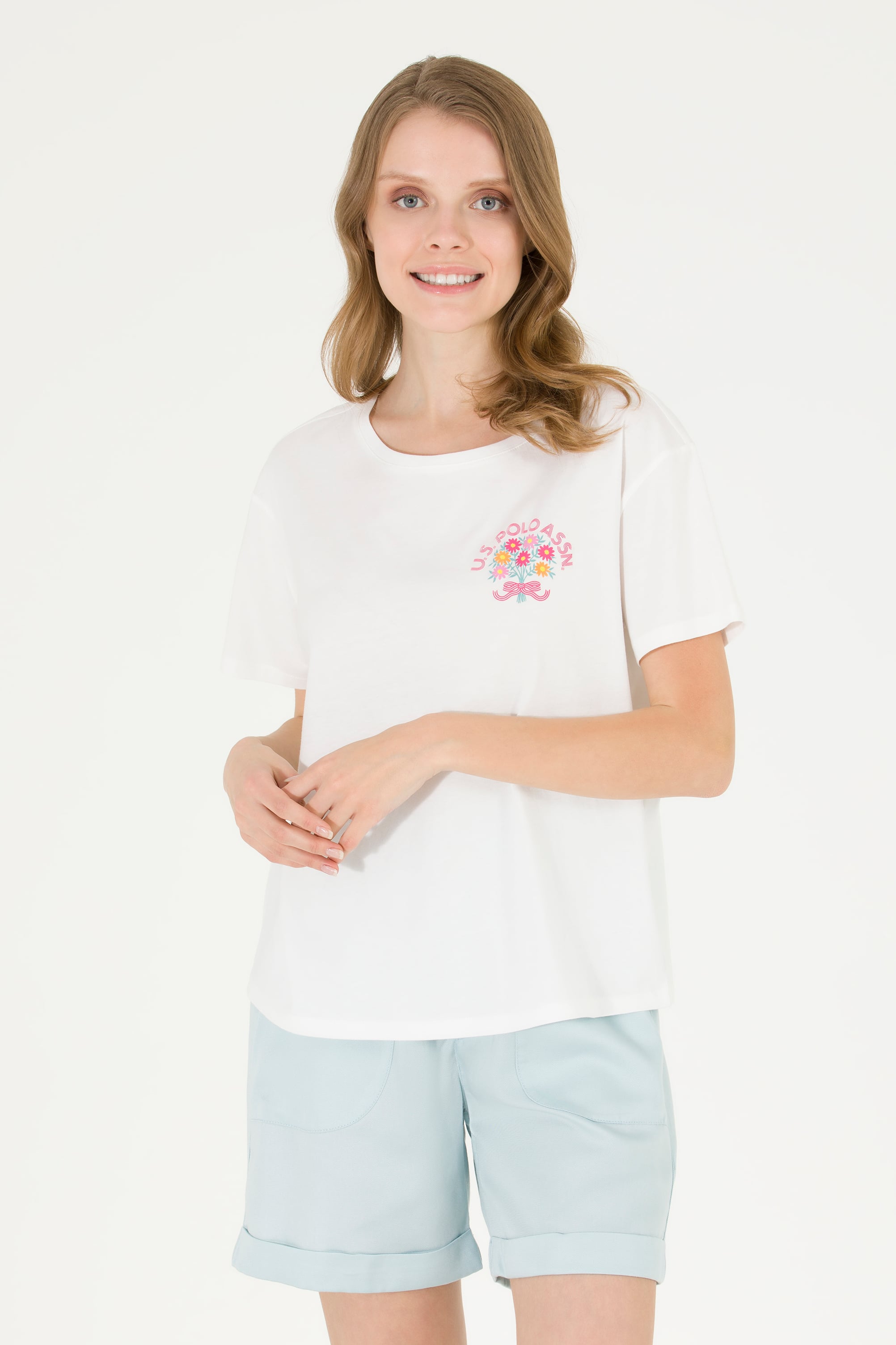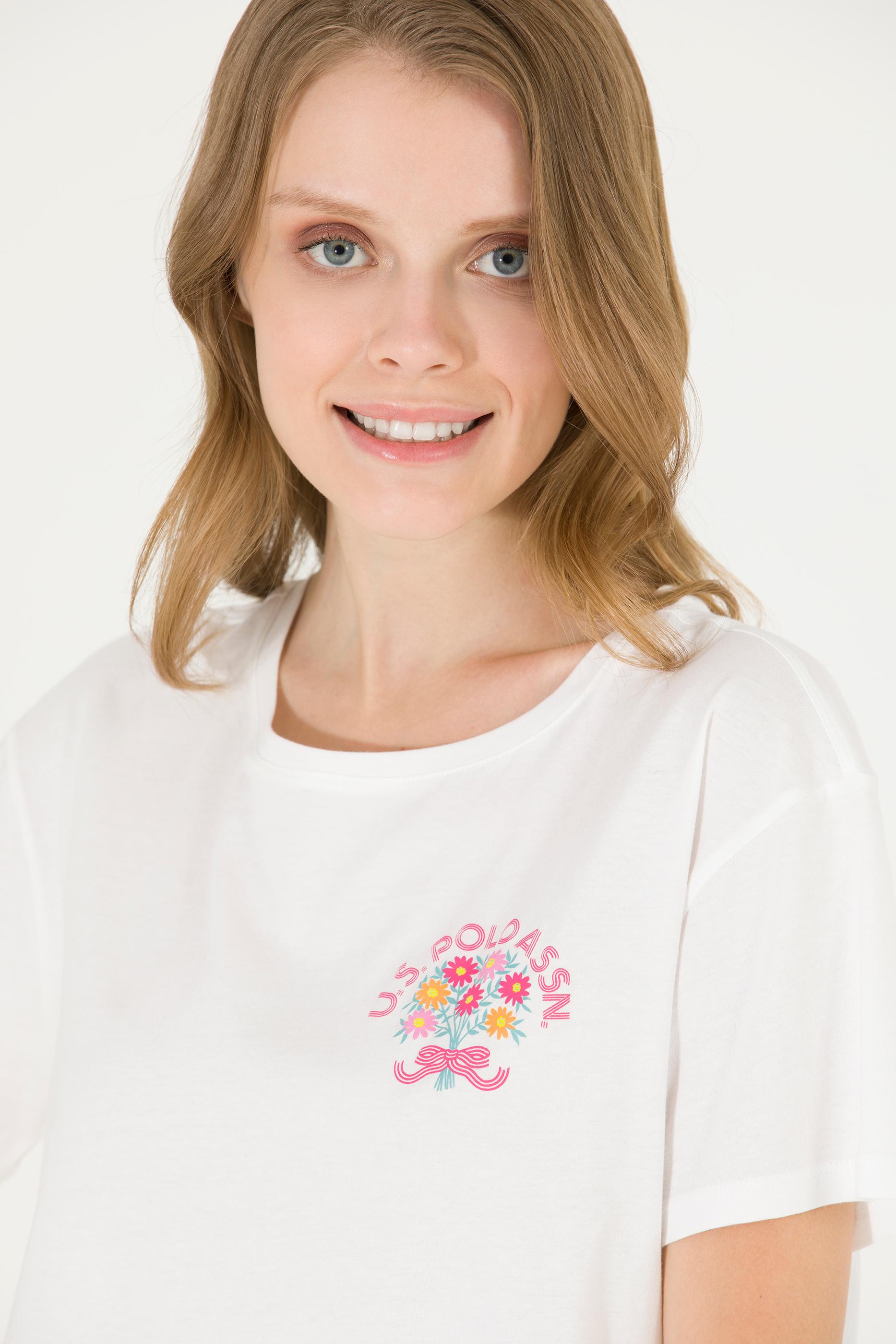 Su yeşili tişört kadınların yaz günlerine enerji katarken, bisiklet yaka tişört tasarımıyla da gün boyu ferah hissettiriyor. Yazlık tişört arayan bayanlar için ideal bir seçenek olup %100 pamuk kullanıldığından dolayı cilt dostudur. Comfort kalıp tişört olması sayesinde vücudu sıkıştırmadan geniş bir hareket özgürlüğü sunuyor. Online alışverişe özel bu kadın tişörtüne hemen sahip olun çiçek desenli USPA baskısıyla farkınızı yansıtın.