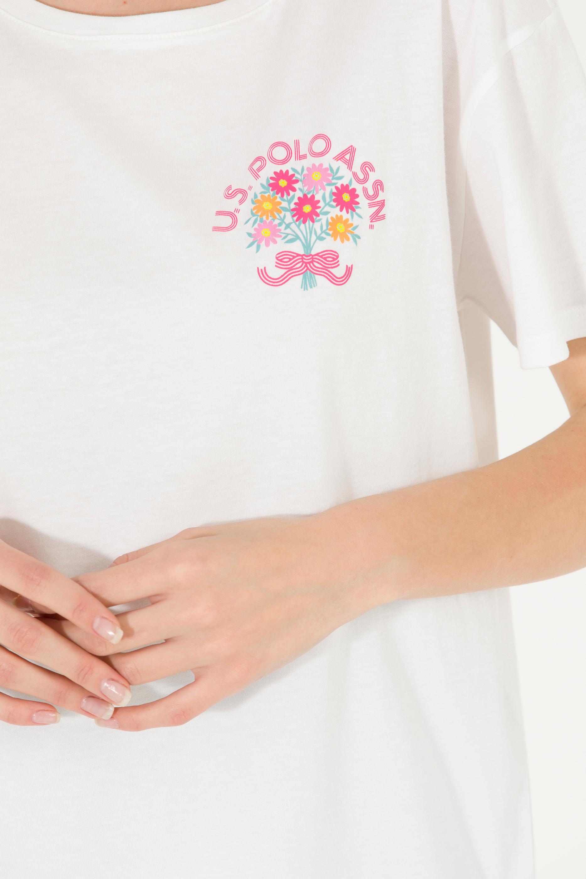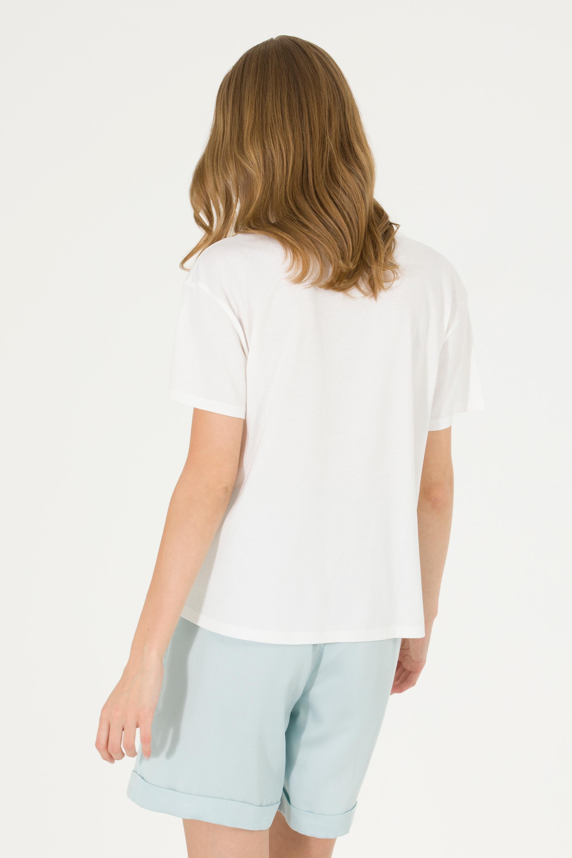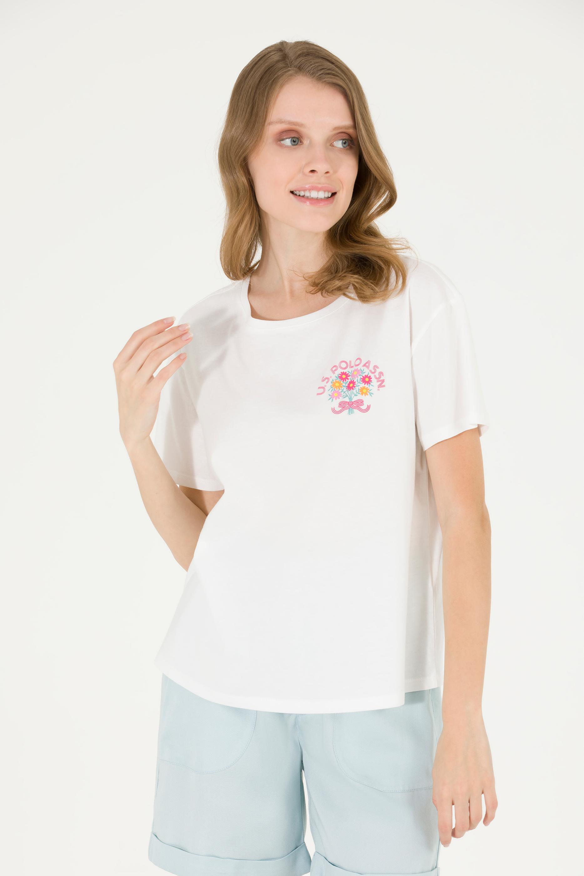 Su yeşili tişört kadınların yaz günlerine enerji katarken, bisiklet yaka tişört tasarımıyla da gün boyu ferah hissettiriyor. Yazlık tişört arayan bayanlar için ideal bir seçenek olup %100 pamuk kullanıldığından dolayı cilt dostudur. Comfort kalıp tişört olması sayesinde vücudu sıkıştırmadan geniş bir hareket özgürlüğü sunuyor. Online alışverişe özel bu kadın tişörtüne hemen sahip olun çiçek desenli USPA baskısıyla farkınızı yansıtın.