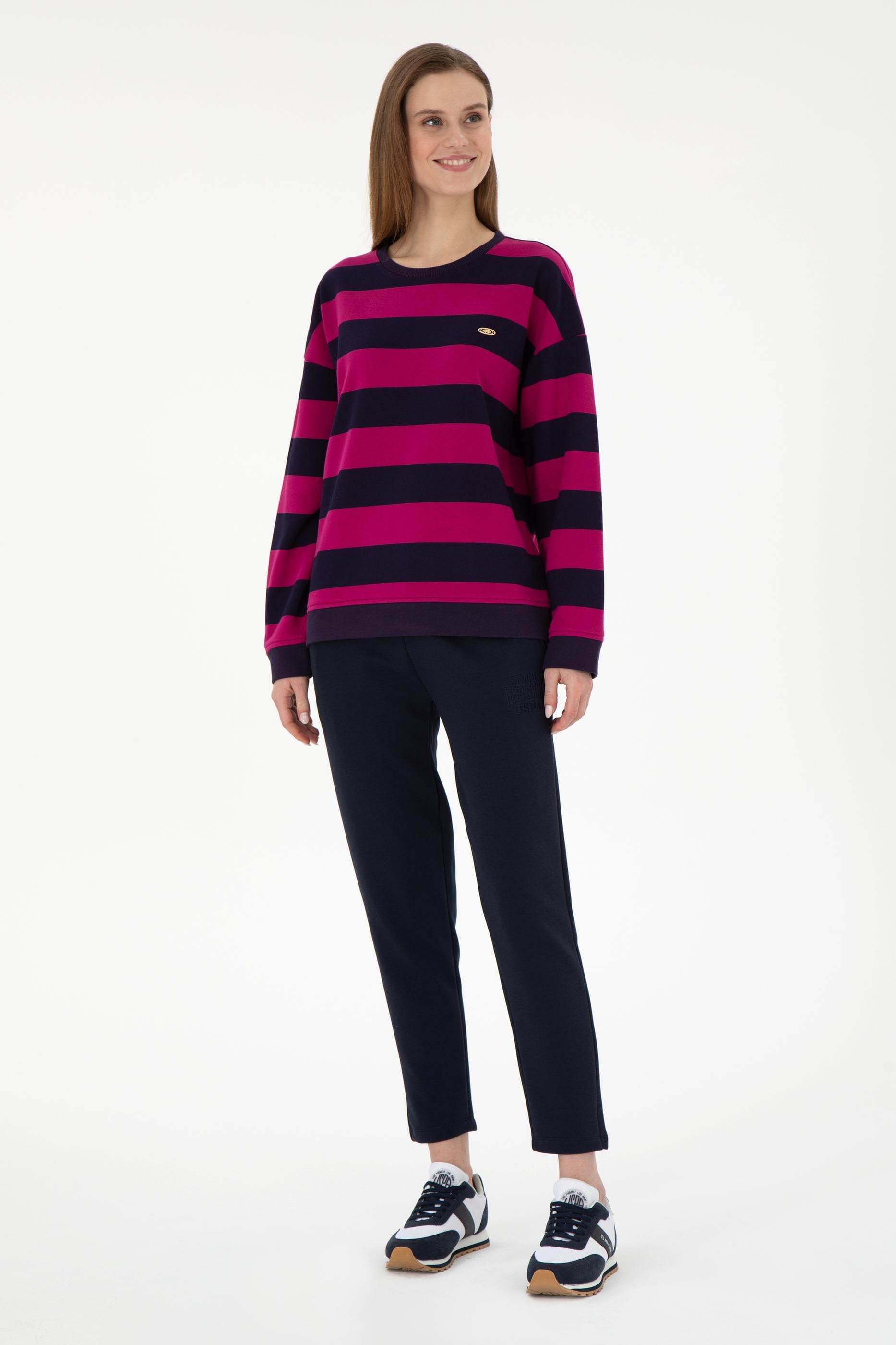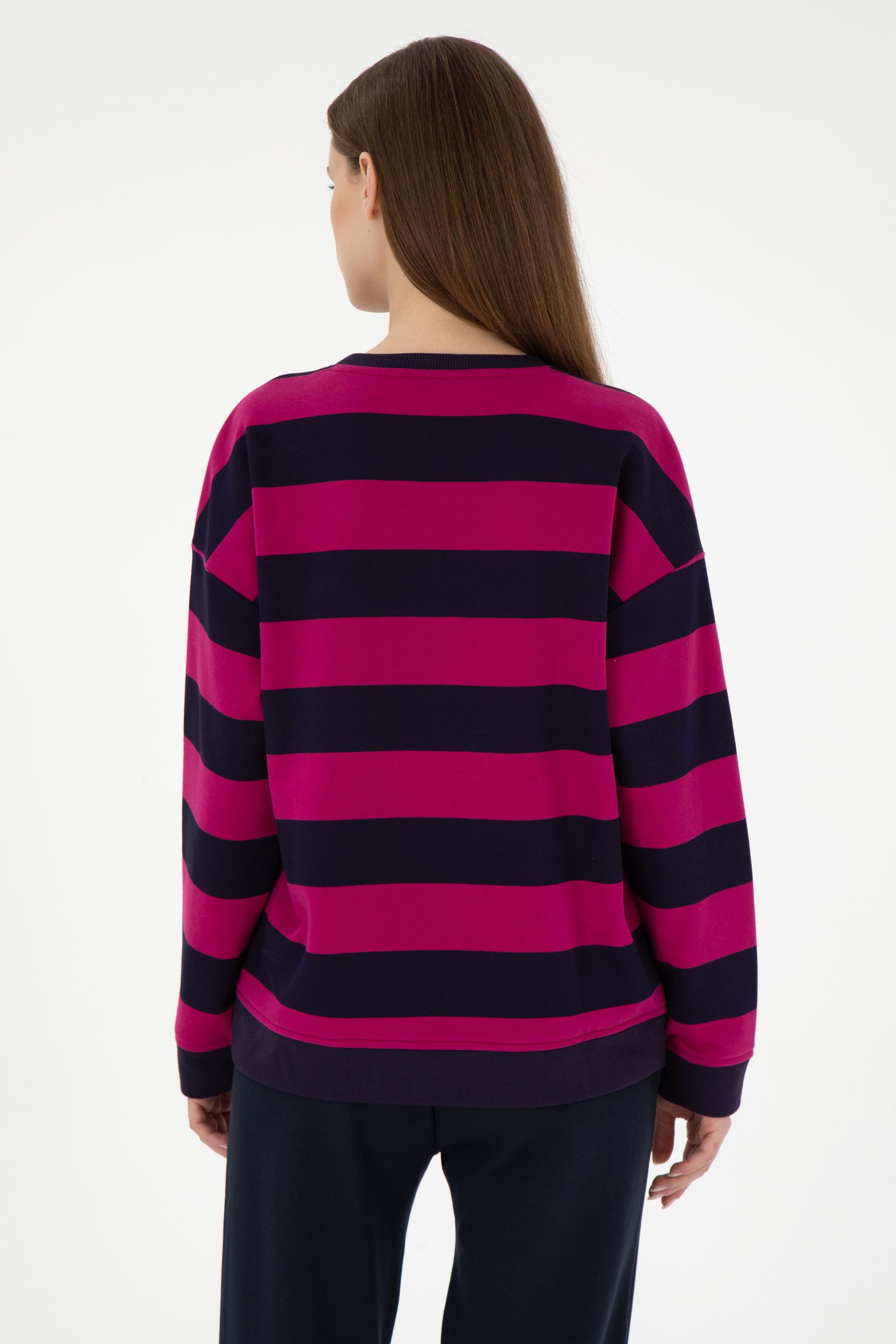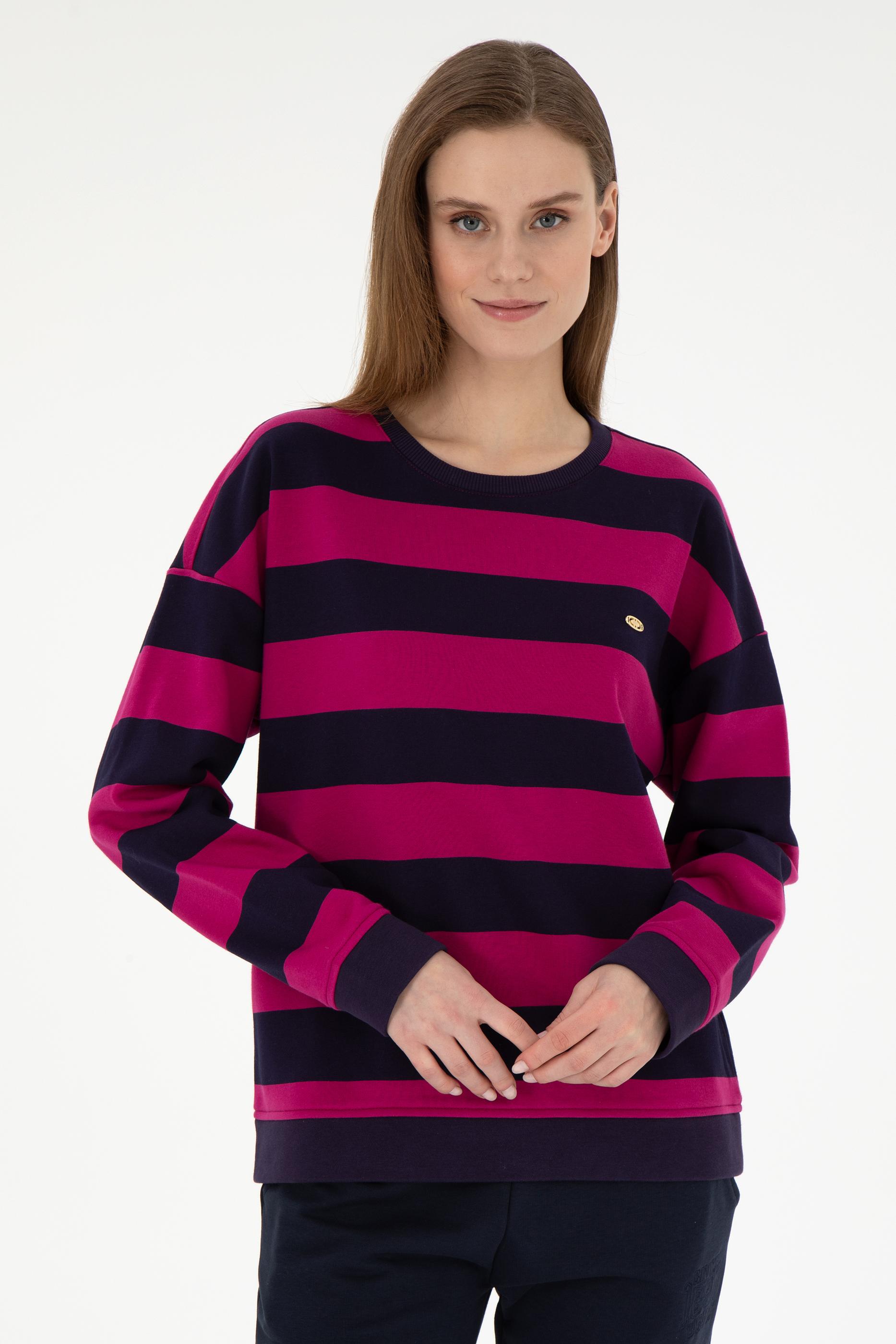 Kadın Fuşya Çizgili Bisiklet Yaka Sweatshırt