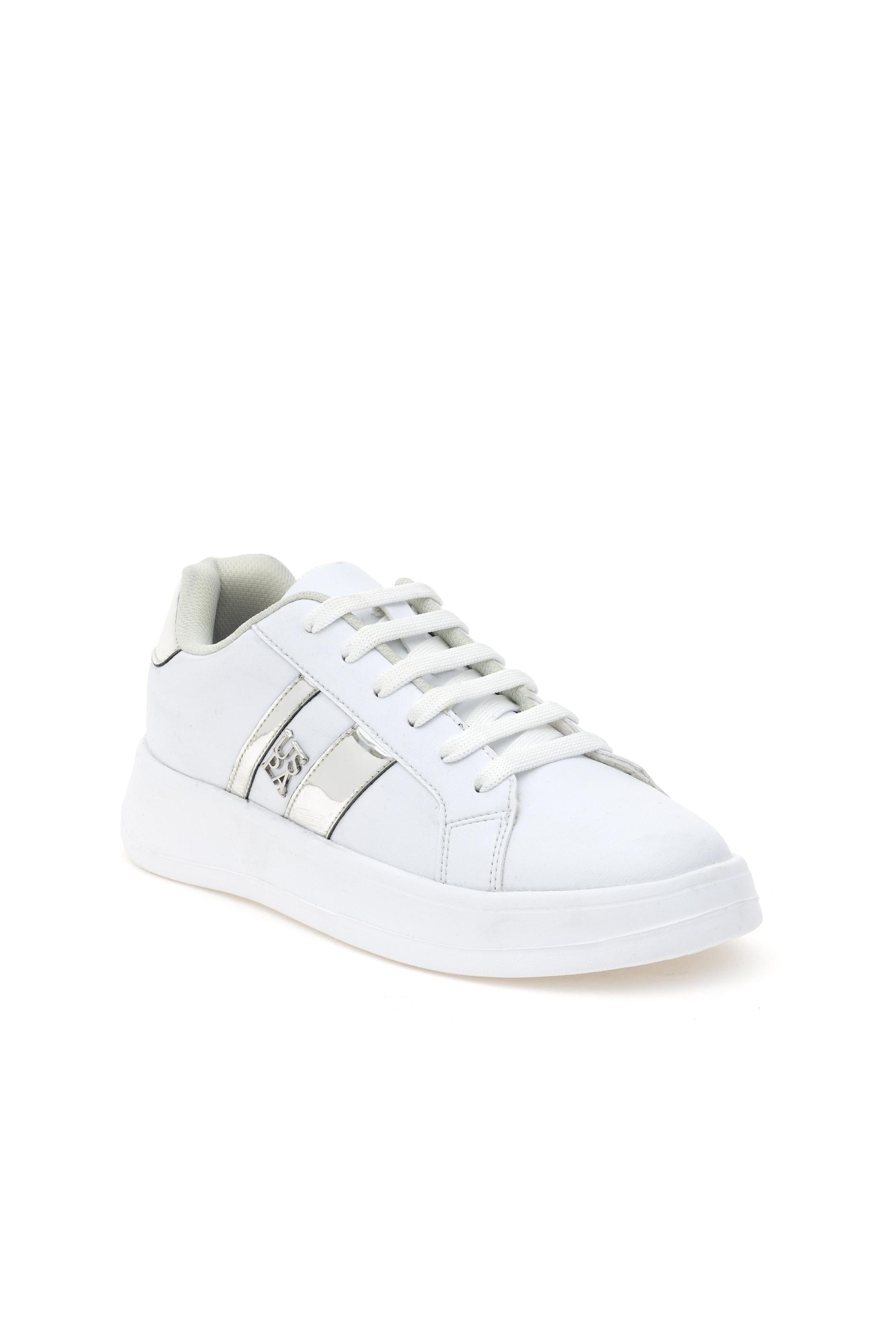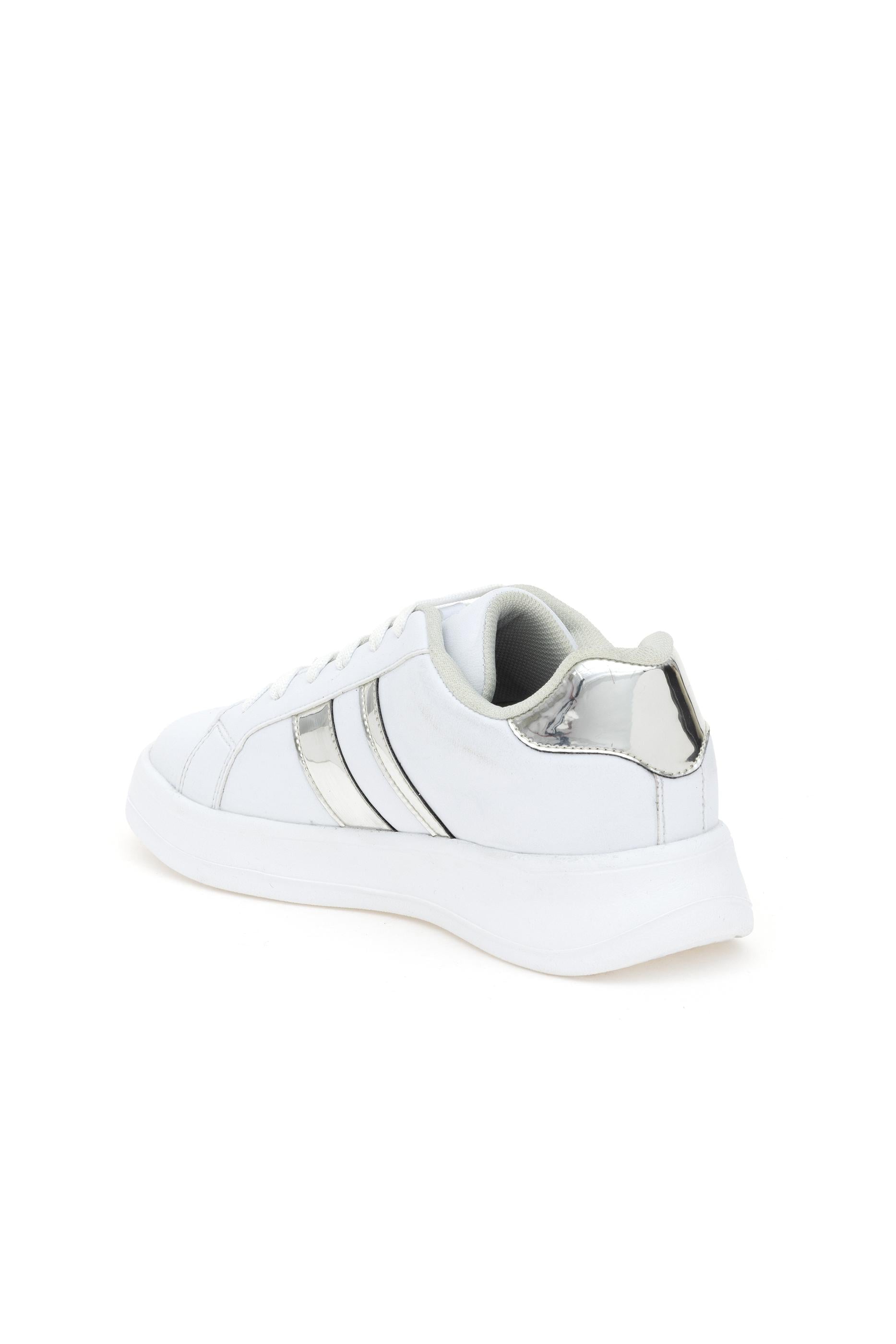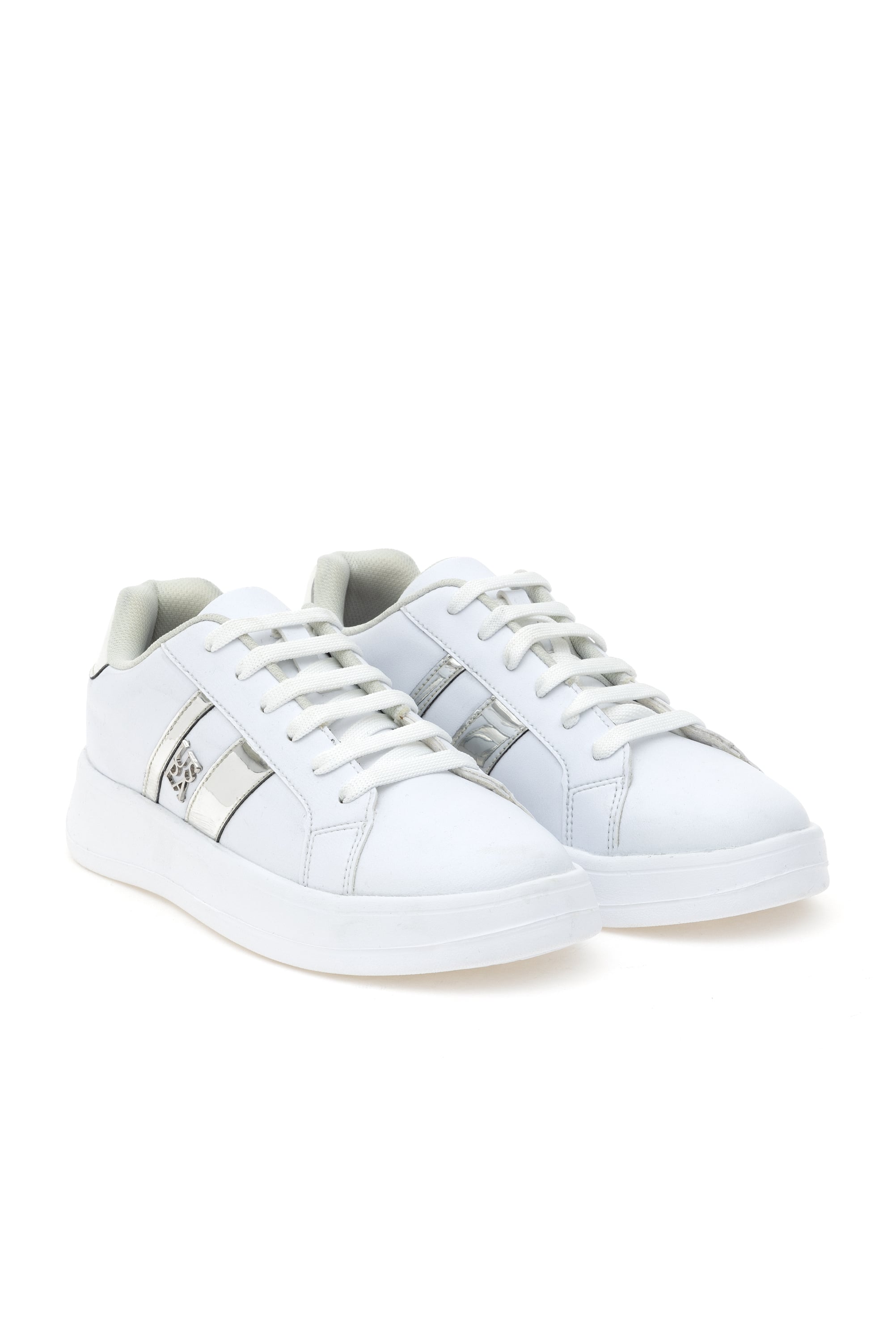 Hafifliği ve şık detaylarıyla dikkat çeken kadın sneaker, beyaz ve gümüş renk uyumuyla zarif bir görünüm sunar. Günlük kullanımda rahatlık sağlarken, modern tasarımıyla stil sahibi bir duruş kazandırır. Sneaker, yumuşak dokulu üst yüzeyiyle ayağı nazikçe sararak konforlu bir deneyim sunar. Deri görünümlü materyali, dayanıklılığı artırırken pürüzsüz bir his bırakır. Bağcıklı yapısı sayesinde ayağa tam uyum sağlayarak destekleyici bir yapı sunar. Yan kısımlarda yer alan gümüş rengi şerit detayları, modeli hareketlendirerek dinamik bir tarz oluşturur. Aynı zamanda küçük metal logo detayı, tasarıma şık bir dokunuş ekler. Taban kısmı, yürüyüş sırasında dengeyi koruyan hafif ve esnek bir yapıya sahiptir. Kalın ve yumuşak orta taban, ayağı yormadan uzun süreli konfor sunar. Beyaz renkli dış tabanı, zemin tutuşunu artıran özel bir malzemeyle üretilerek güvenli bir kullanım sağlar. İç astarı ise nefes alabilen bir yapıya sahip olup, gün boyu ferahlık hissi sunar. Gümüş rengi detaylarla hareketlendirilen sneaker modeli, sade ama etkileyici bir tarz arayanlar için ideal bir seçenek sunar. Günlük kombinlerden sportif şıklığa kadar geniş bir kullanım alanına uyum sağlayarak, her adımda konfor ve estetik bir denge oluşturur.