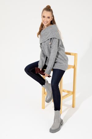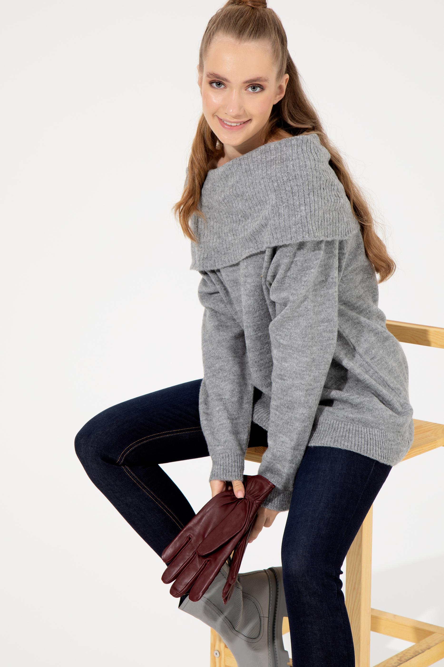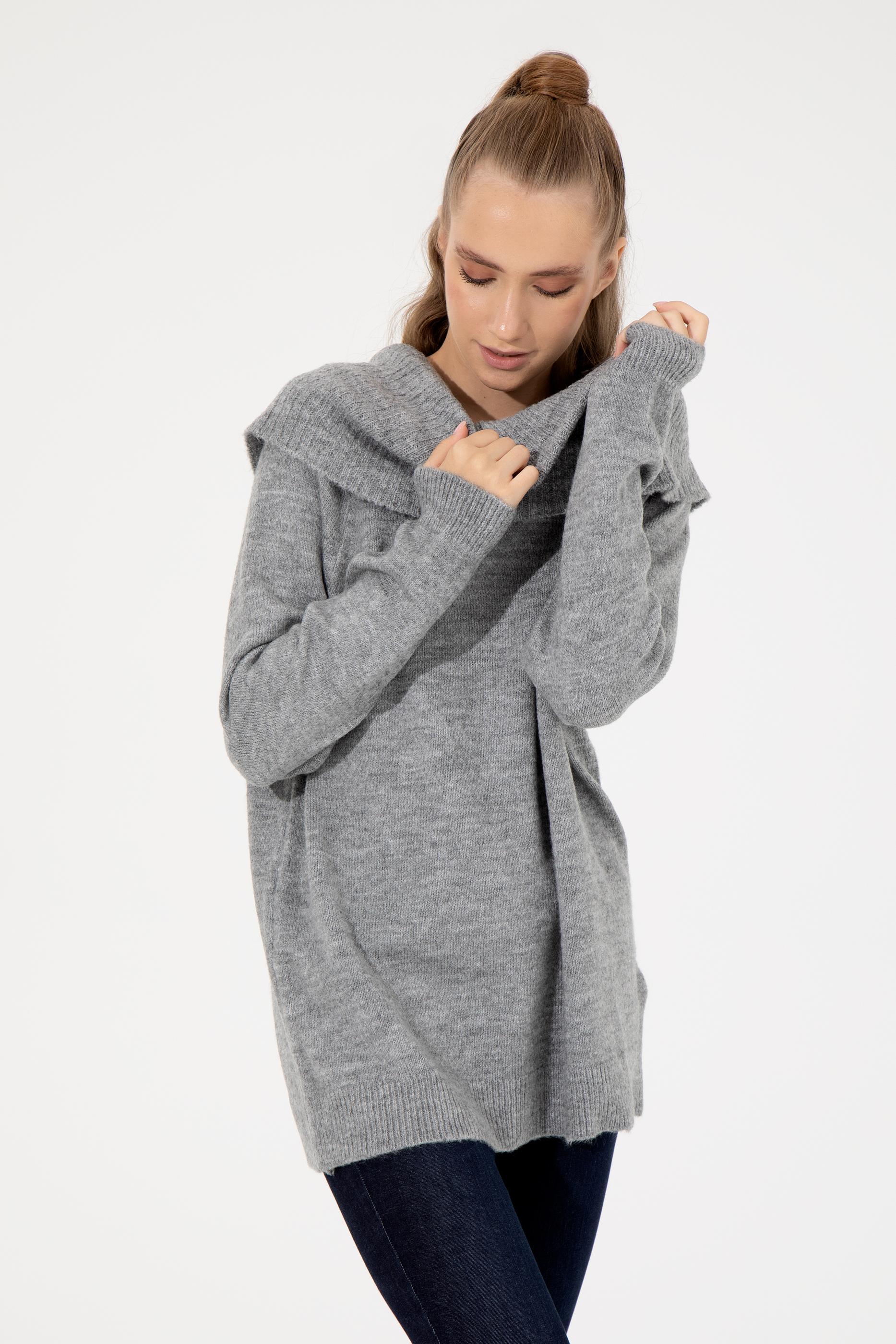 Kadın Gri Melanj Bisiklet Yaka Kazak