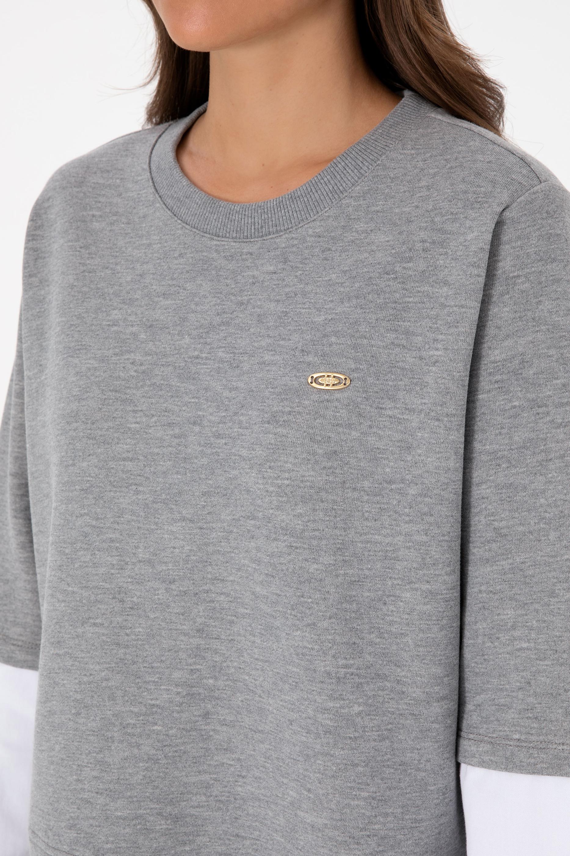 Kadın Gri Melanj Gömlek Detaylı Bisiklet Yaka Sweatshirt
