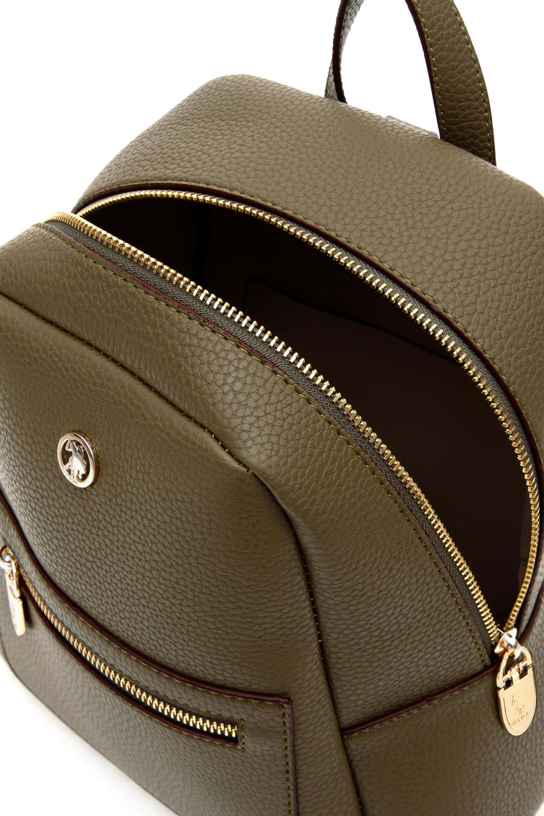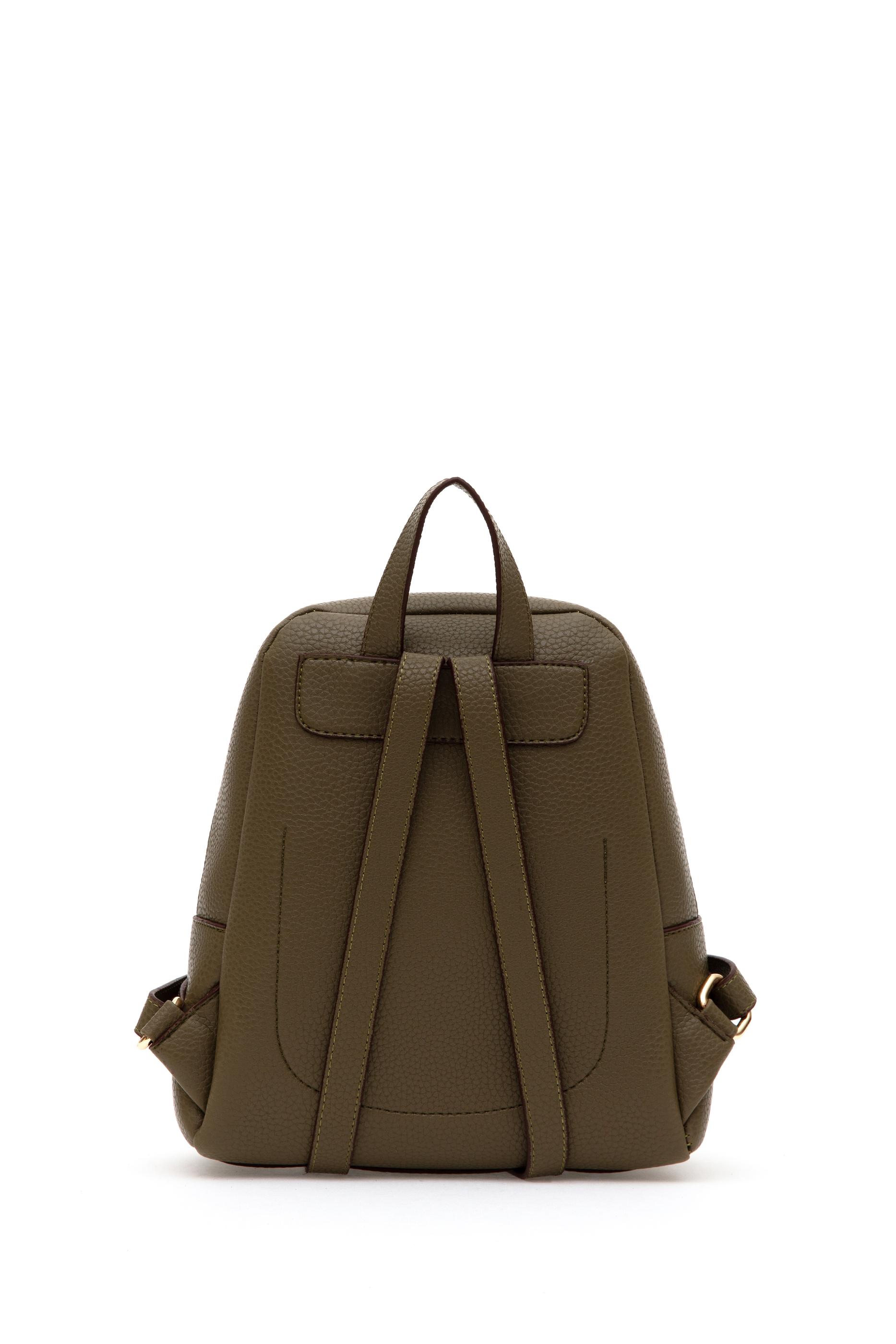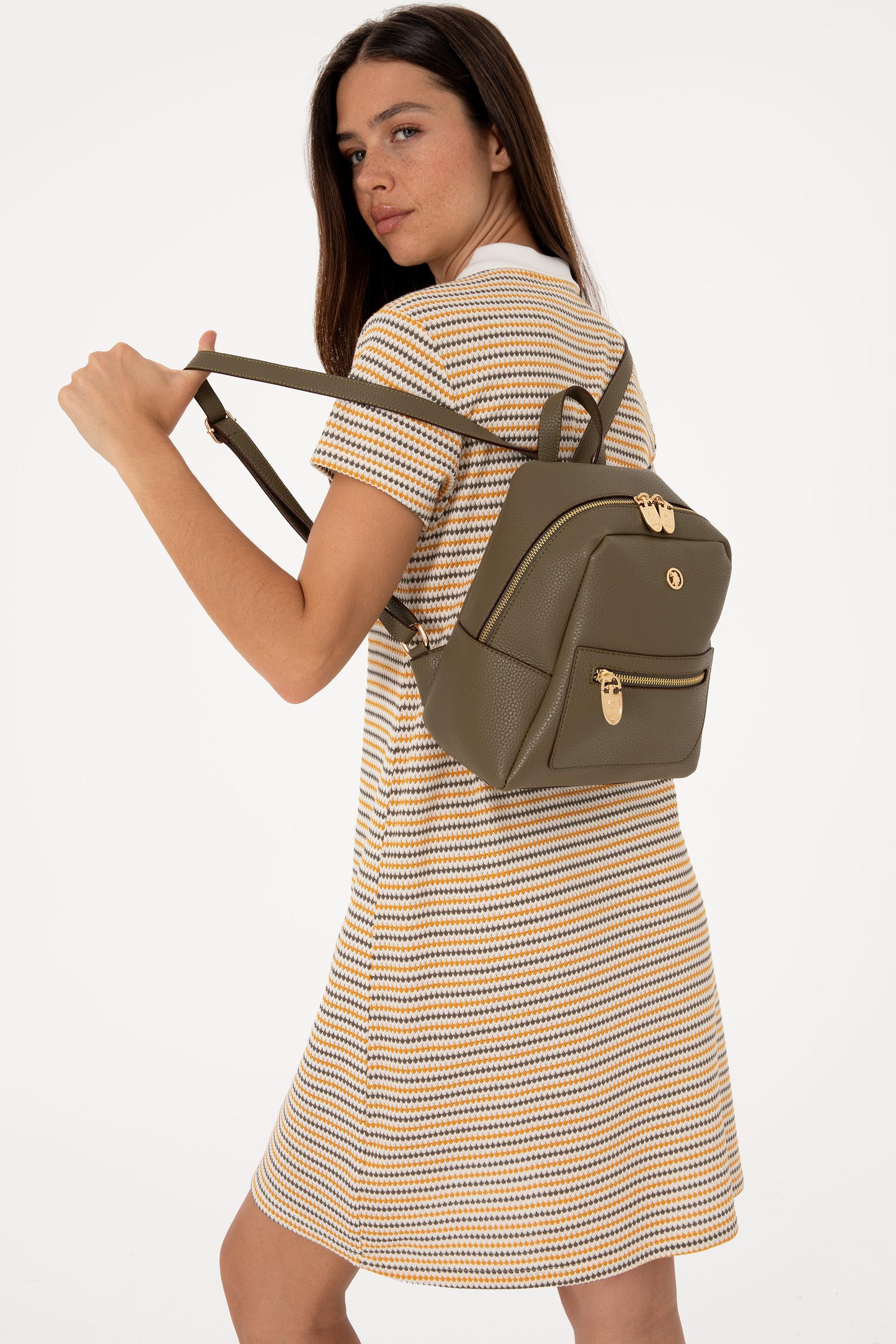 Yapılandırılmış formu ve pütürlü dokulu yüzeyiyle dikkat çeken bu haki sırt çantası, gold fermuar detaylarıyla sportif şıklığı zarif bir çizgiyle buluşturuyor. Üst kısmı hafif kavisli olan model, çift fermuarlı ana bölmesi ve öndeki ekstra fermuarlı gözüyle eşyaları düzenli taşıma imkânı sunar. Ayarlanabilir omuz askıları yumuşak yapısıyla konfor sağlarken, arkada dikey tutma sapı alternatif taşıma şekilleri sunar. Haki tonu ve işlevsel tasarımıyla şehir yaşamı, okul veya hafta sonu için ideal ve kullanışlı bir seçenektir.
