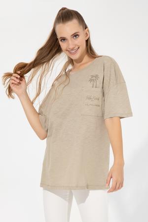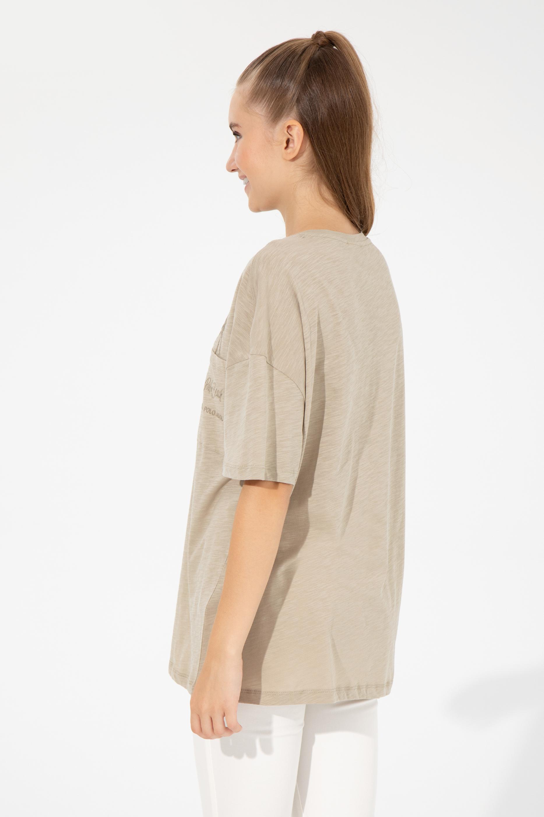 Kadın Haki Bisiklet Yaka Oversize Tişört