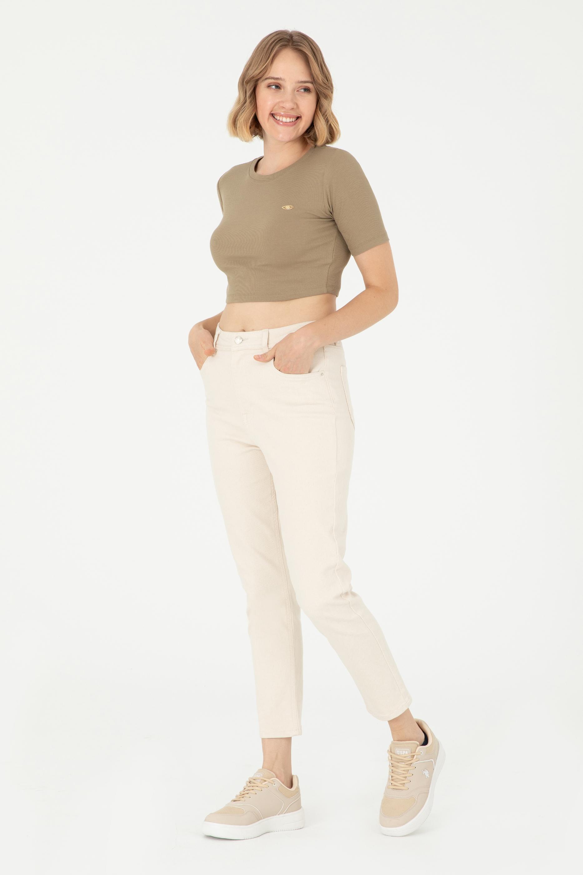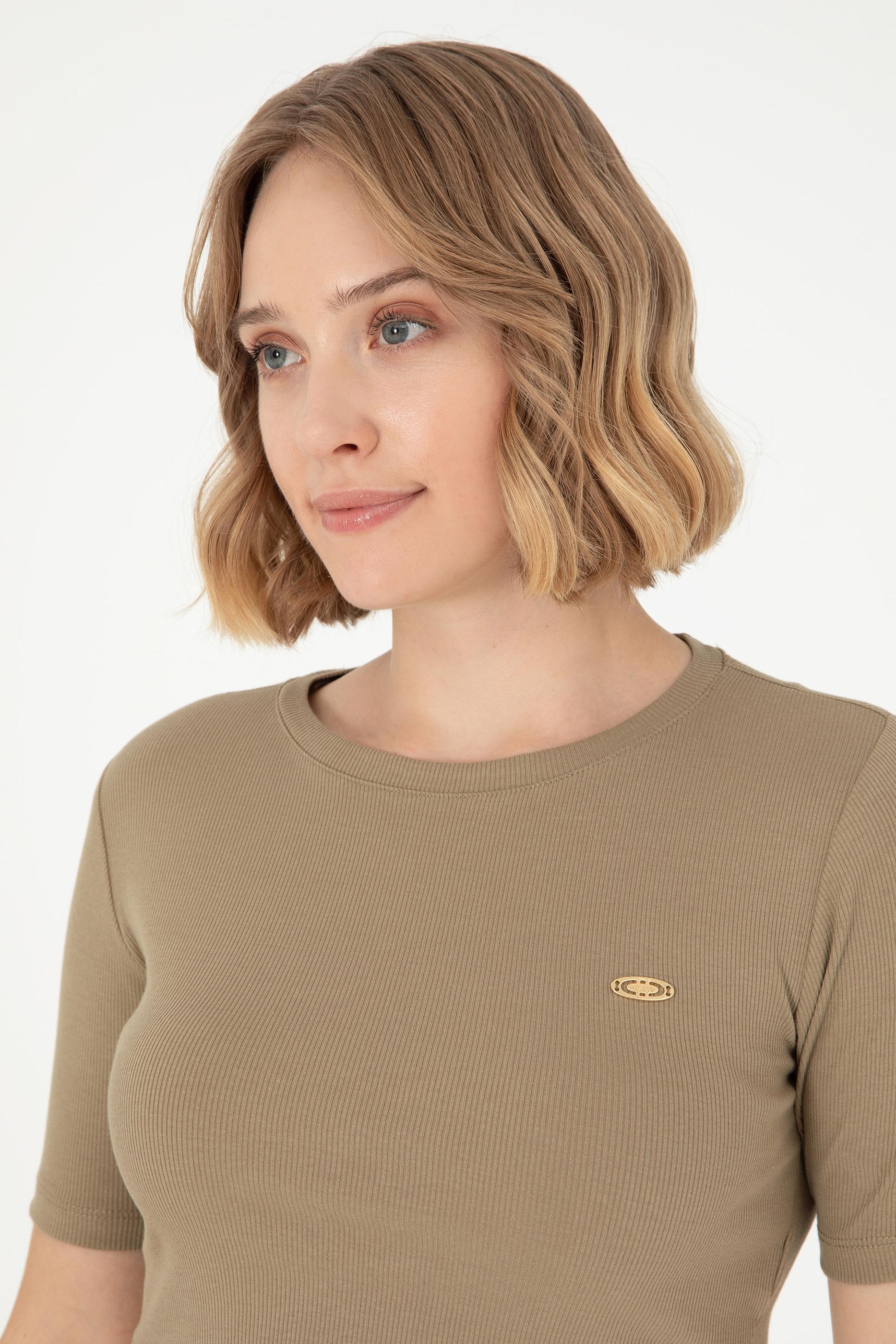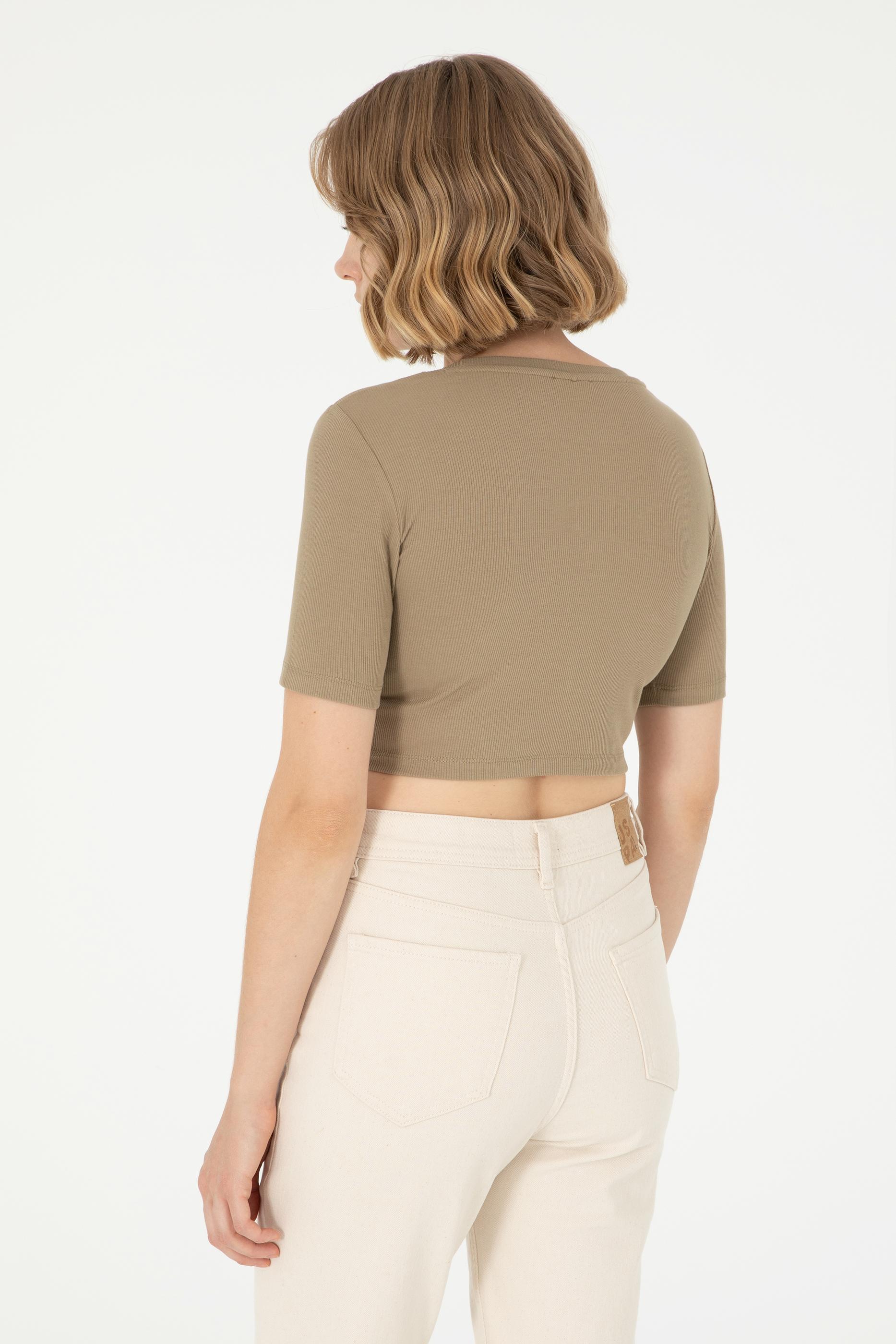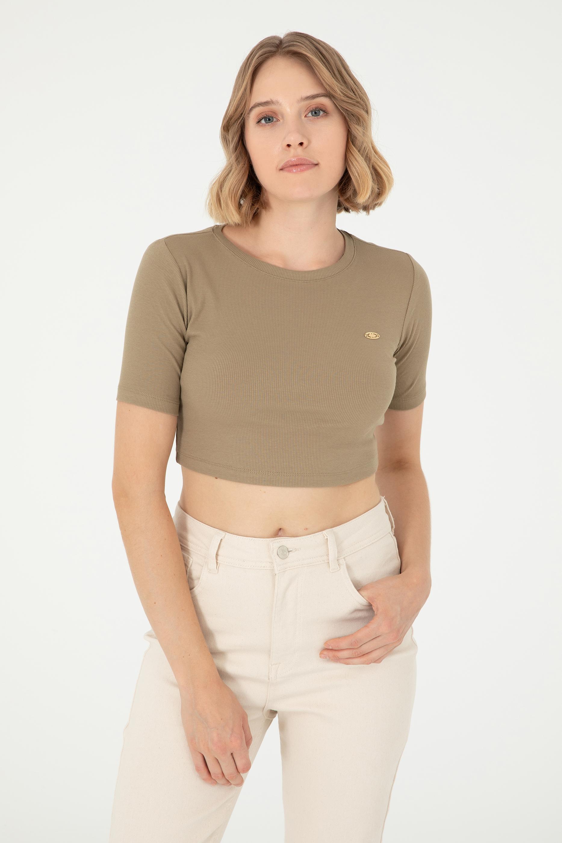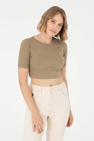 Kadın Haki Bisiklet Yaka Crop Tişört