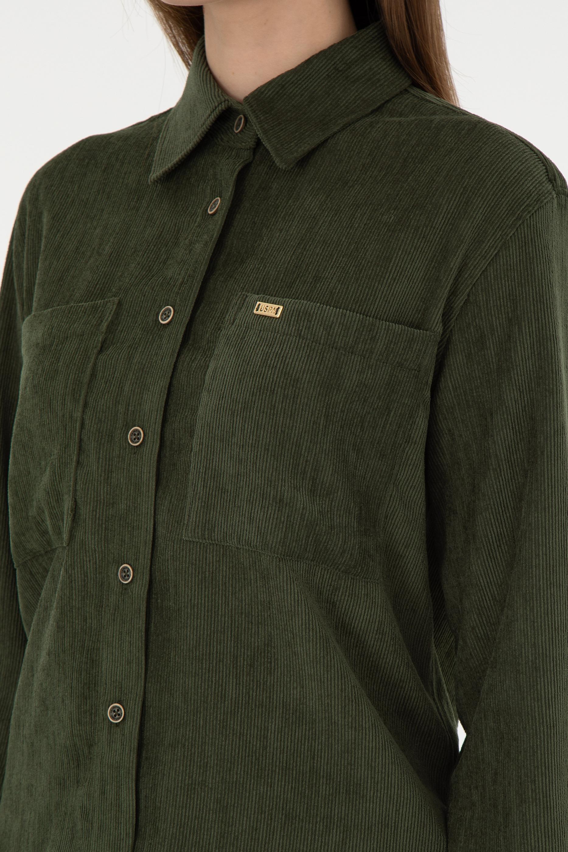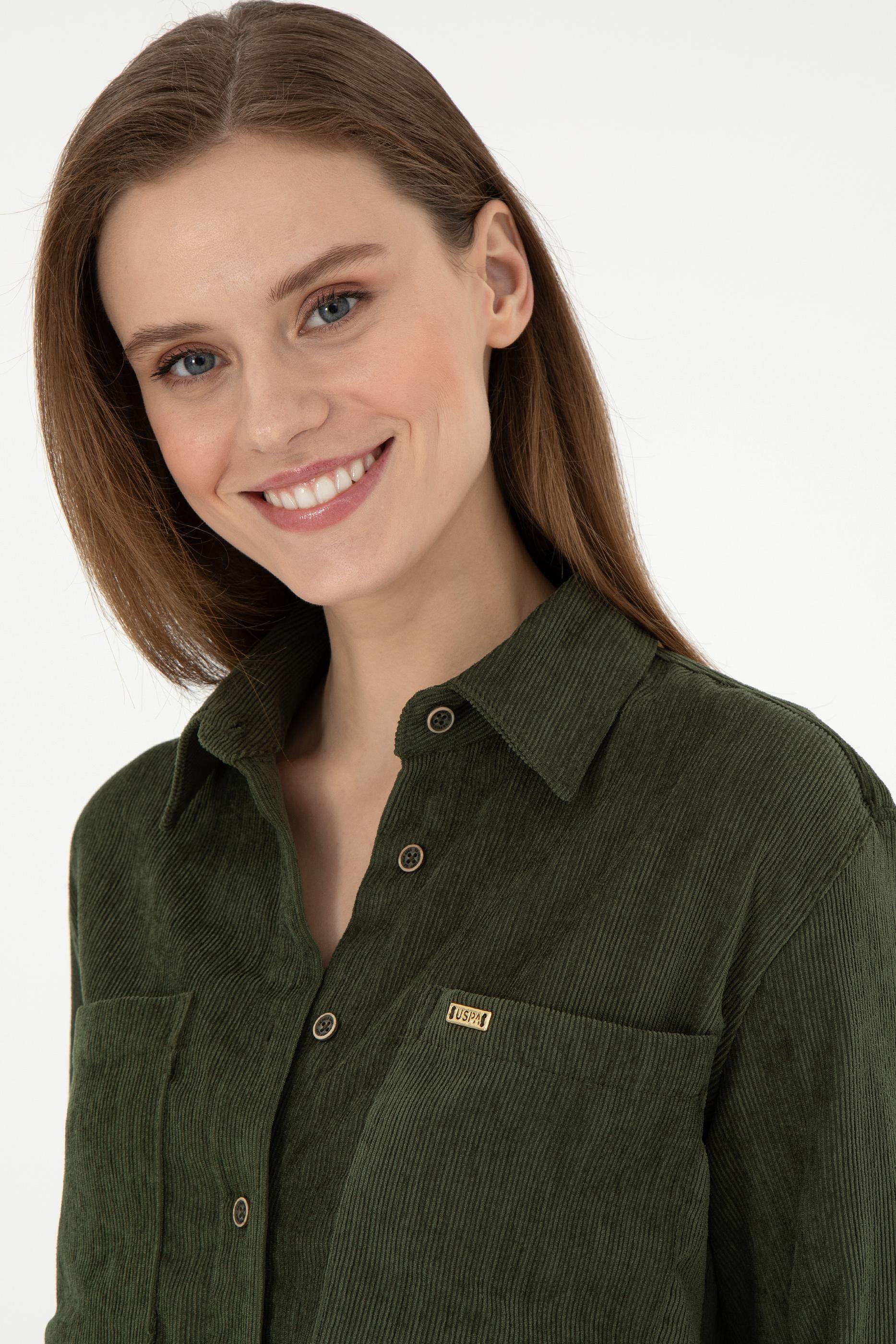 Kadın Haki Uzun Kollu Kadife Görünümlü Gömlek