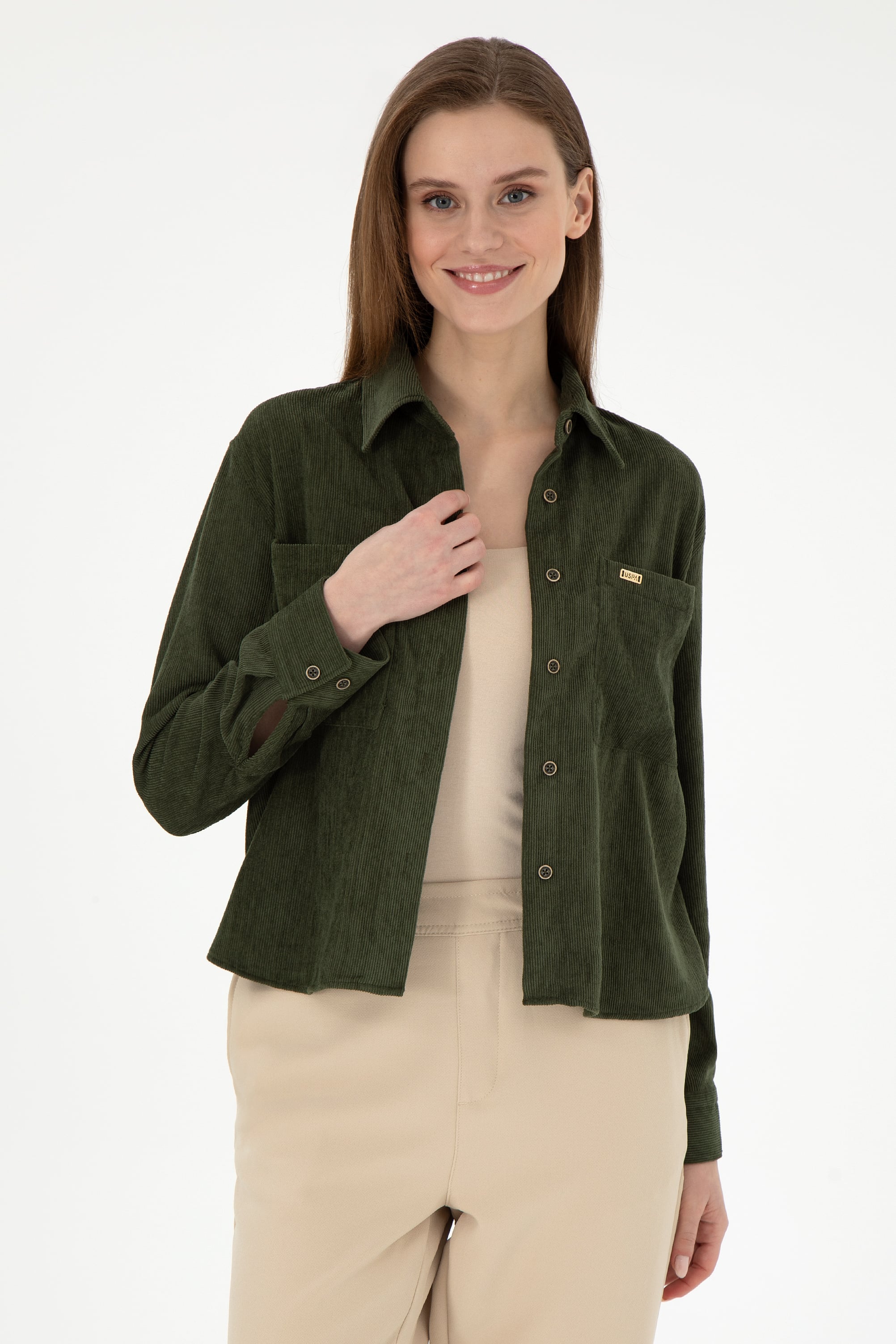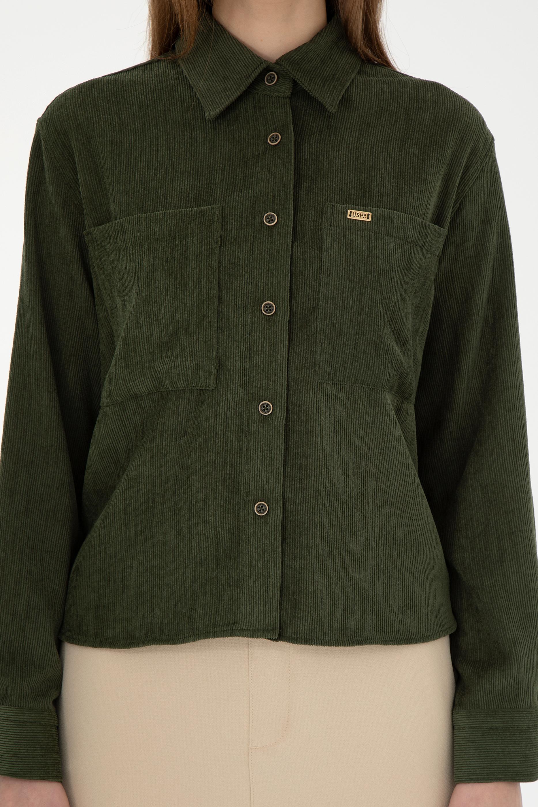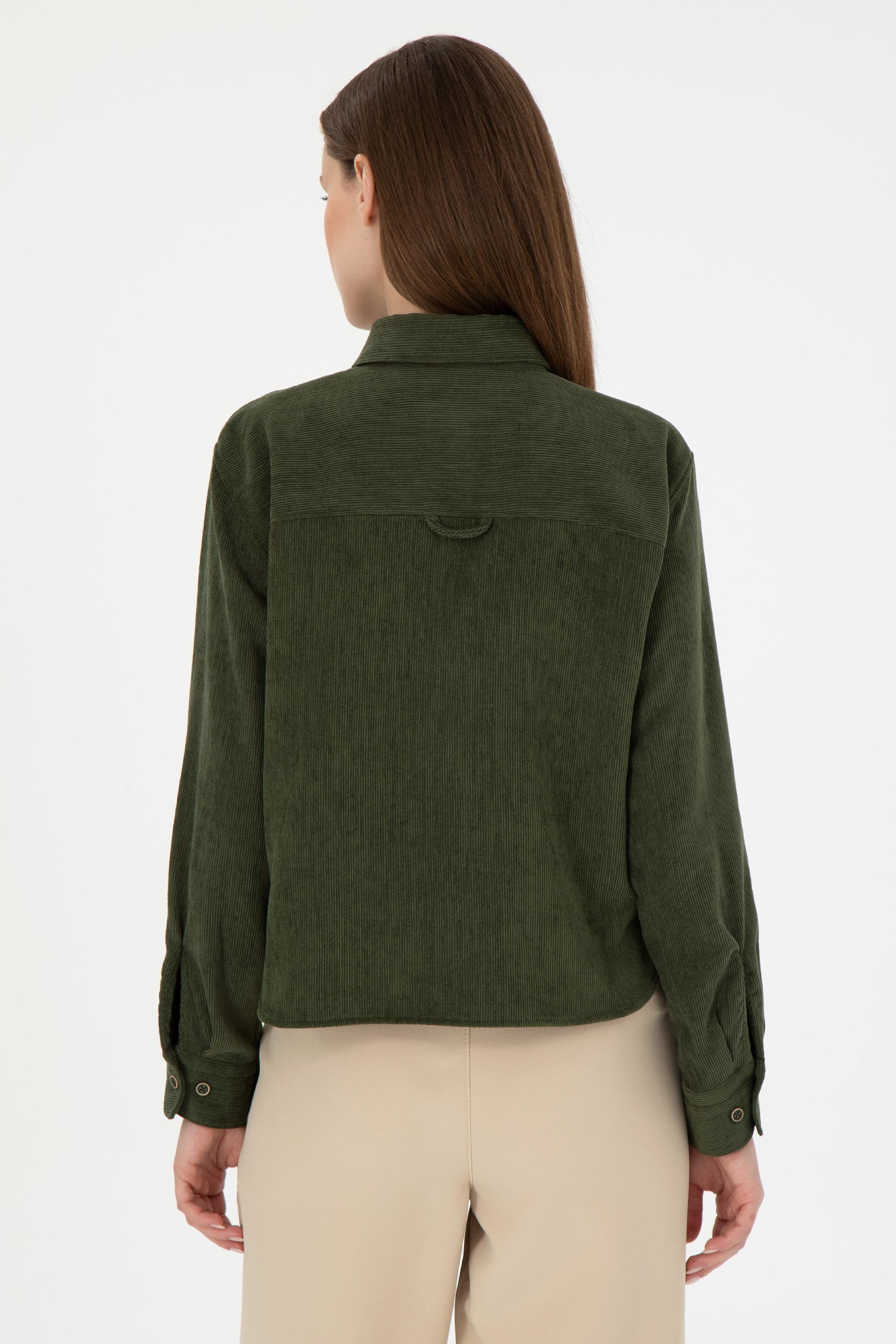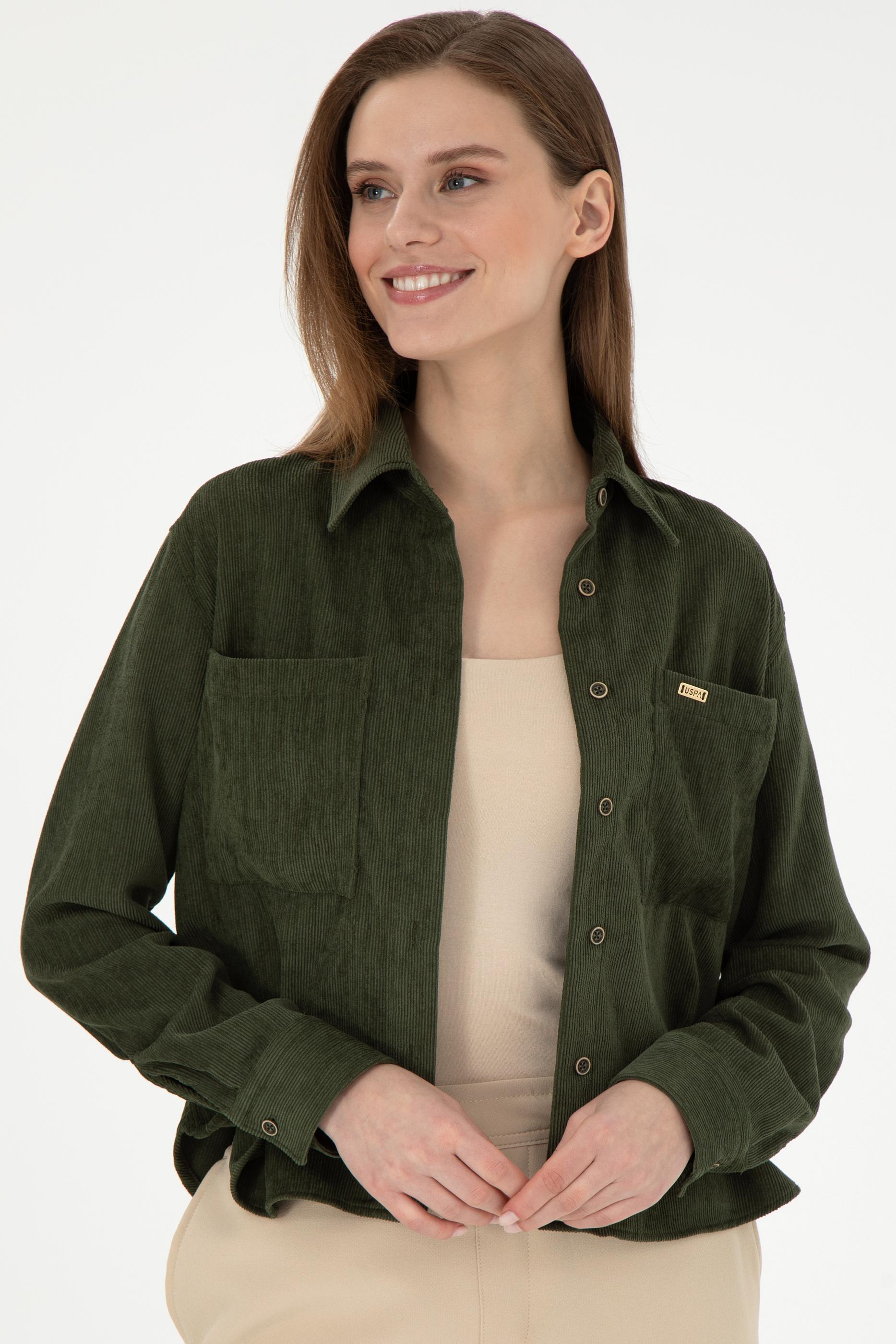 - Kadın Haki Uzun Kollu Kadife Görünümlü Gömlek