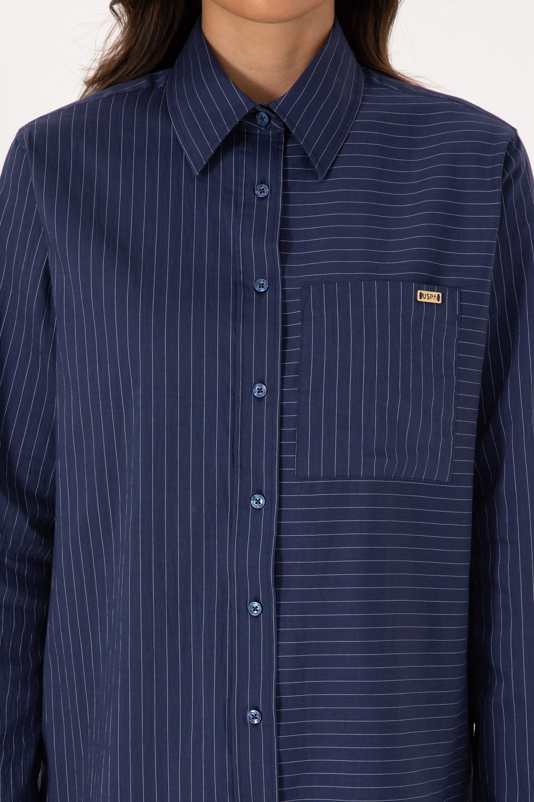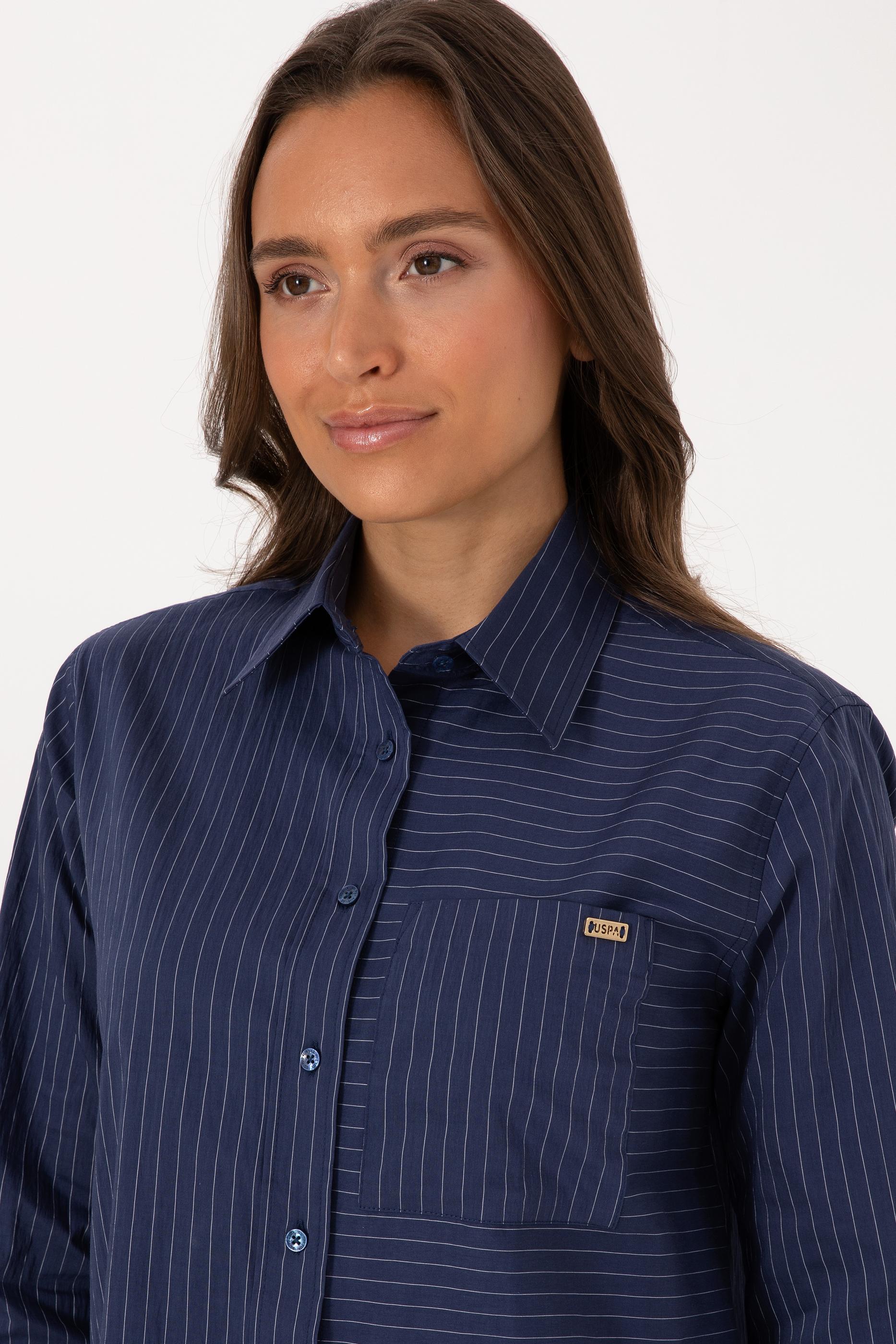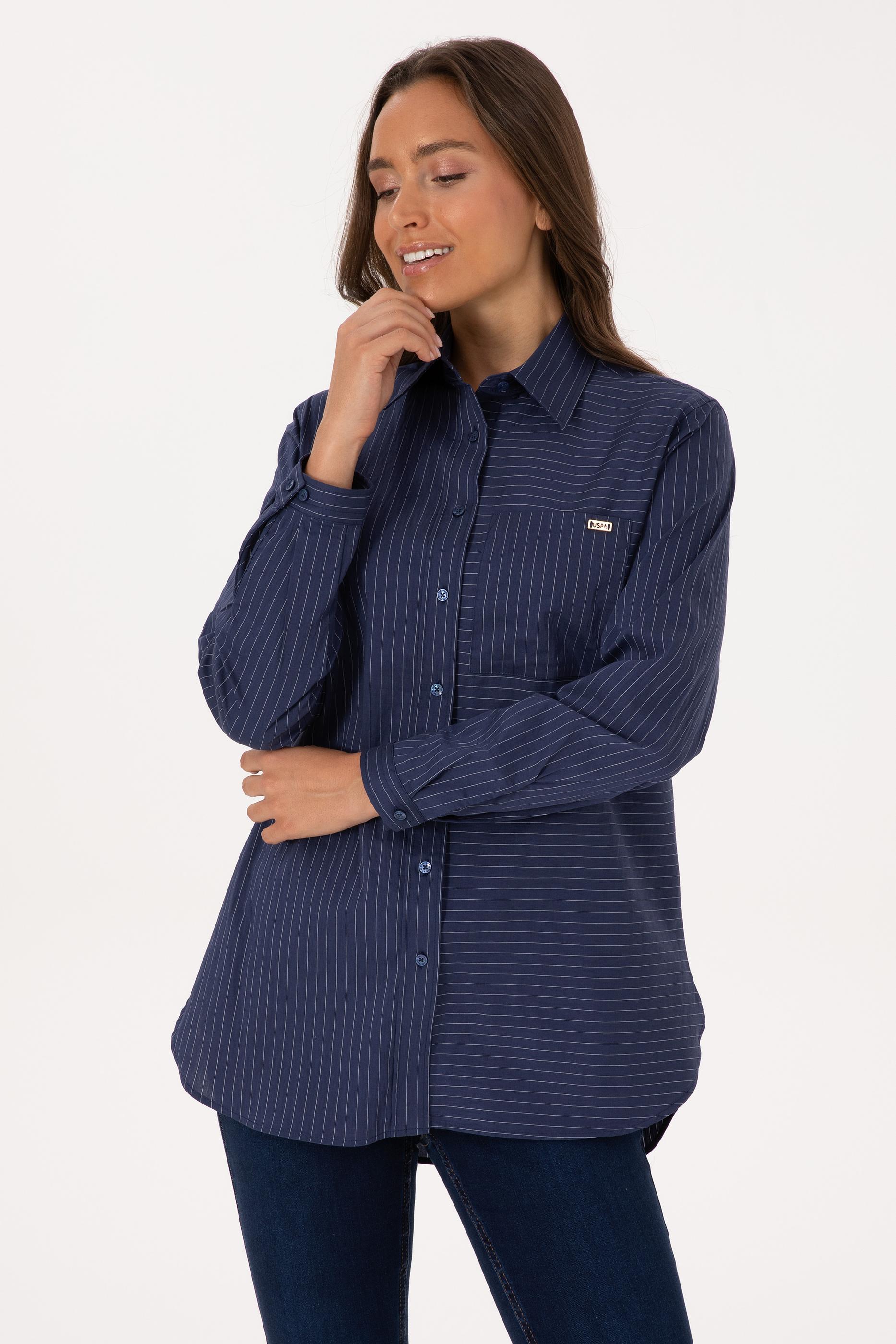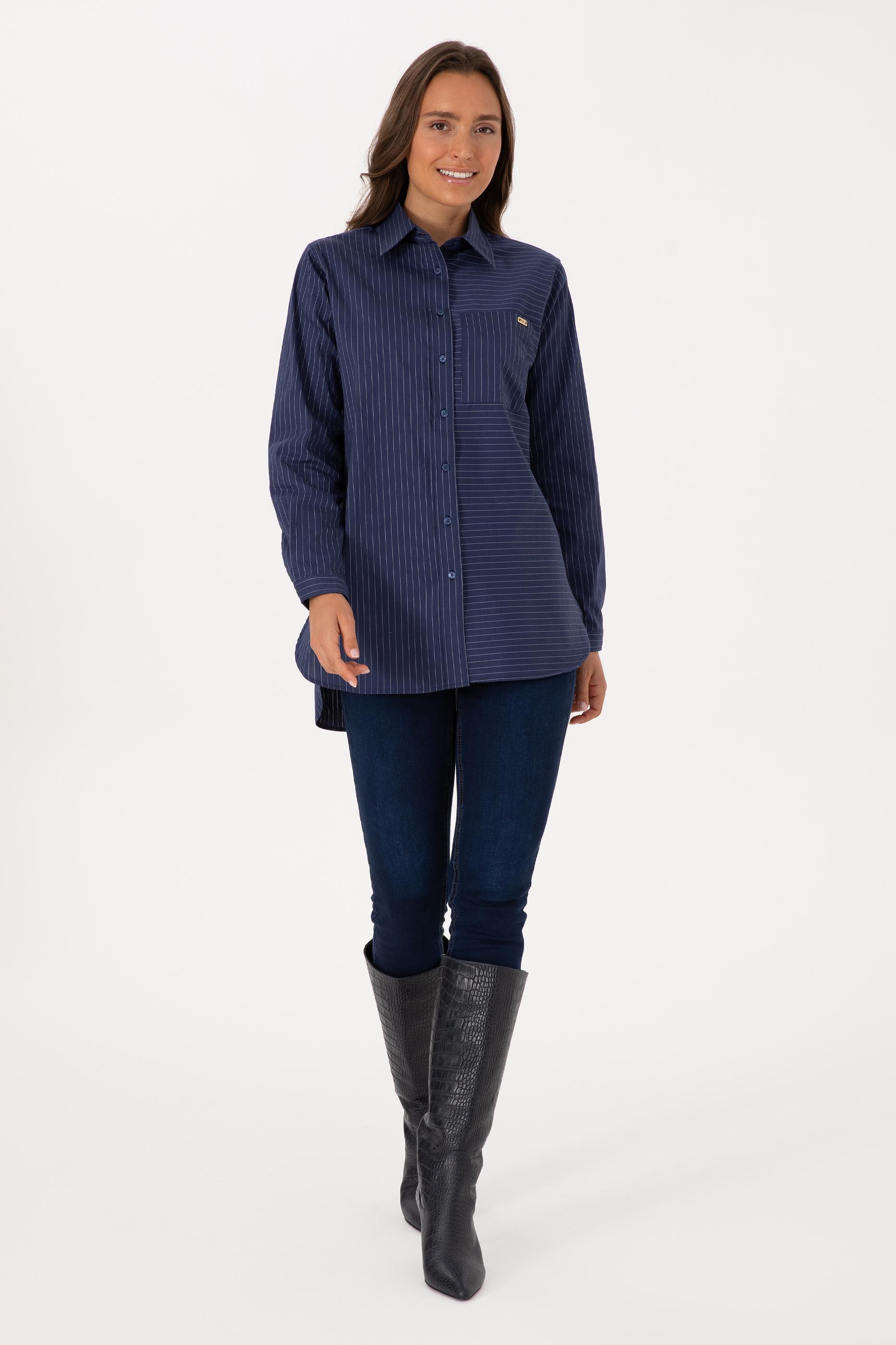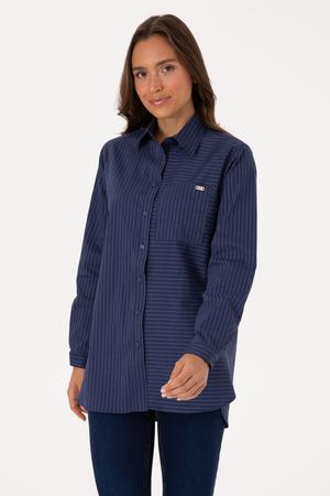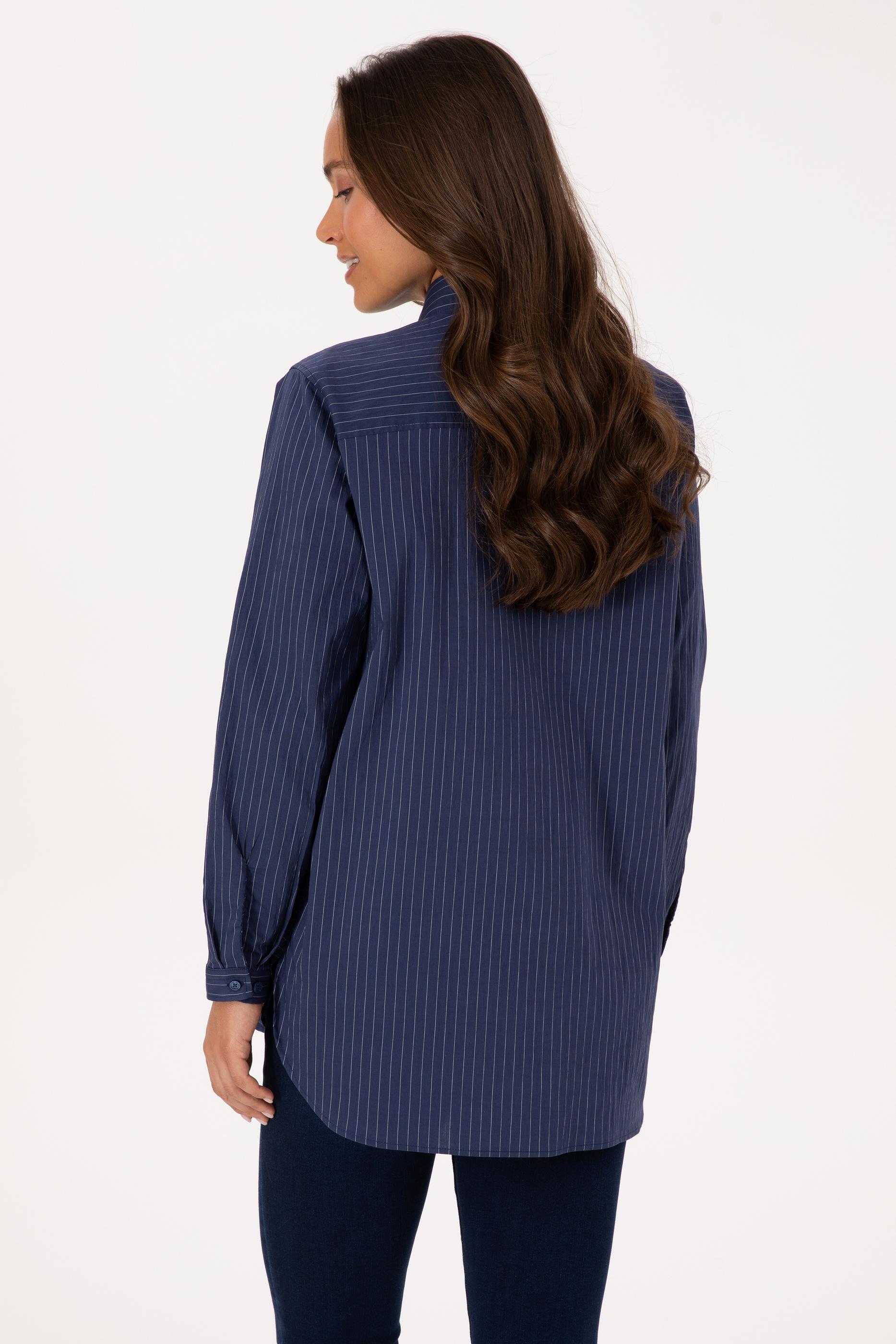 Kadın İndigo Uzun Kollu Çizgili Gömlek