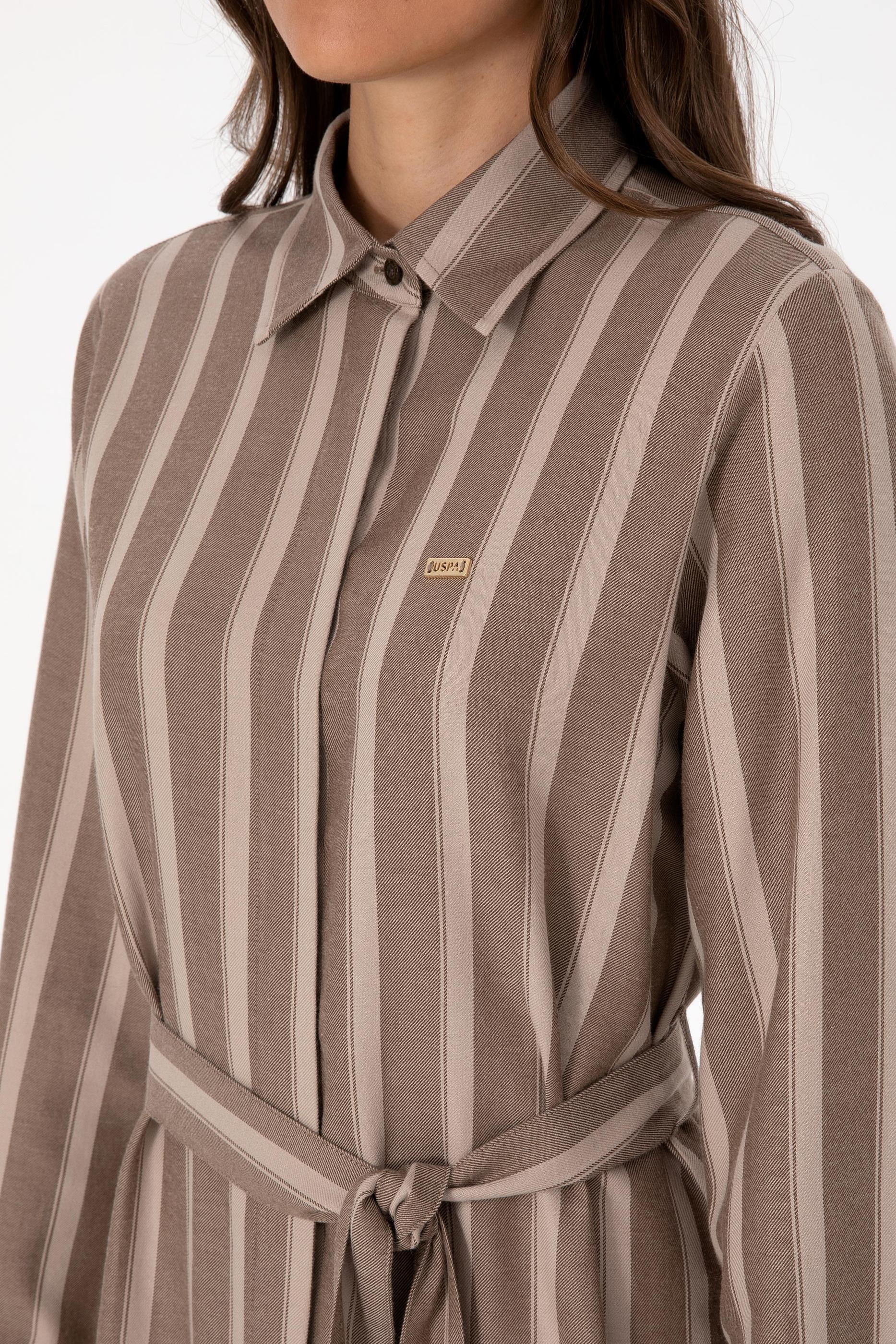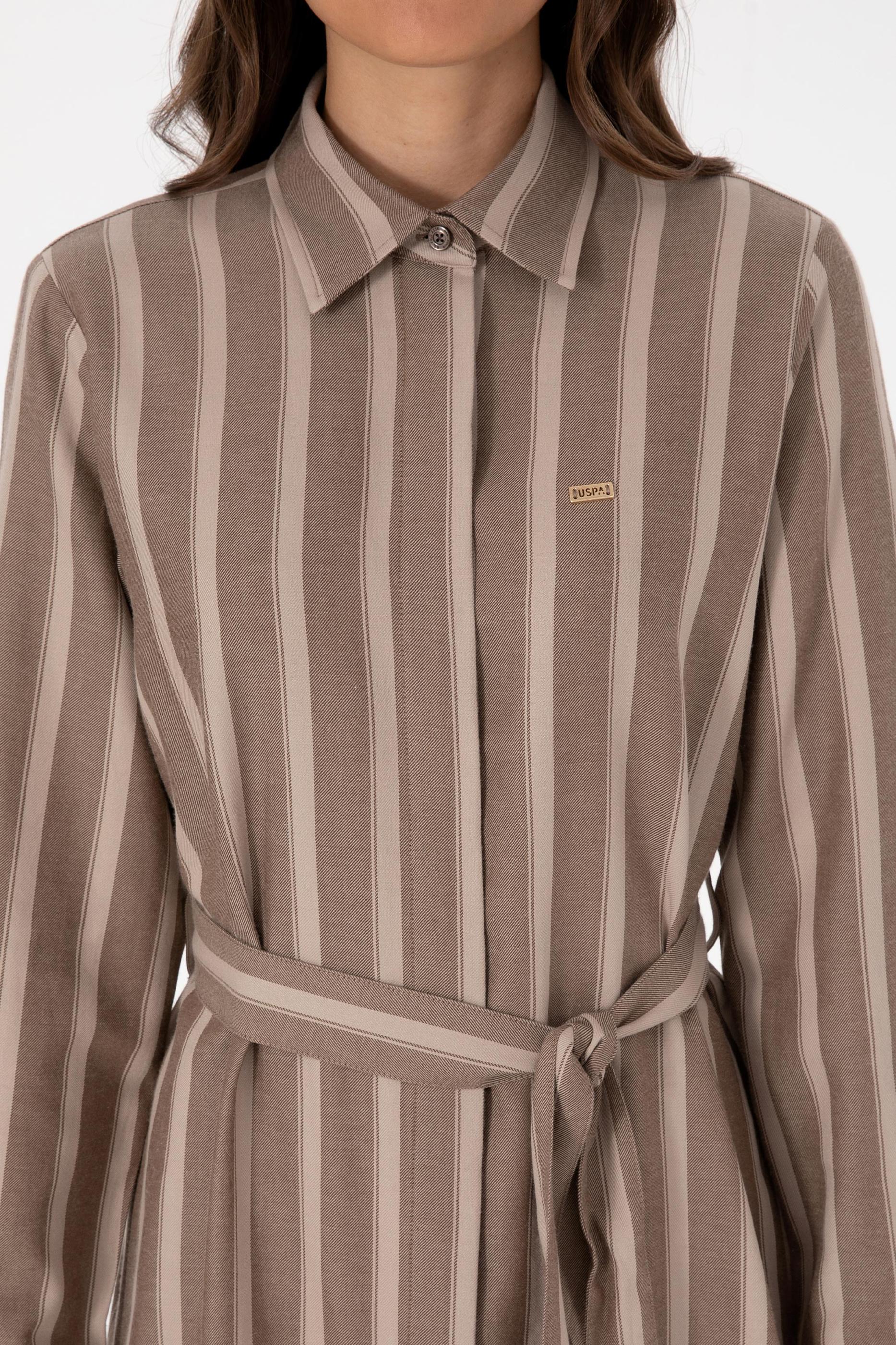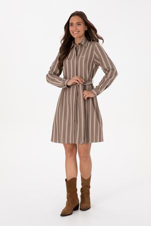 - Kadın Kahverengi Çizgili Kemerli Dokuma Elbise