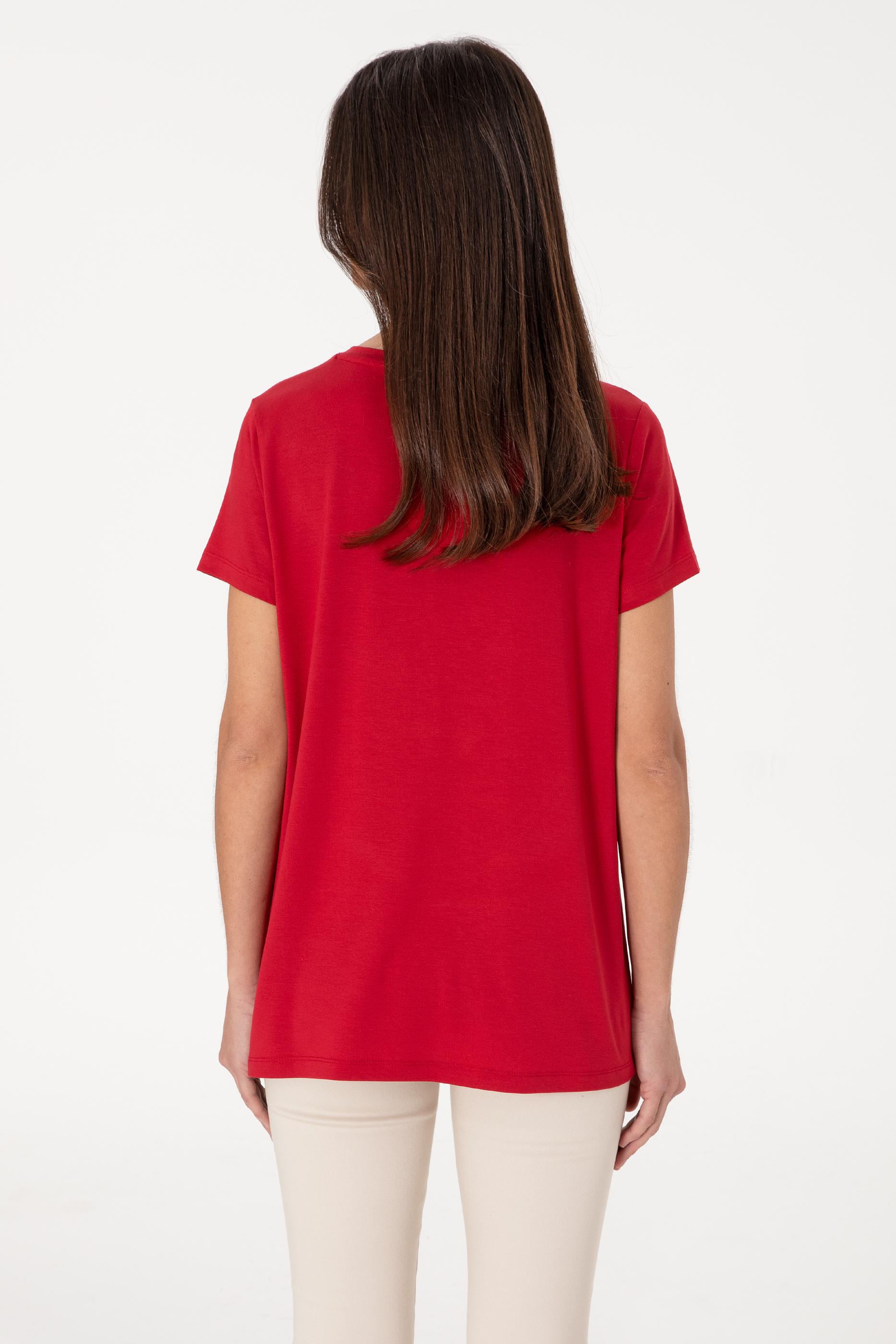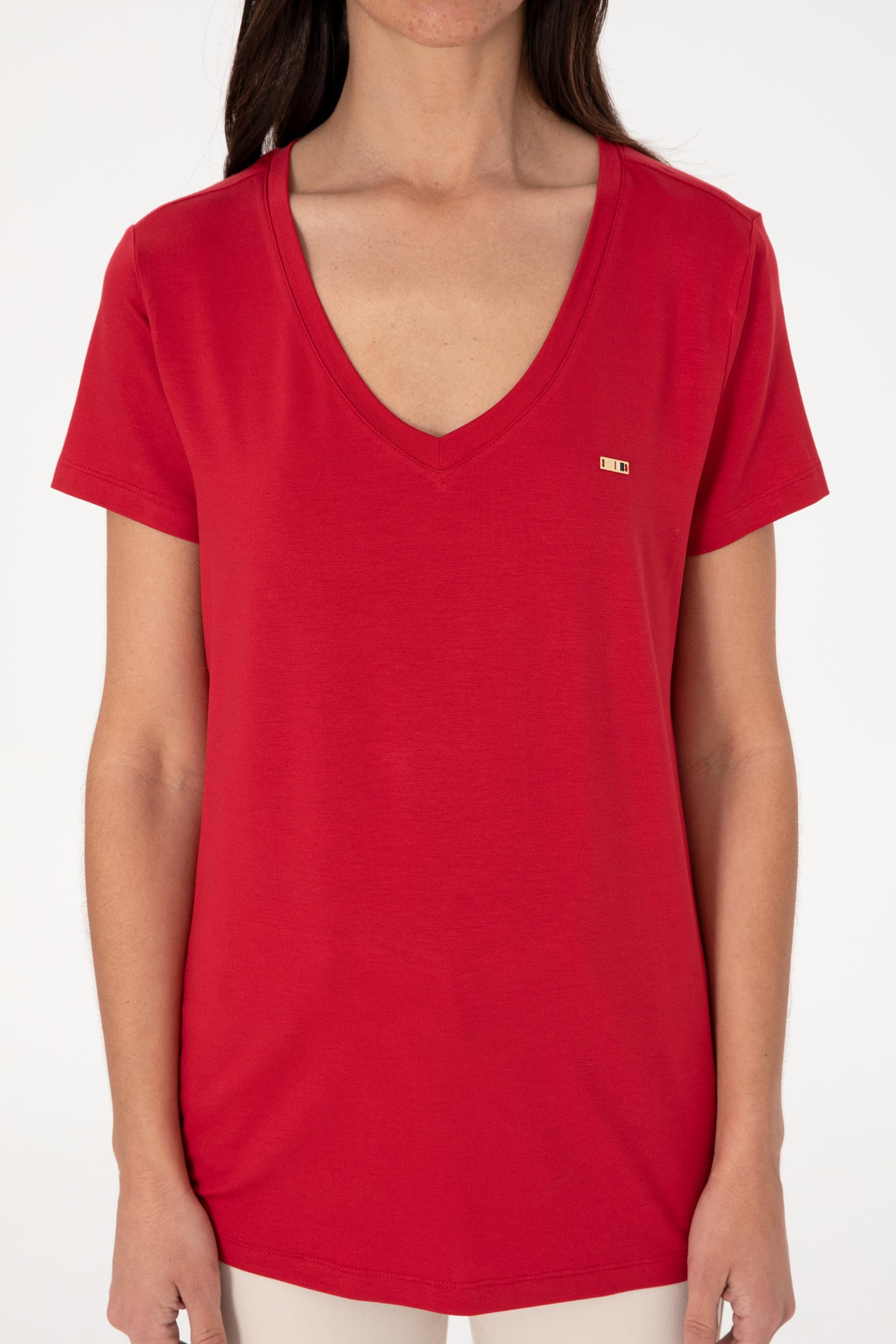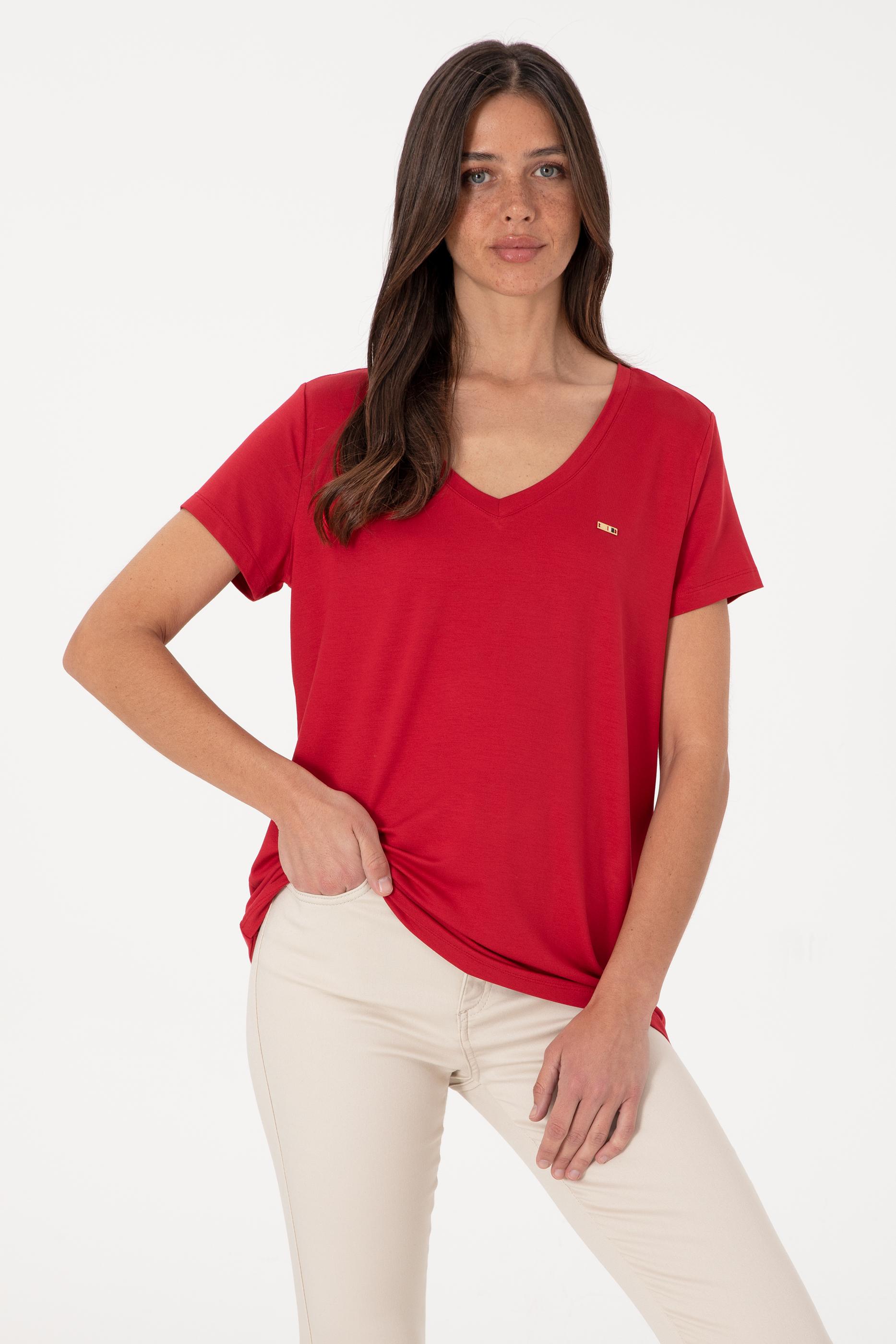 Kadın Kırmızı Modal Karışımlı V Yaka Basic Tişört