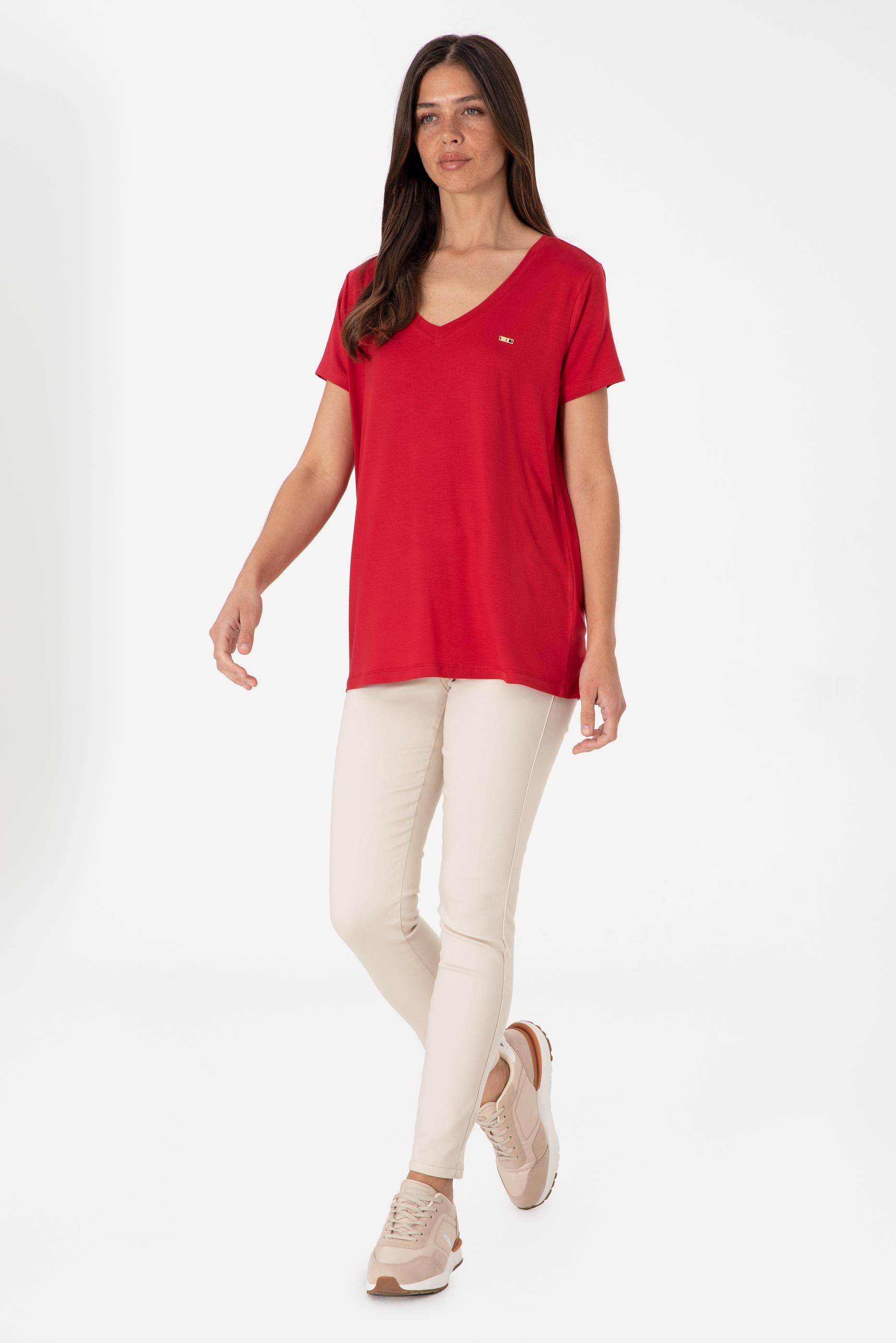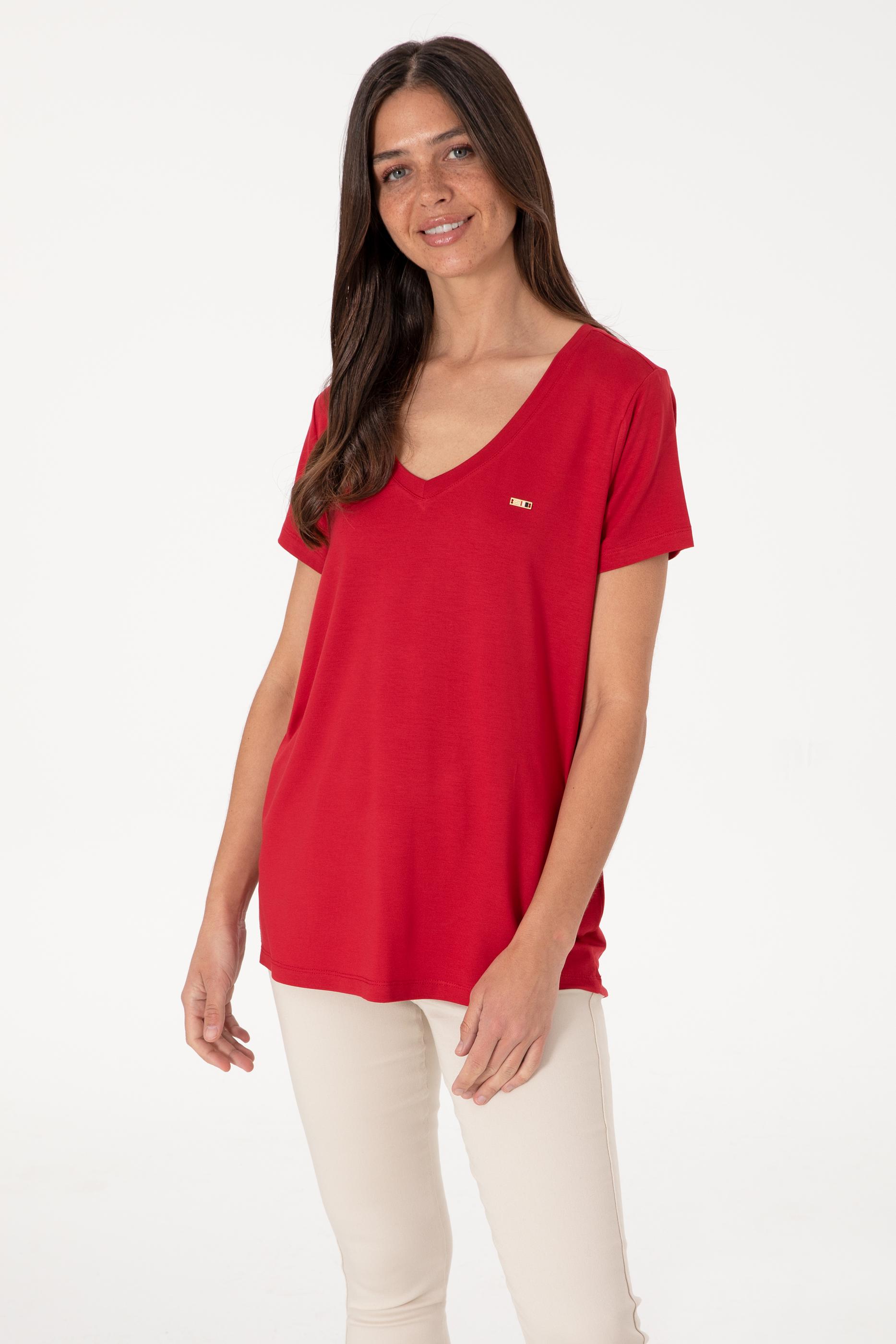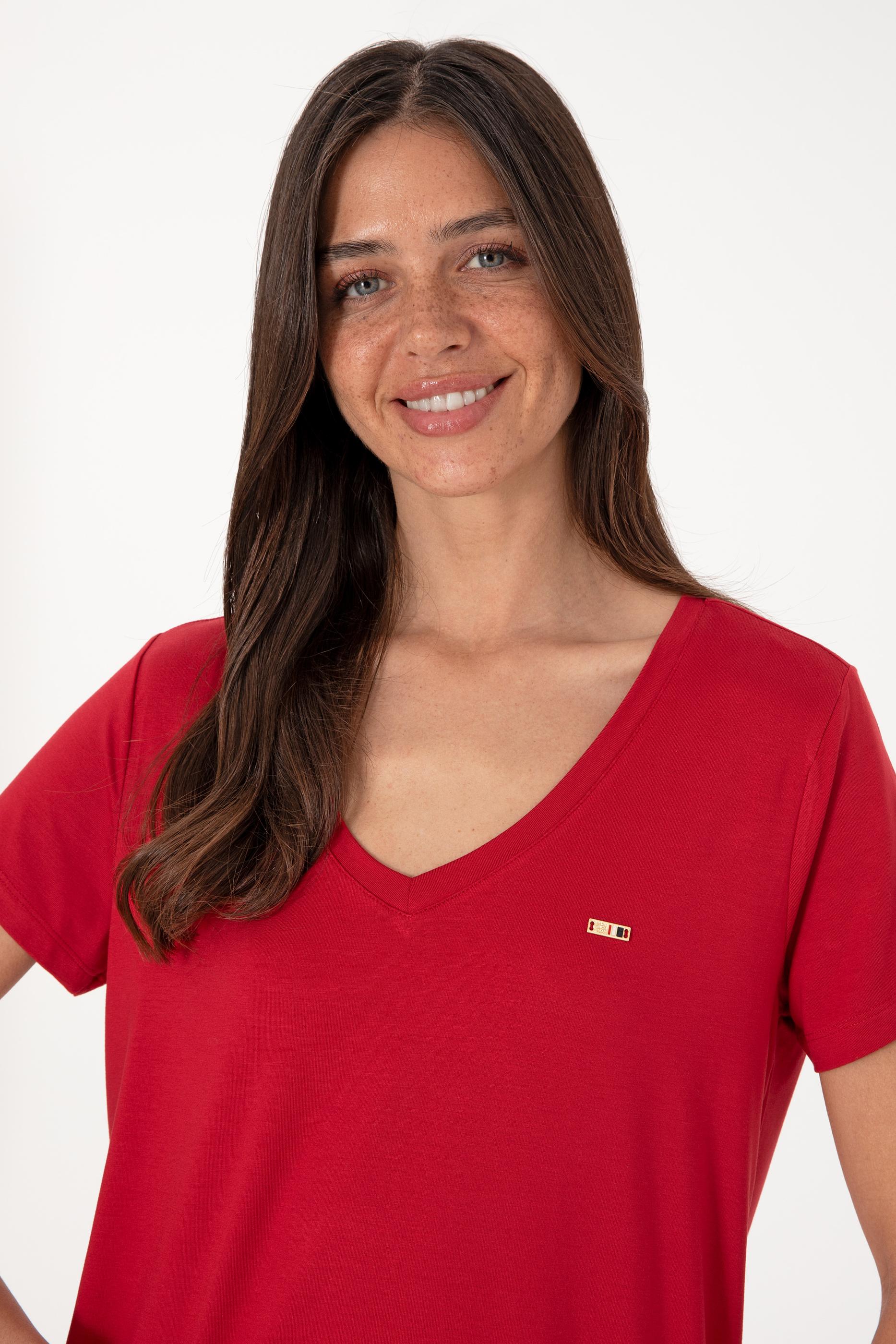 Kadın Kırmızı Modal Karışımlı V Yaka Basic Tişört