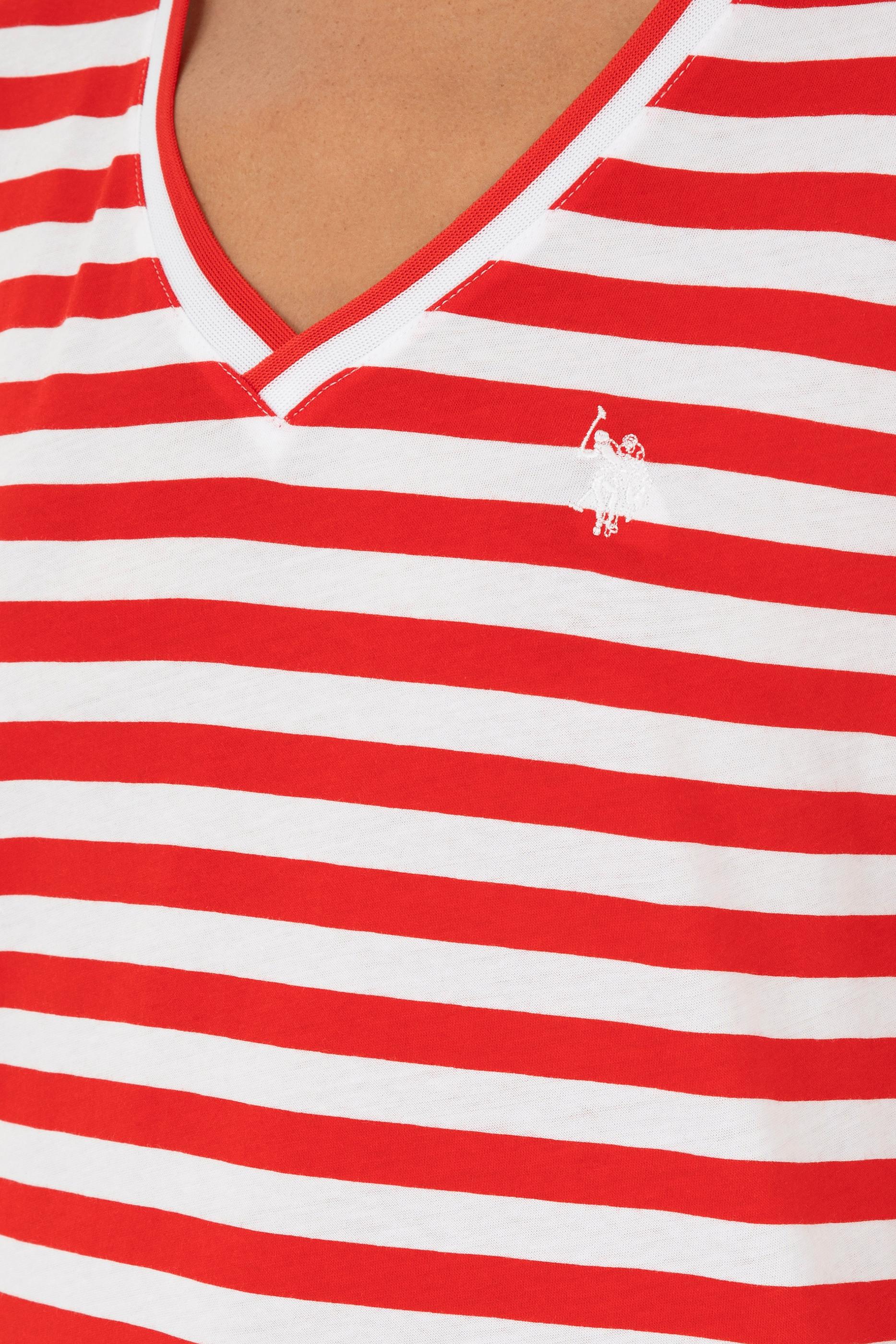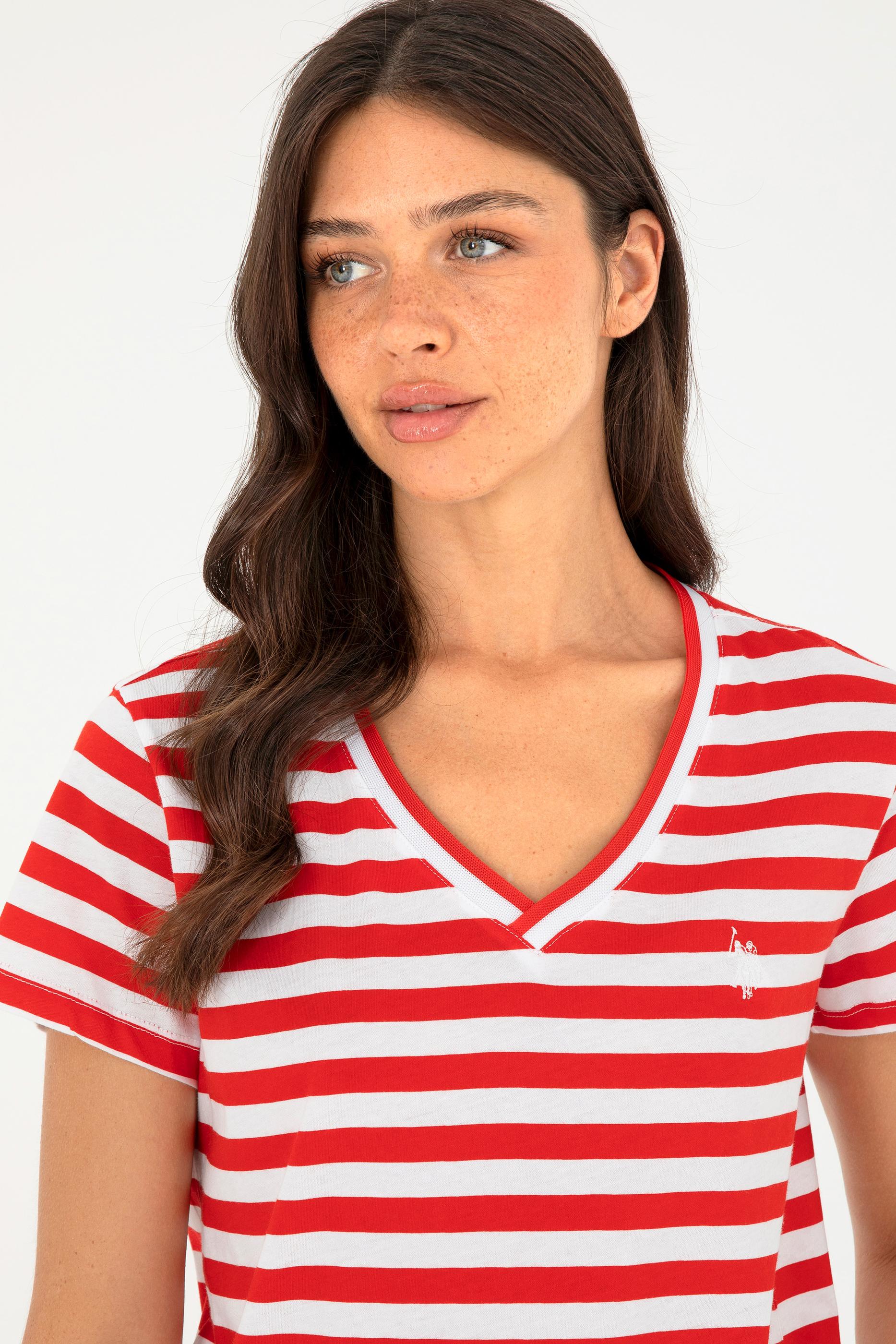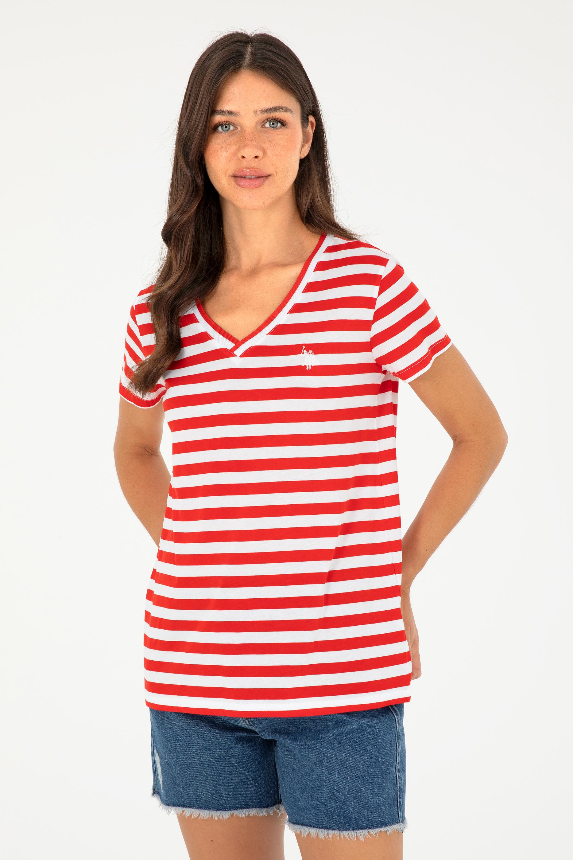 - Kadın Kırmızı Çizgili V Yaka Tişört