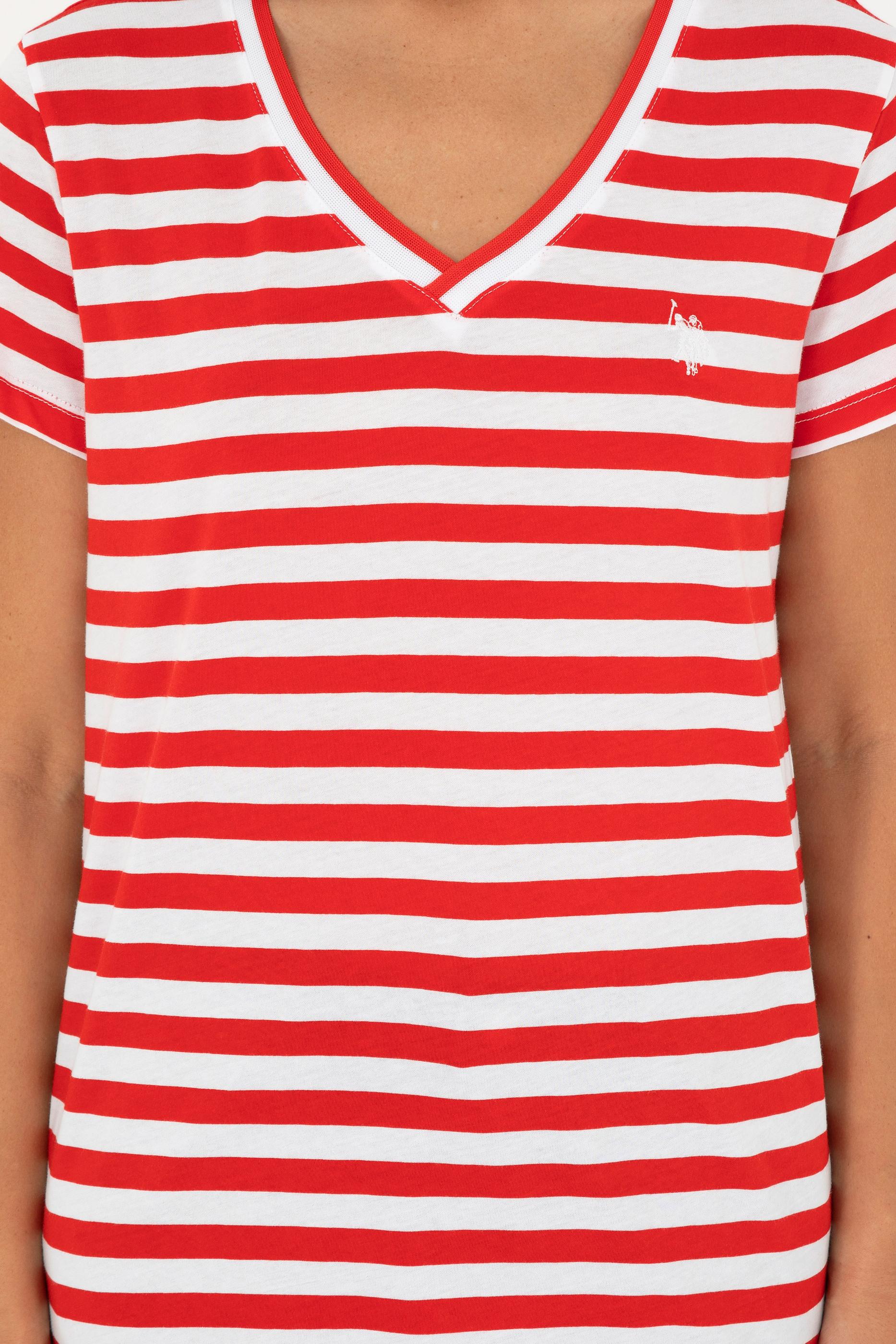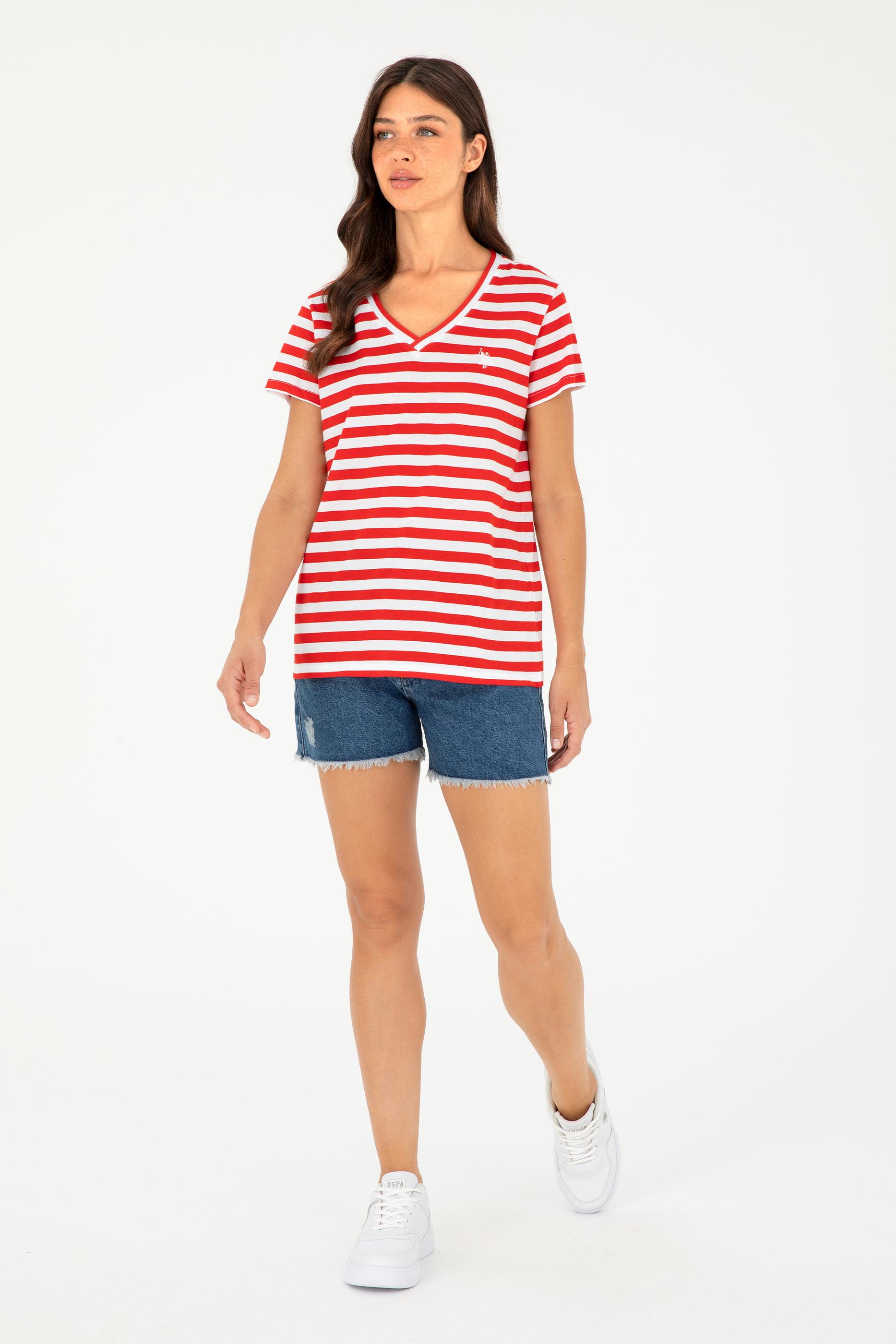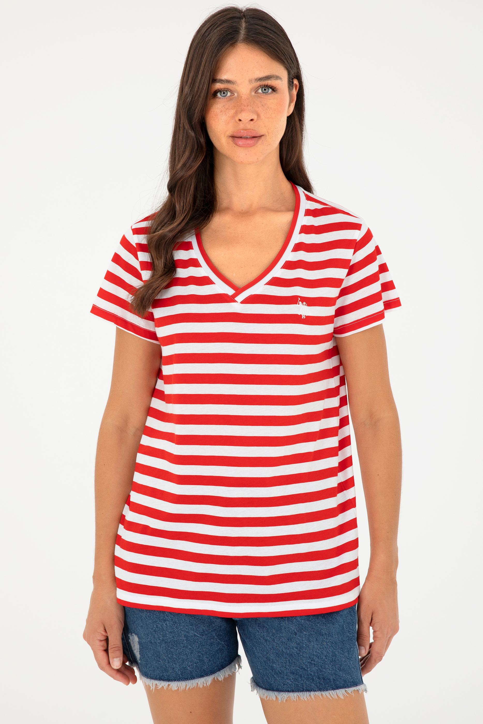 - Kadın Kırmızı Çizgili V Yaka Tişört