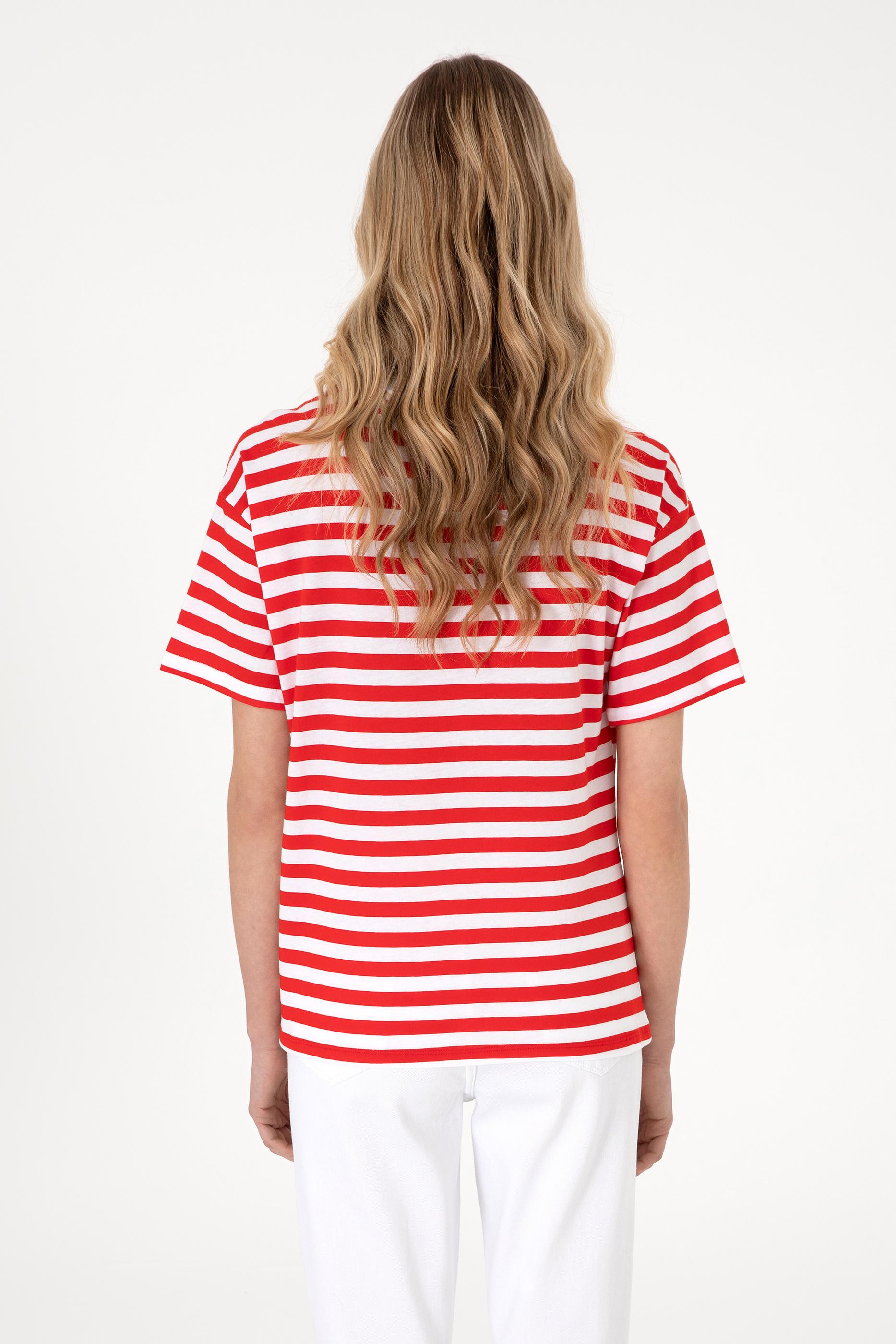 Kadın Kırmızı Çizgili Bisiklet Yaka Tişört
