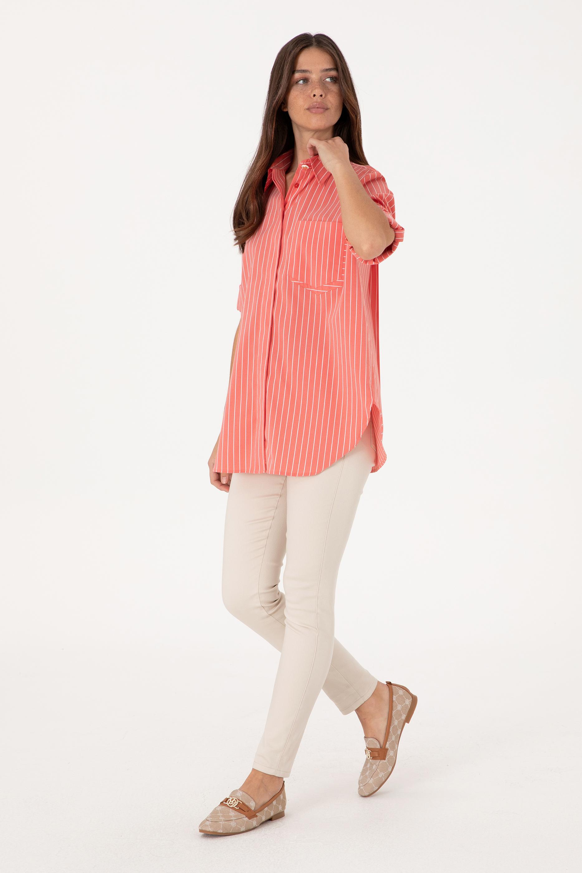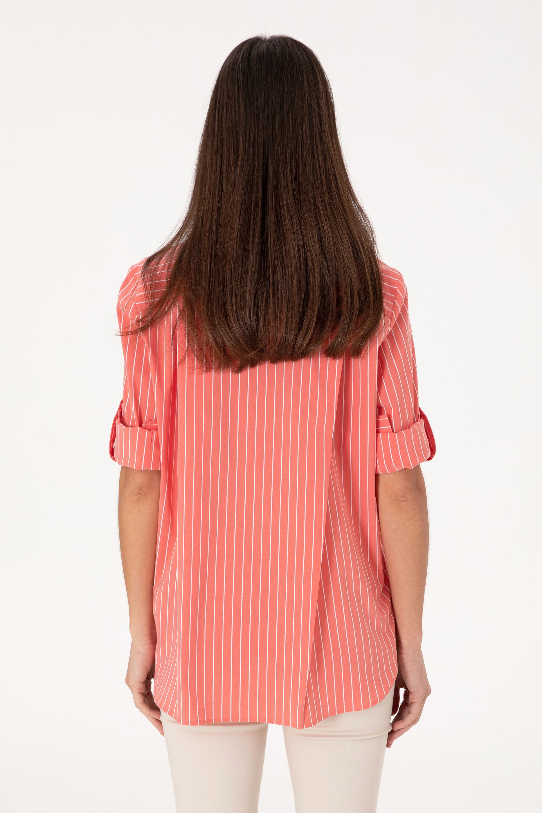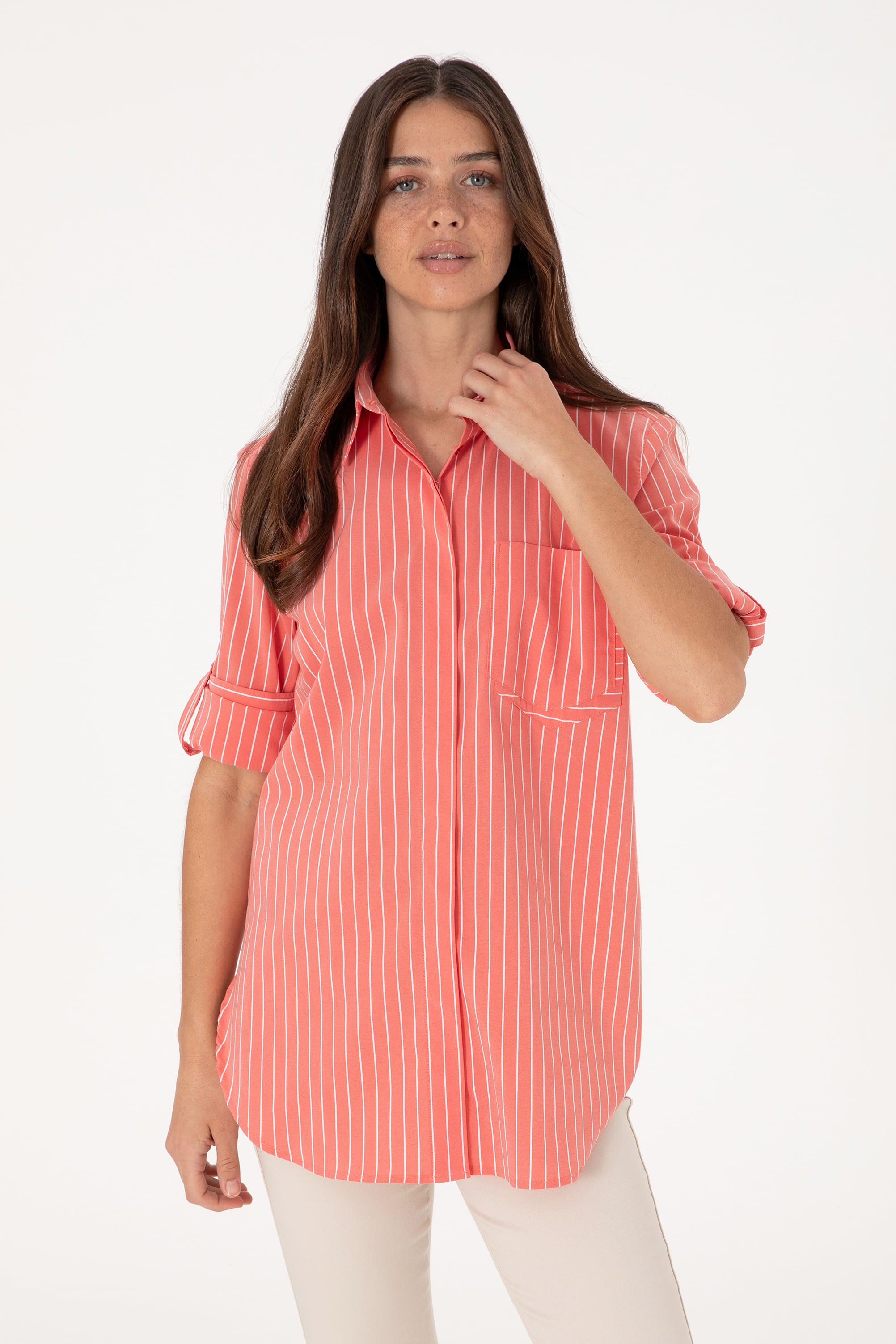 Kadın Kırmızı Uzun Kollu Çizgili Tunik Gömlek - 50299523015