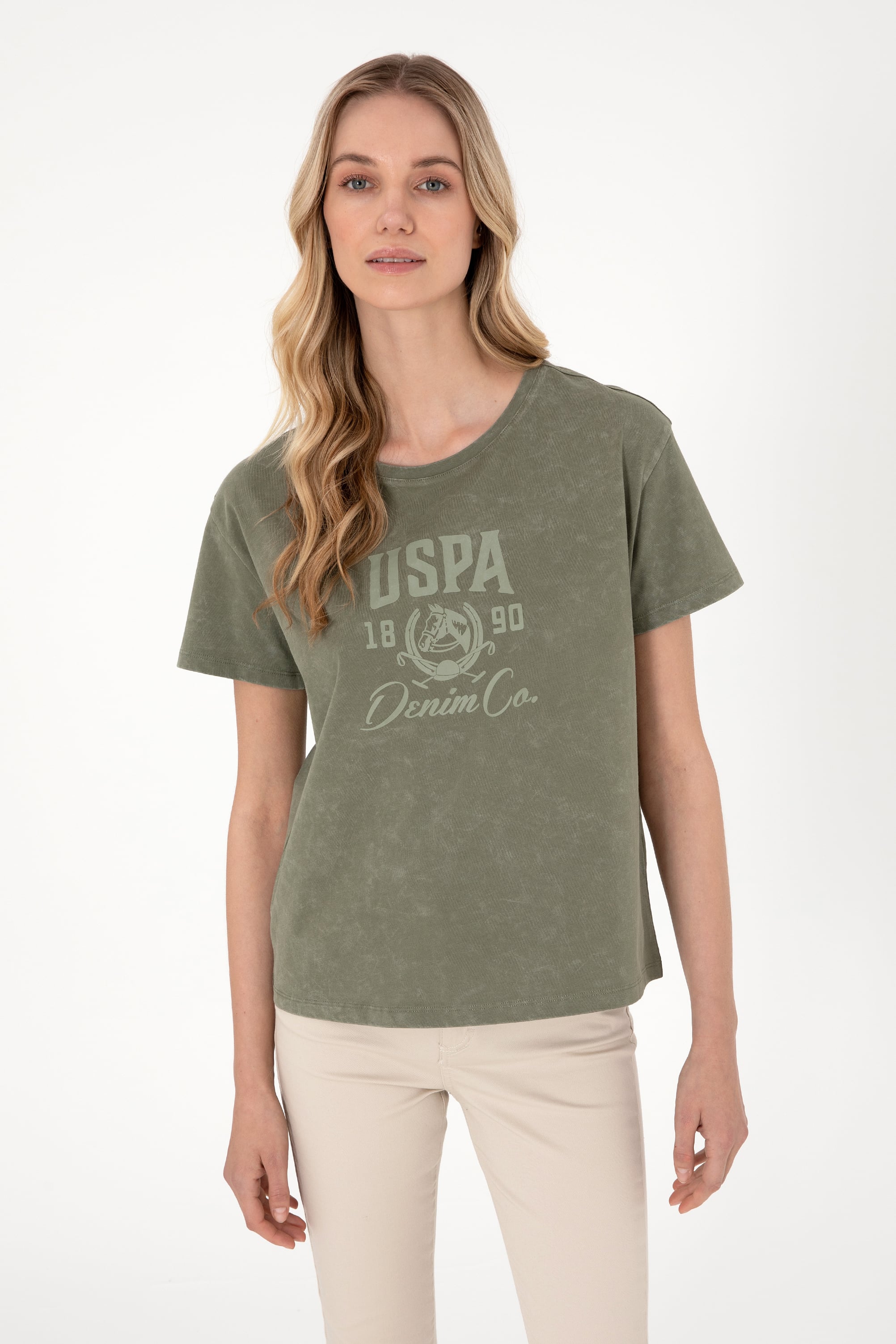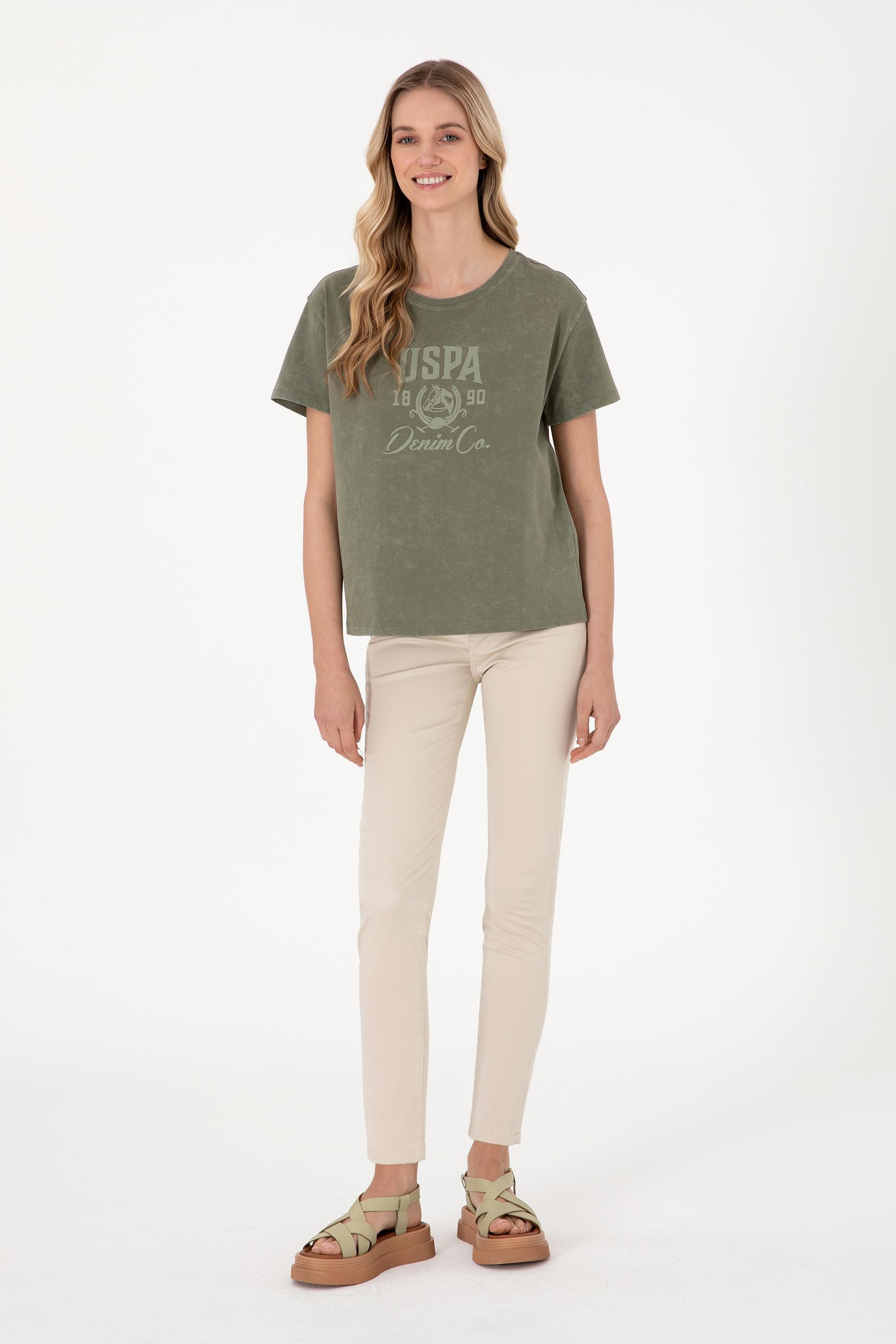 U.S. Polo Assn. tasarımı bu kadın haki tişört, özel yıkama efektiyle hafif soluk ve dokulu bir görünüm sunarak casual stile güçlü bir karakter kazandırır. Bisiklet yaka kesimi ve kısa kollu yapısıyla sade bir temel oluştururken, göğüs kısmındaki büyük ebatlı USPA Denim Co. baskı tasarıma dinamik bir hava katar. Yumuşak ve dökümlü duruşuyla rahatlık vadeden model, hem günlük kullanım hem de hafta sonu kombinleri için ideal bir seçimdir. Beyaz, krem veya açık renk pantolonlarla kontrast yaratarak öne çıkan bu parça, sportif ve sokak stiline göz kırpan modern bir alternatiftir.
