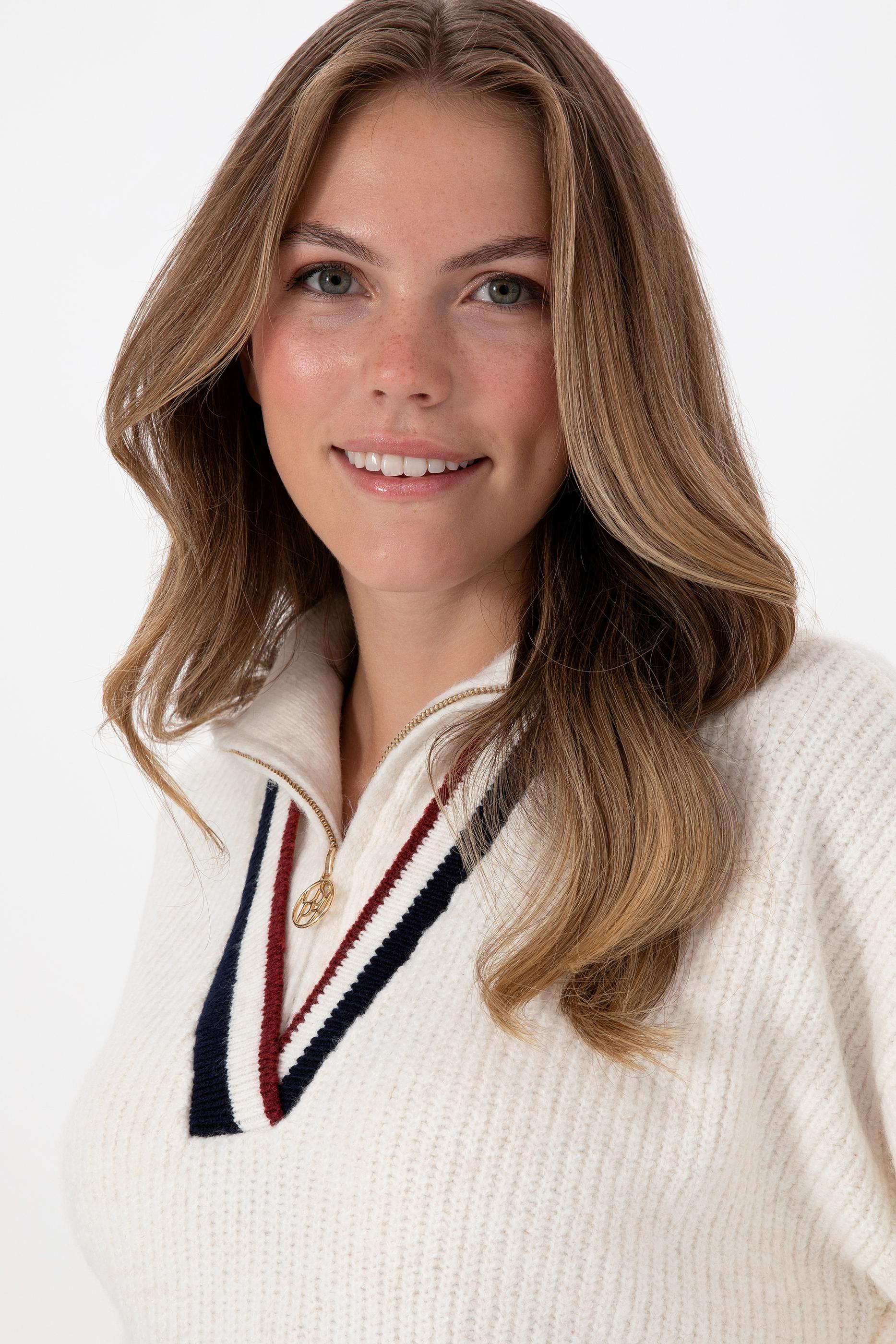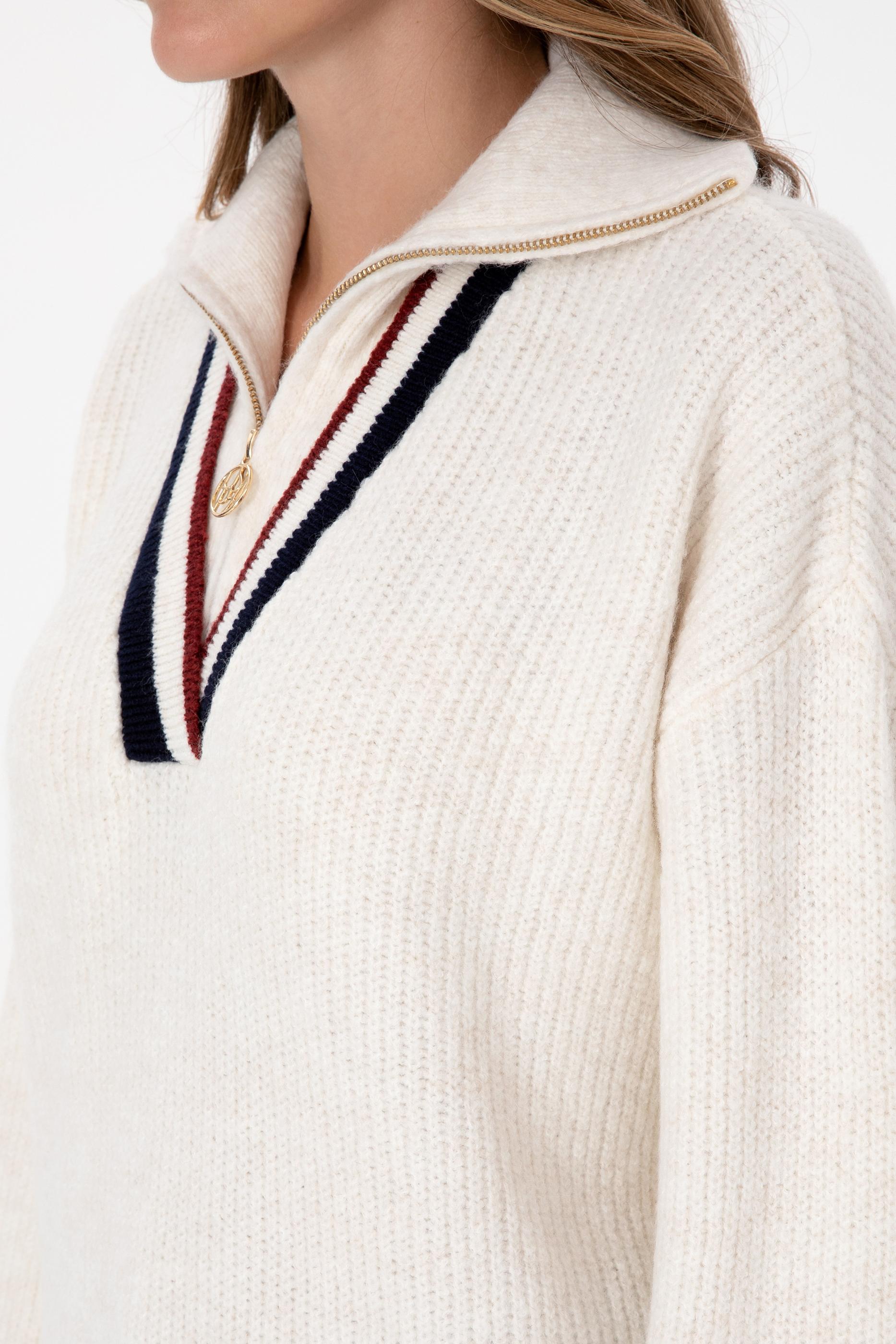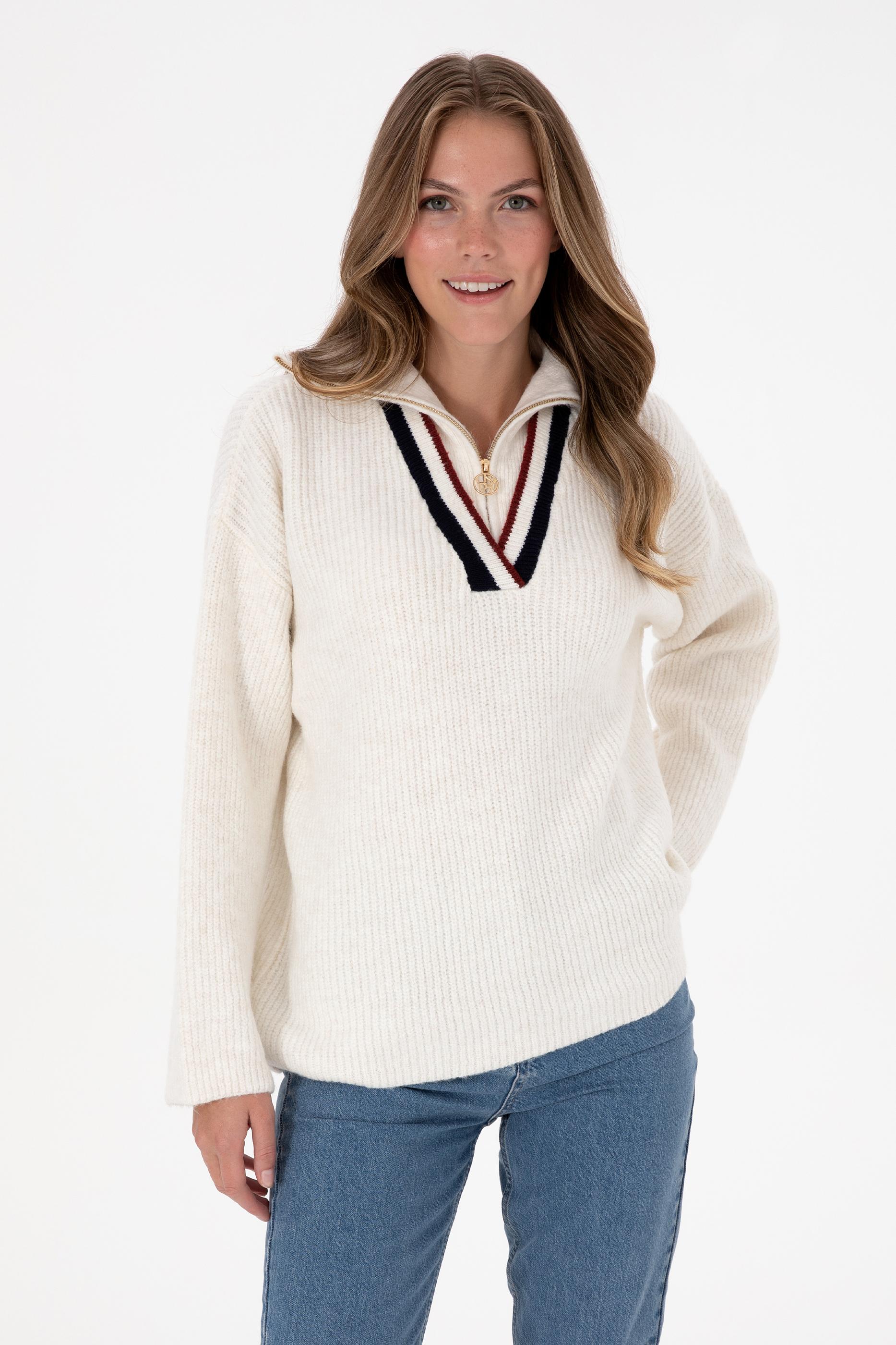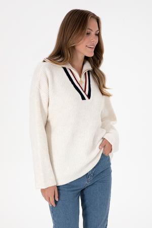 Kadın Beyaz V Yaka Fermuarlı Kazak