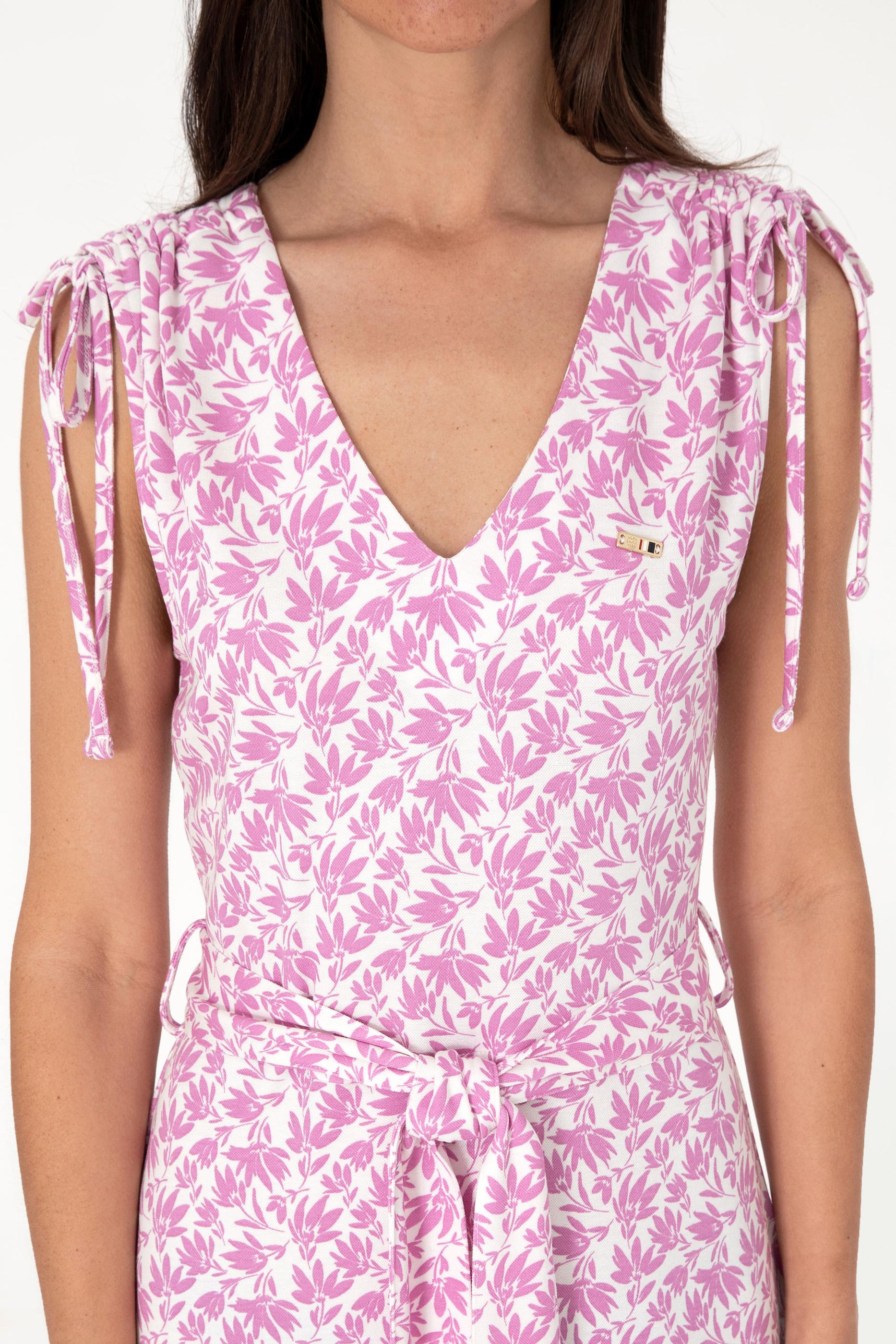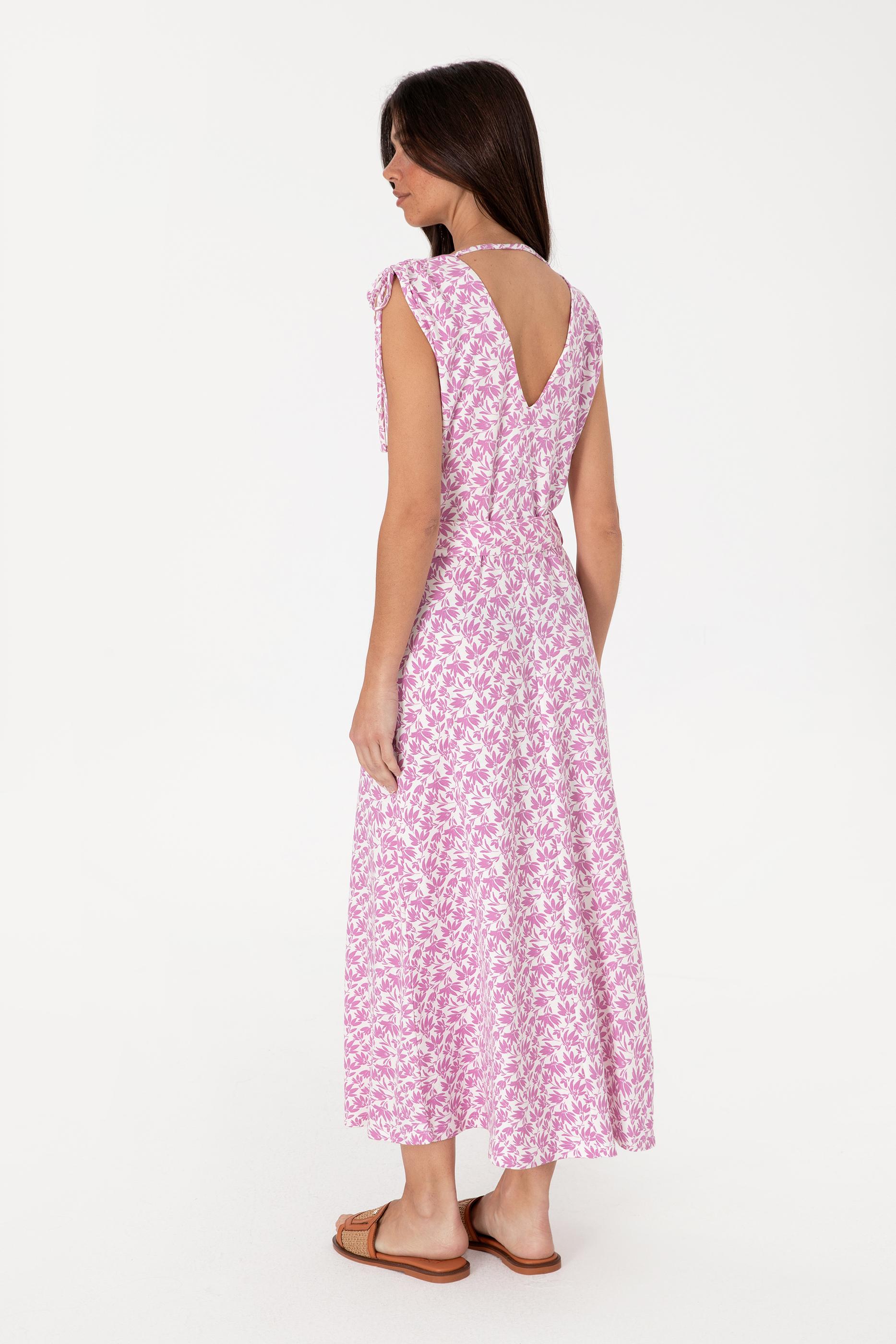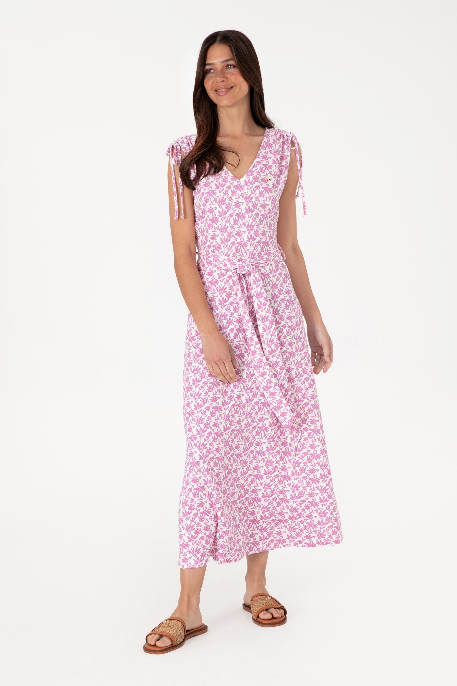 U.S. Polo Assn. stilini desenli ve feminen bir yorumla sunan bu pembe renkli elbise, zarif V yaka kesimi ve kuşaklı bel detayıyla silueti dengeli şekilde vurgular. Yumuşak örme kumaşı sayesinde cilde konforlu bir temas sunarken, omuz bağcıkları ve yaprak desenleri modele hareket ve doğallık katar. Diz altı boyu ve dökümlü formu, yazın sıcak günlerinde hem şehir hem tatil stiline rahatça uyum sağlar. Beyaz zemin üzerindeki kontrast yaprak desenleri ise bohem bir dokunuşla natürel ama dikkat çekici bir görünüm yaratır.