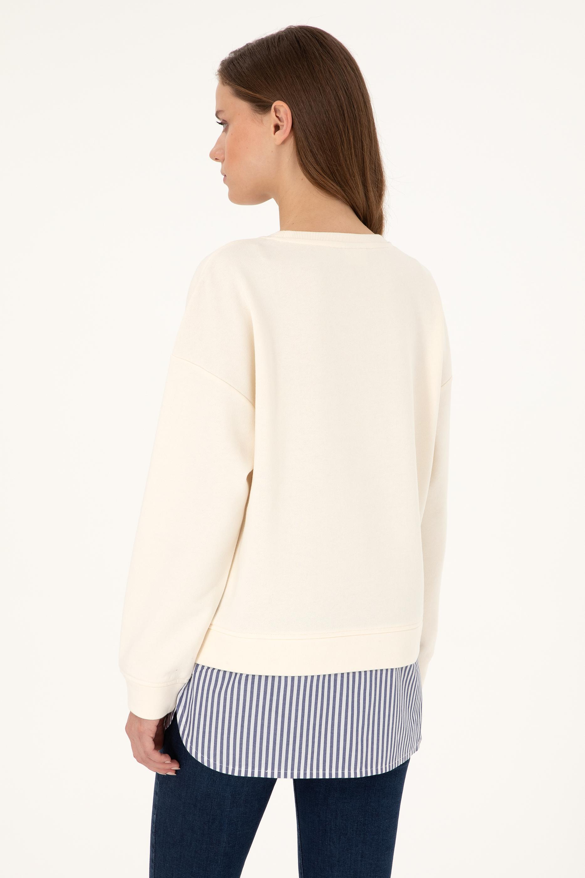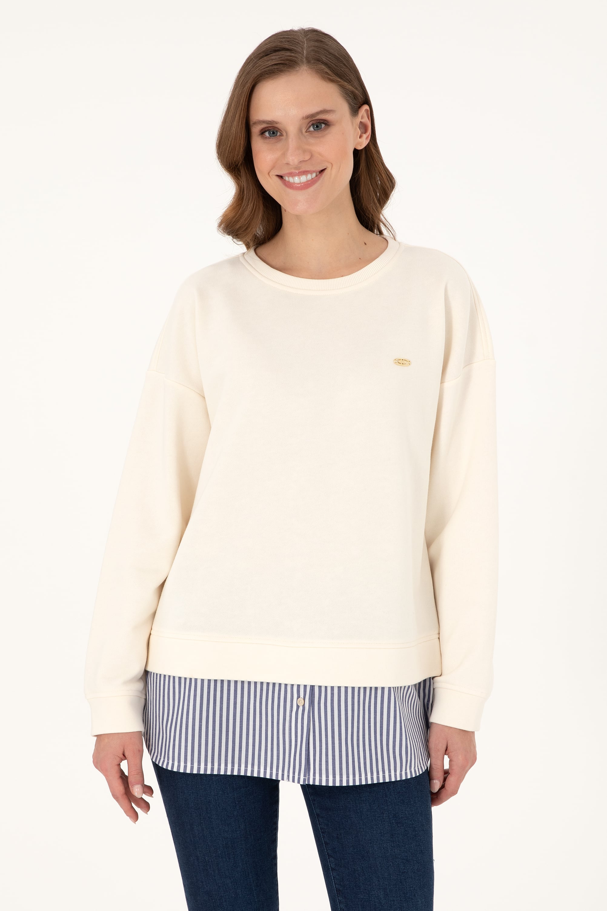 Kadın Krem Gömlek Detaylı Bisiklet Yaka Sweatshirt