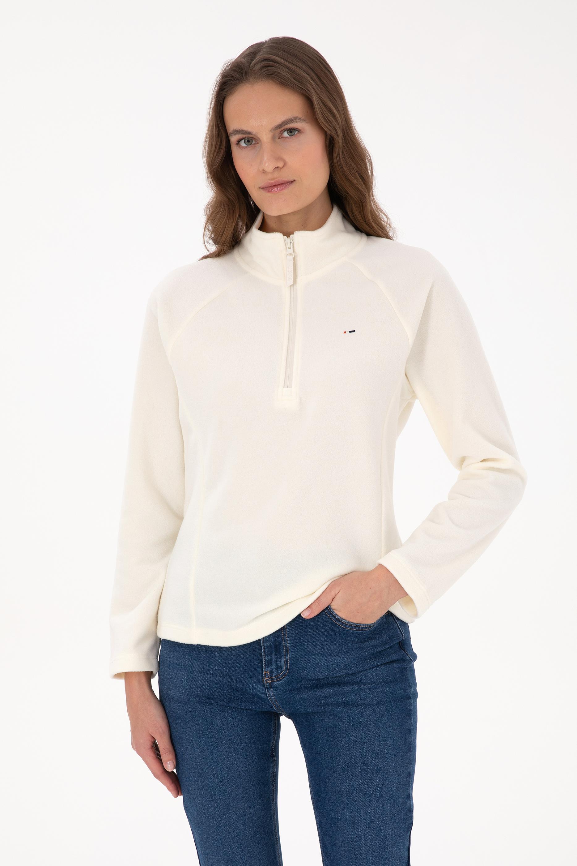 Kadın Krem Fermuarlı Dik Yaka Polar Sweatshirt