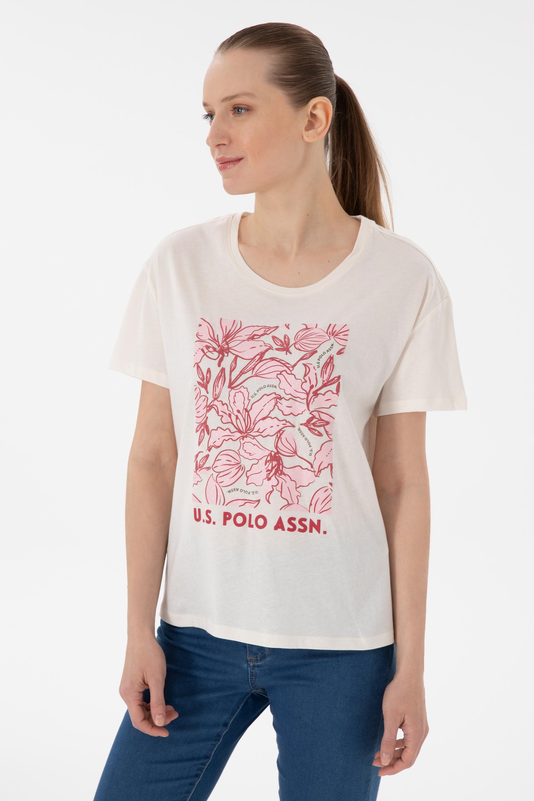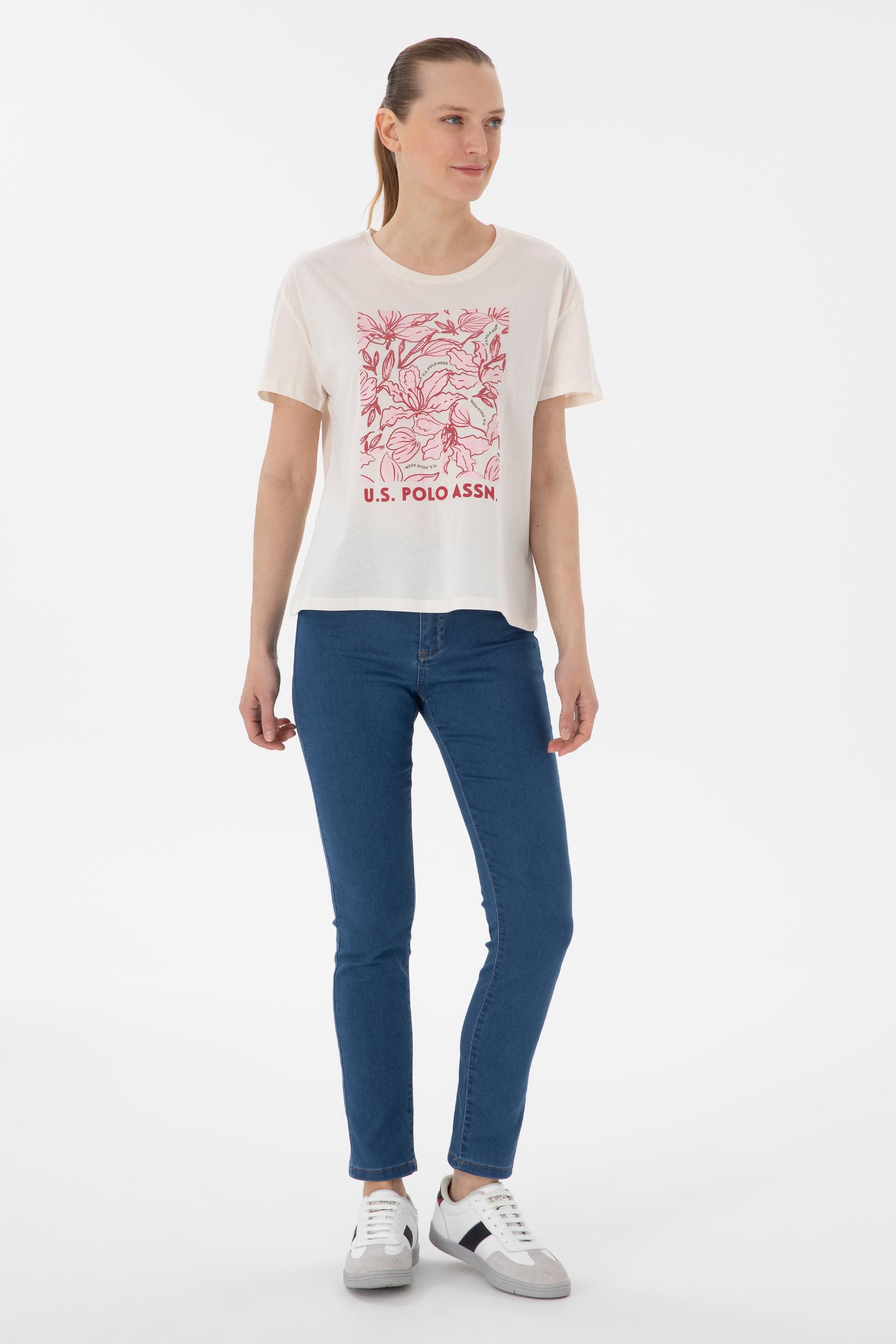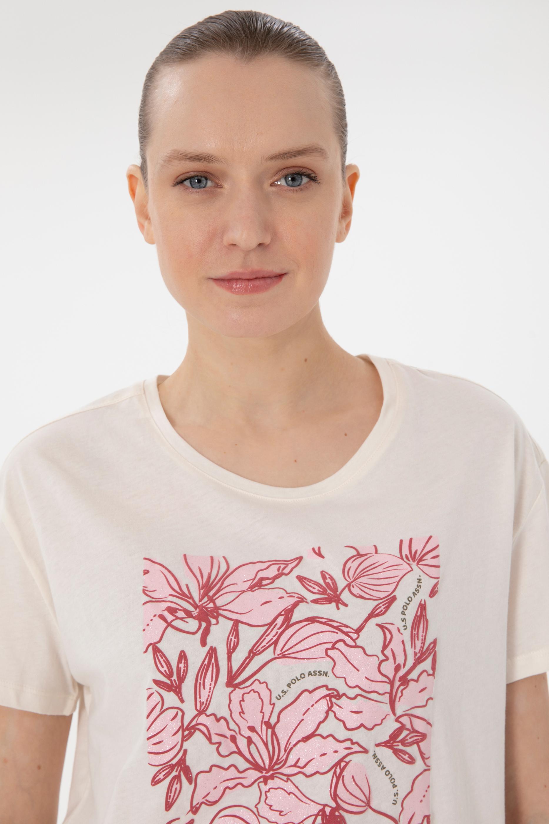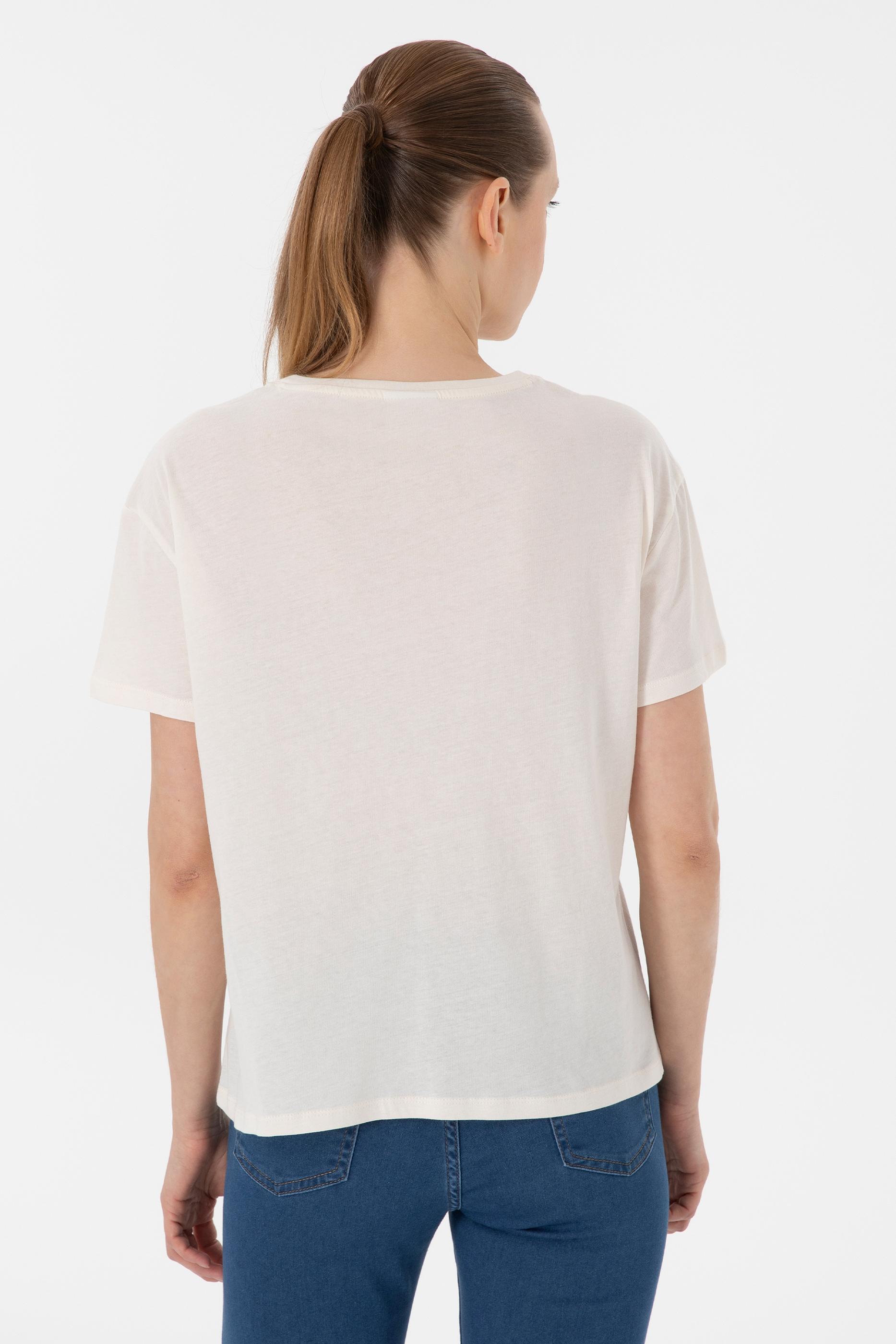- Kadın Krem Desenli Bisiklet Yaka Tişört