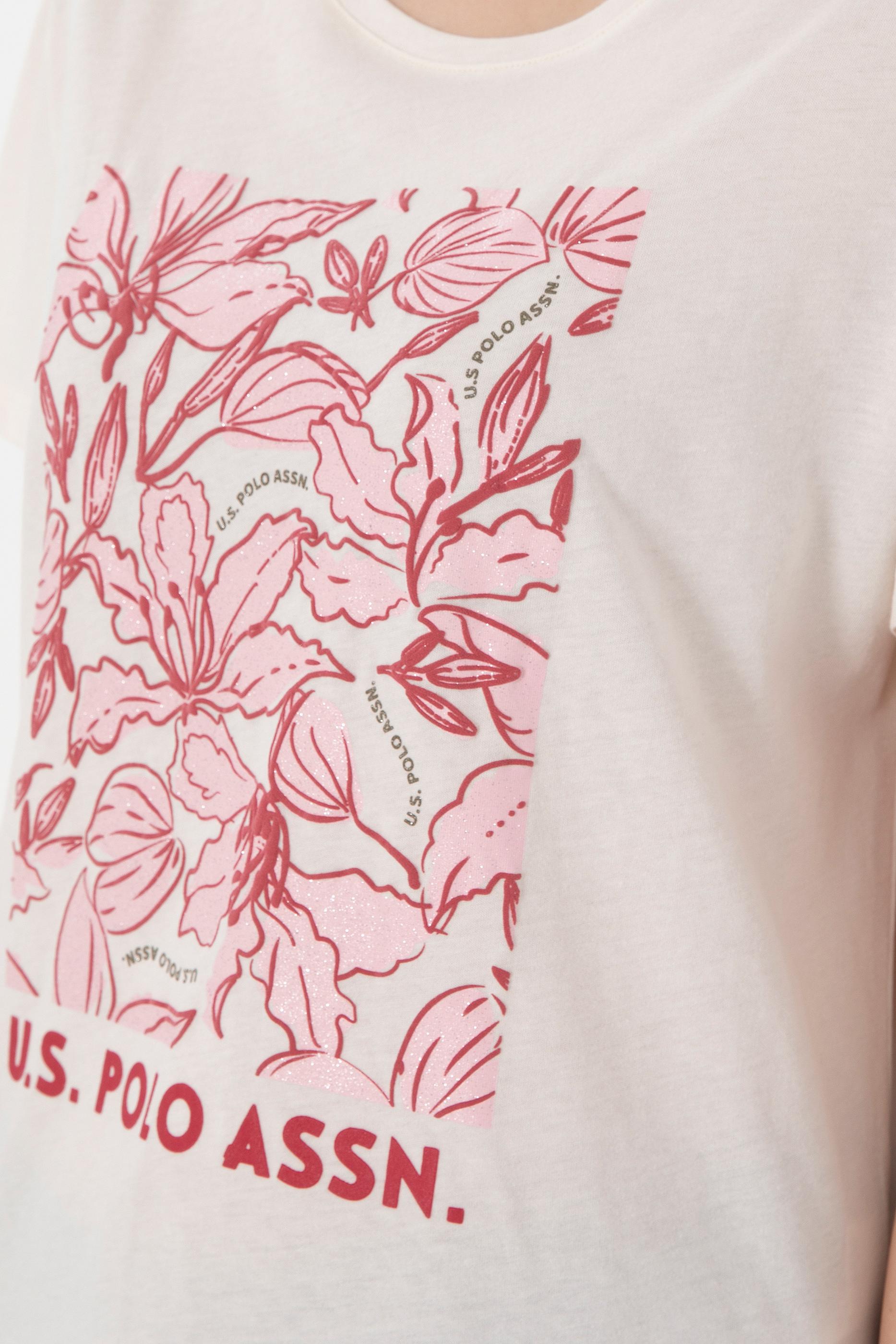 Kadın Krem Desenli Bisiklet Yaka Tişört