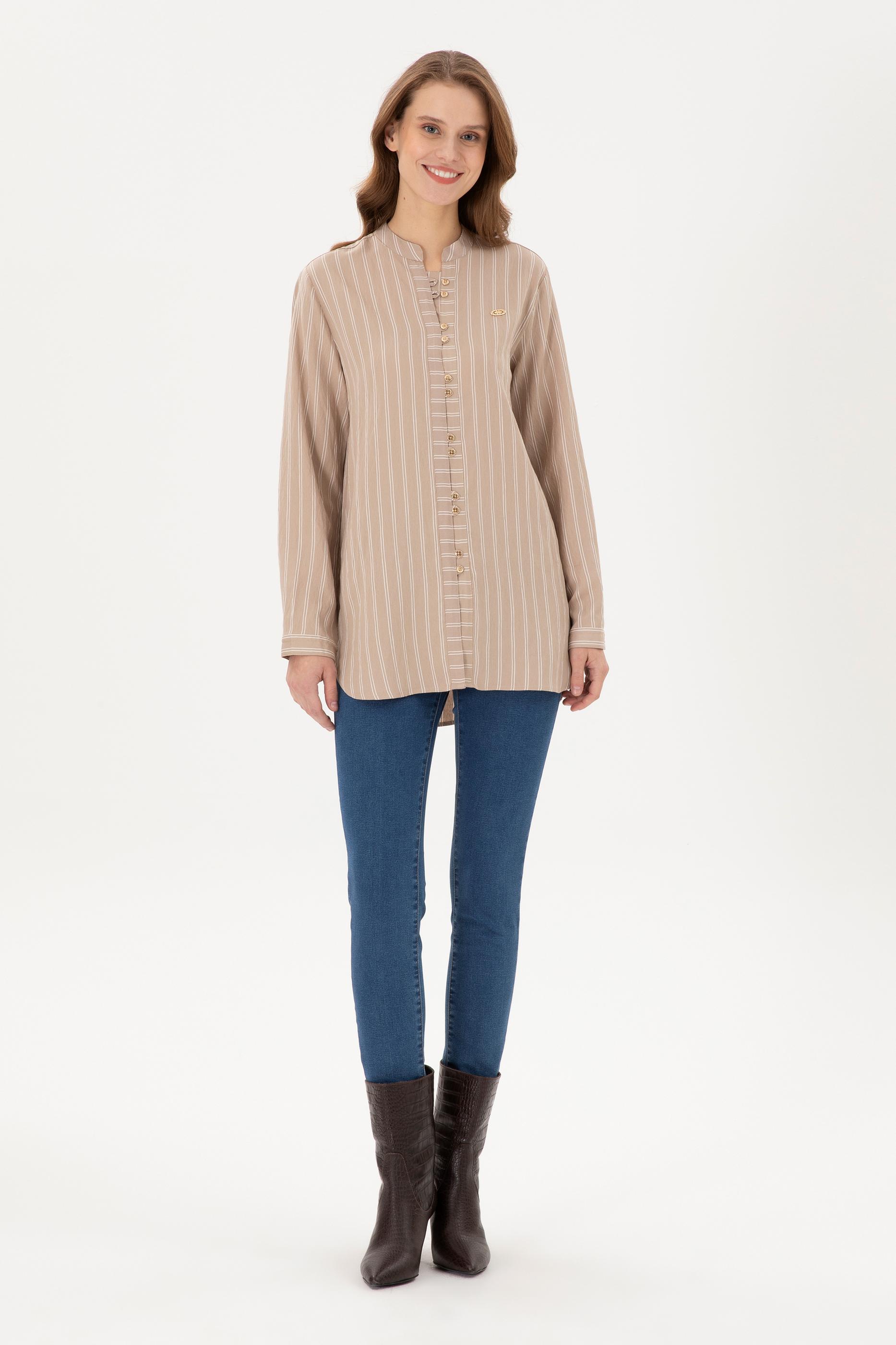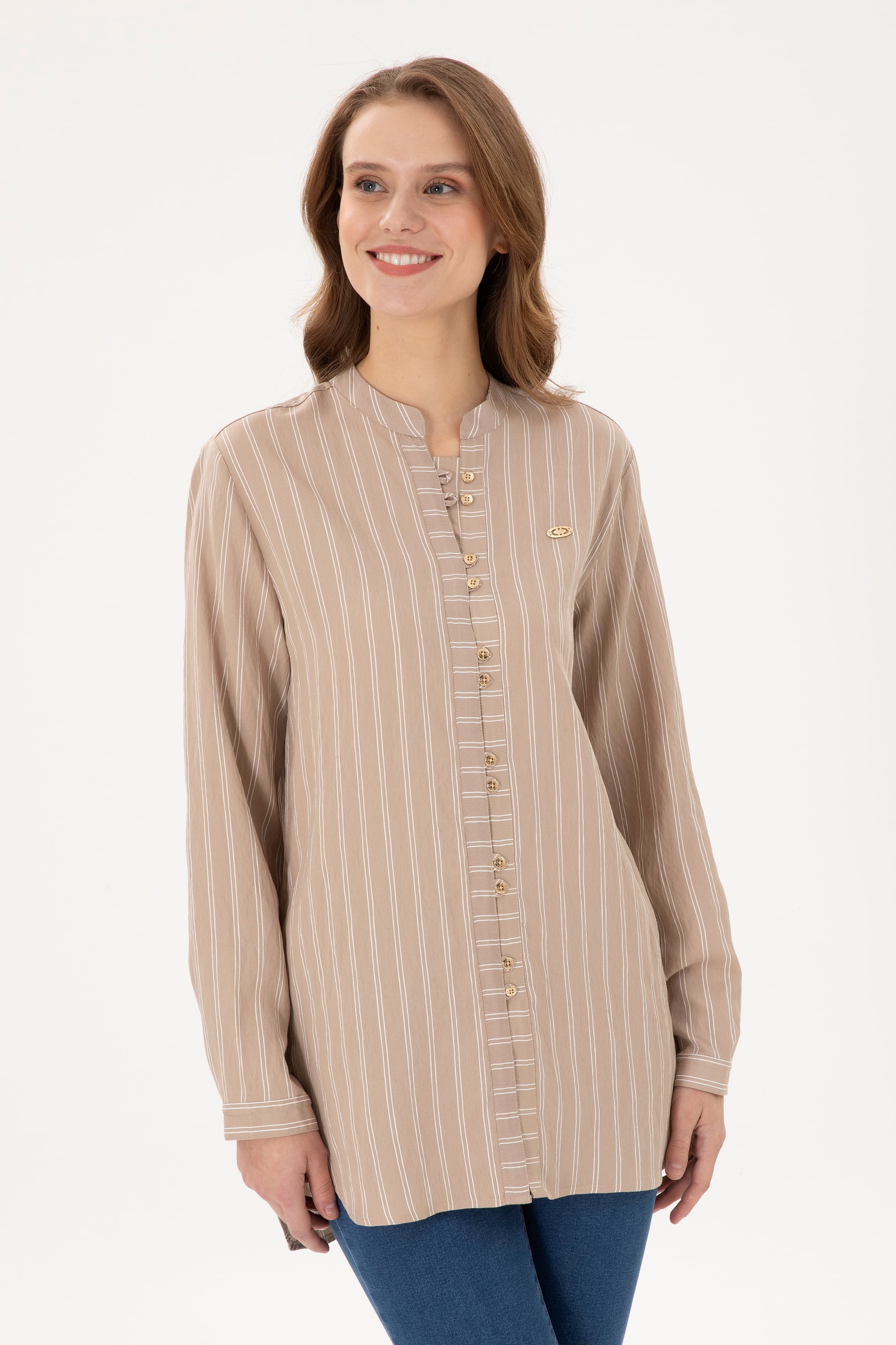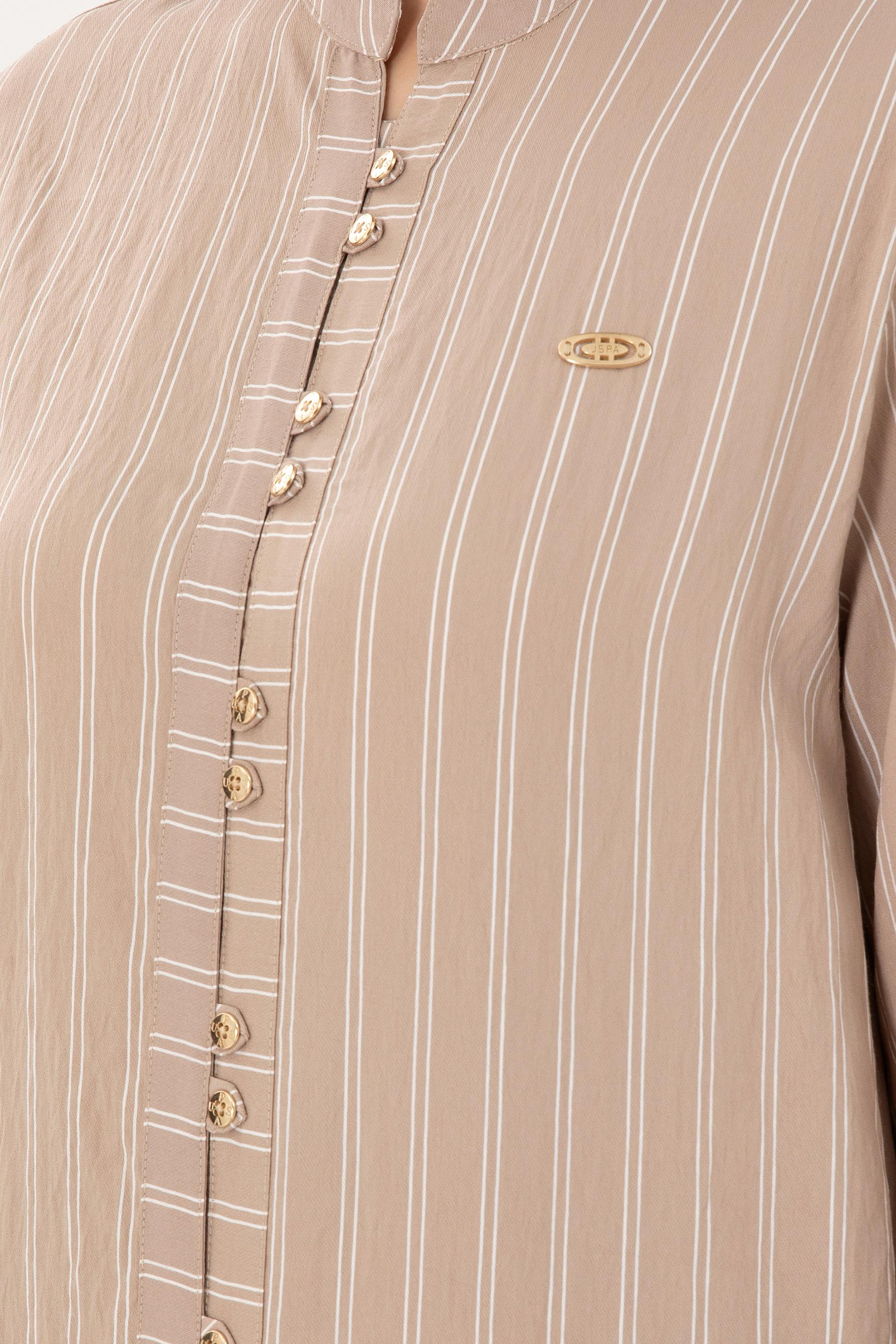 Kadın Kum Uzun Kollu Çizgili Tunik Gömlek