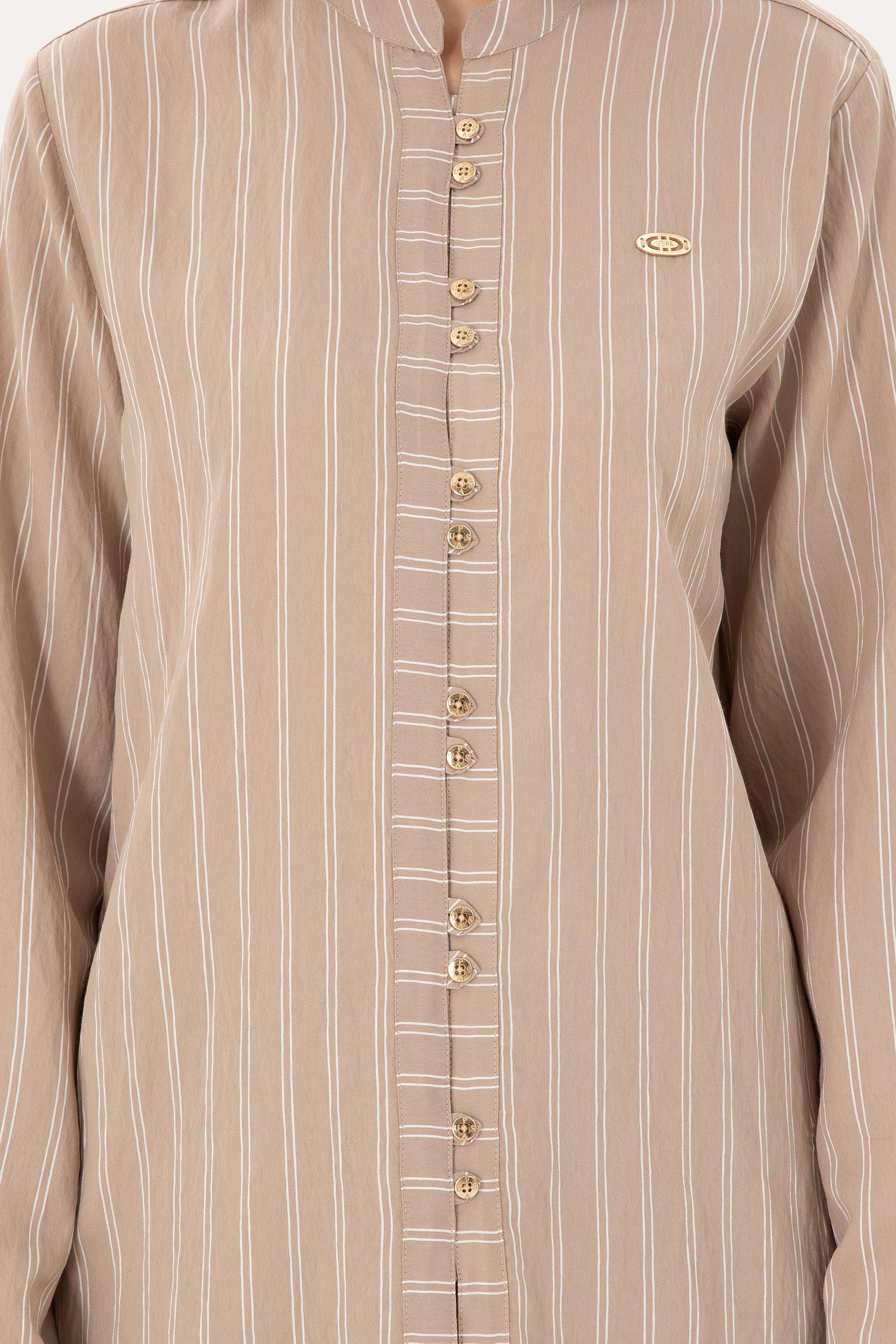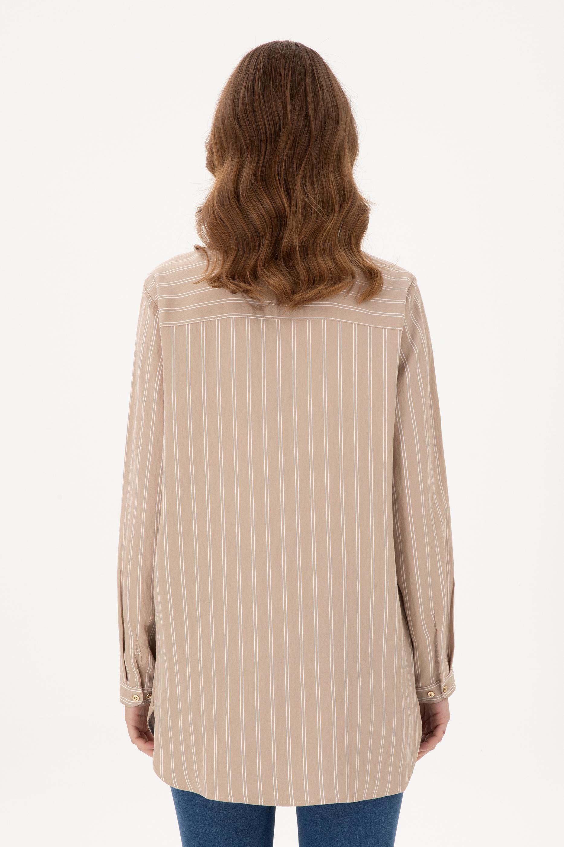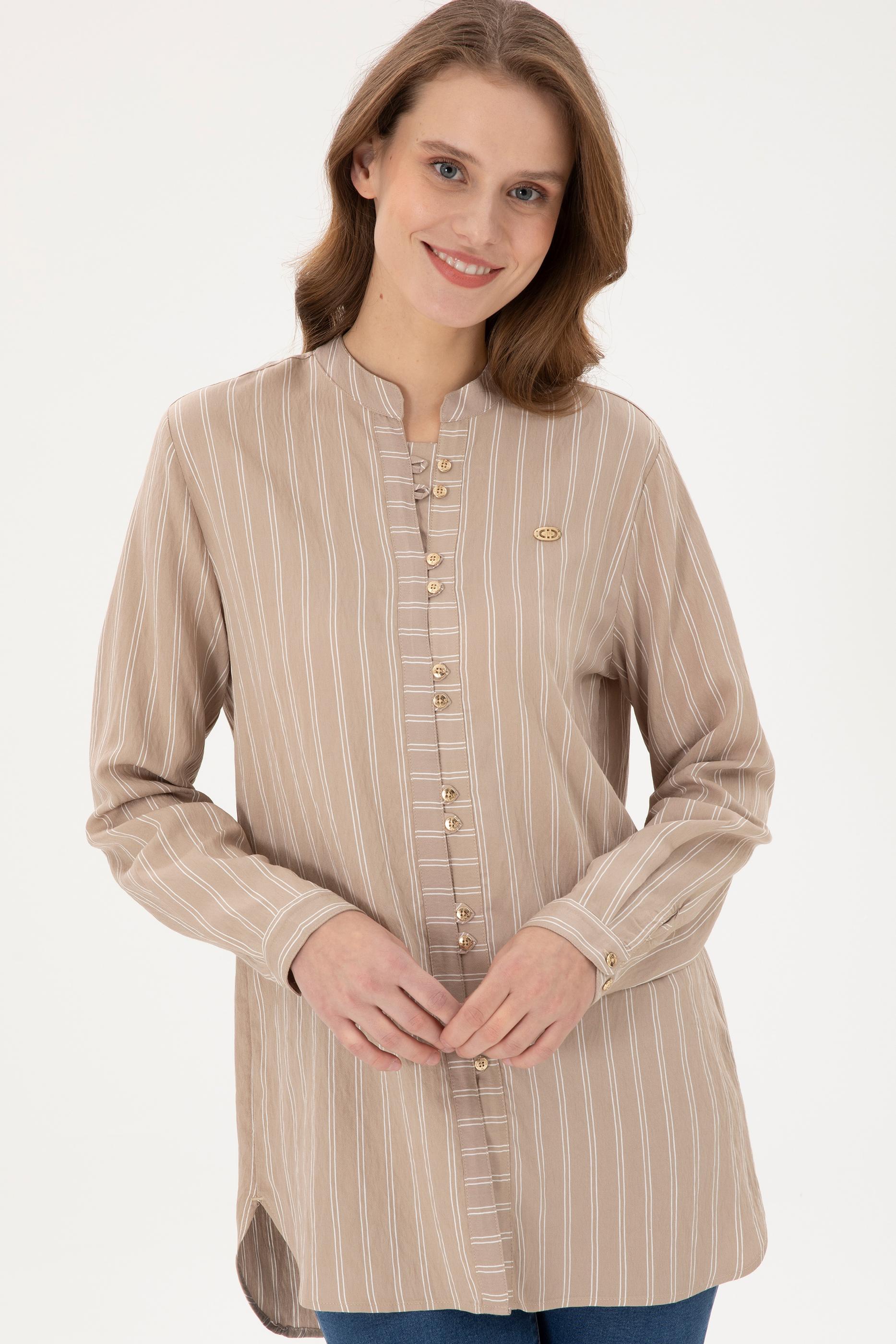Kadın Kum Uzun Kollu Çizgili Tunik Gömlek