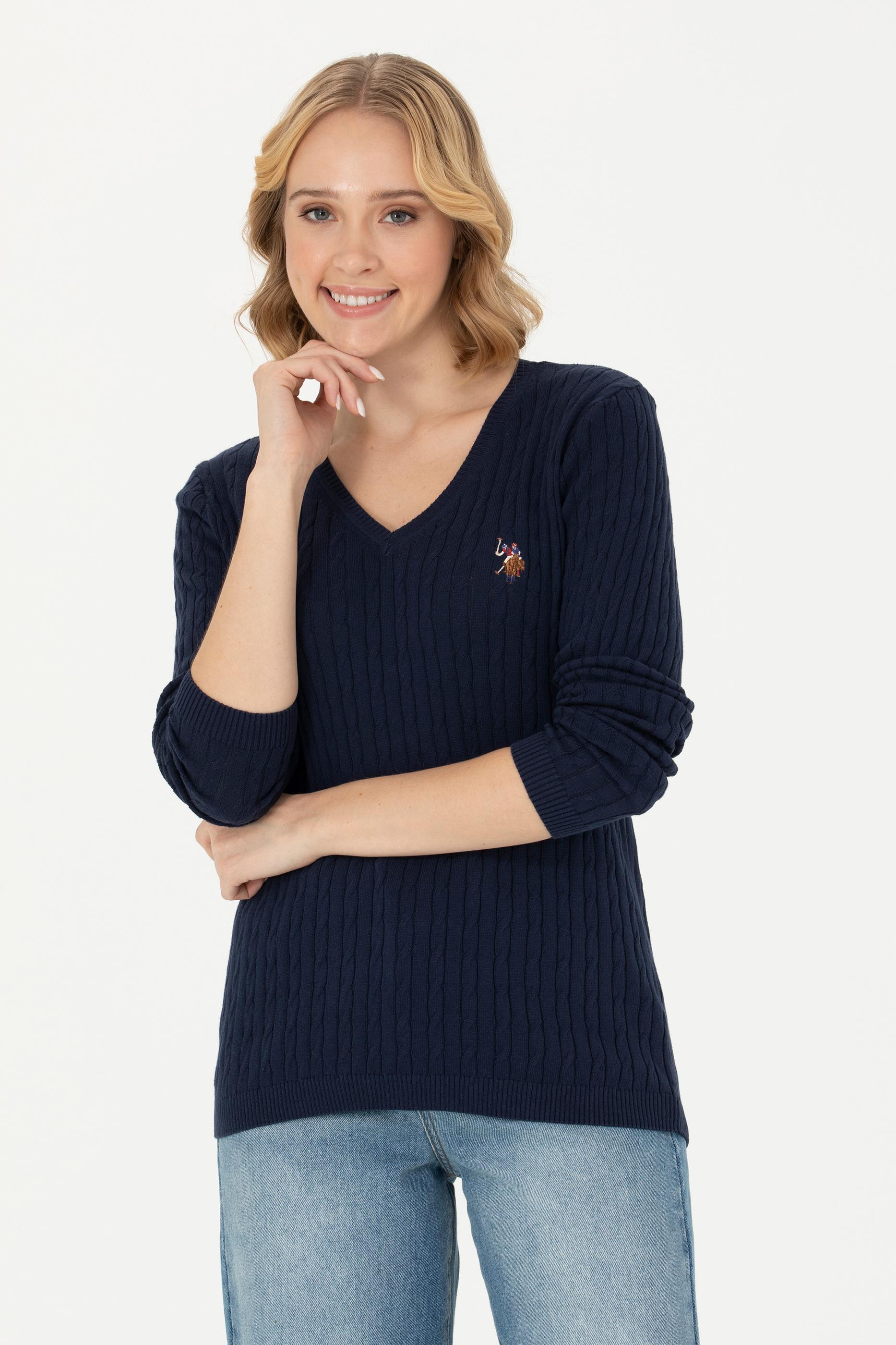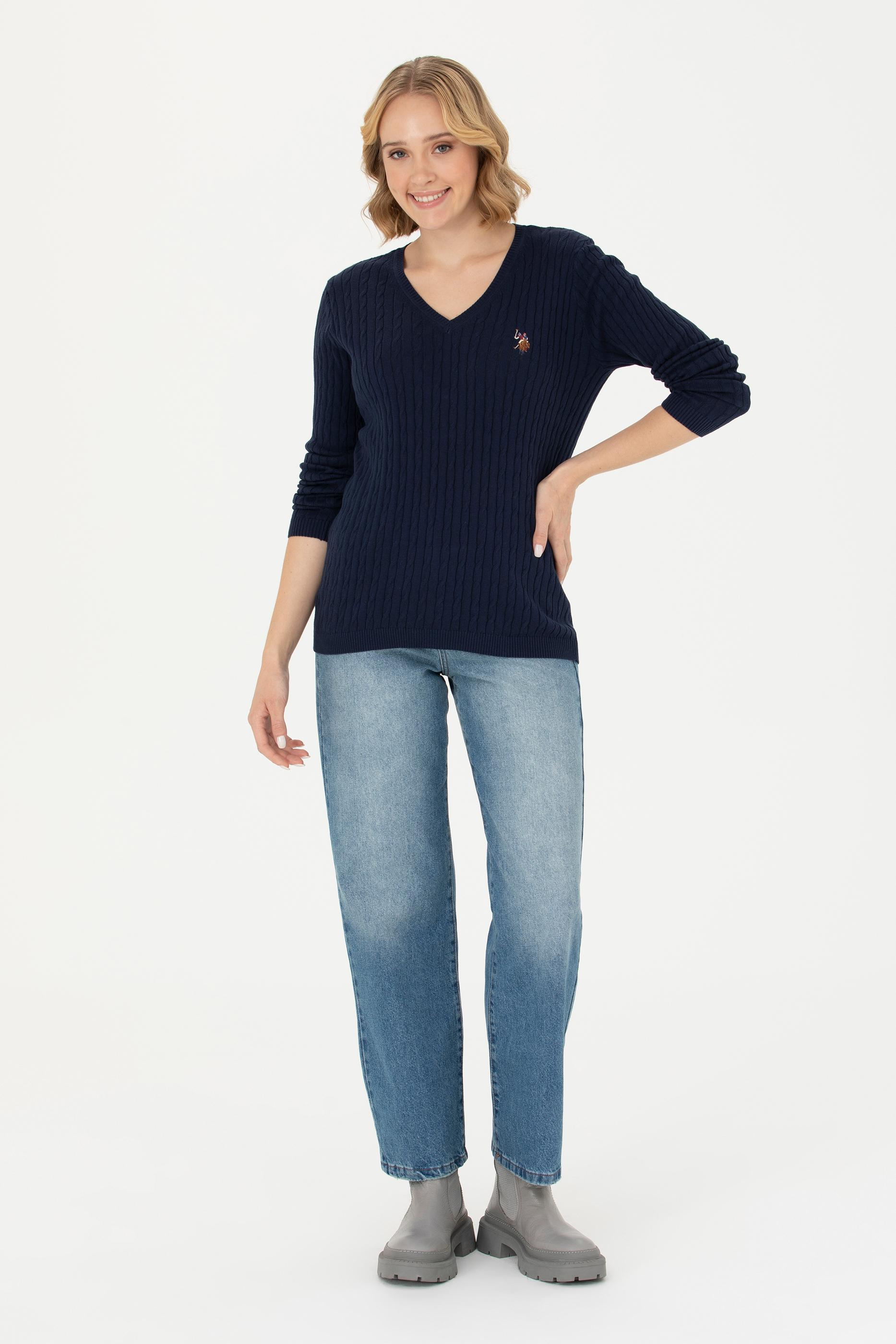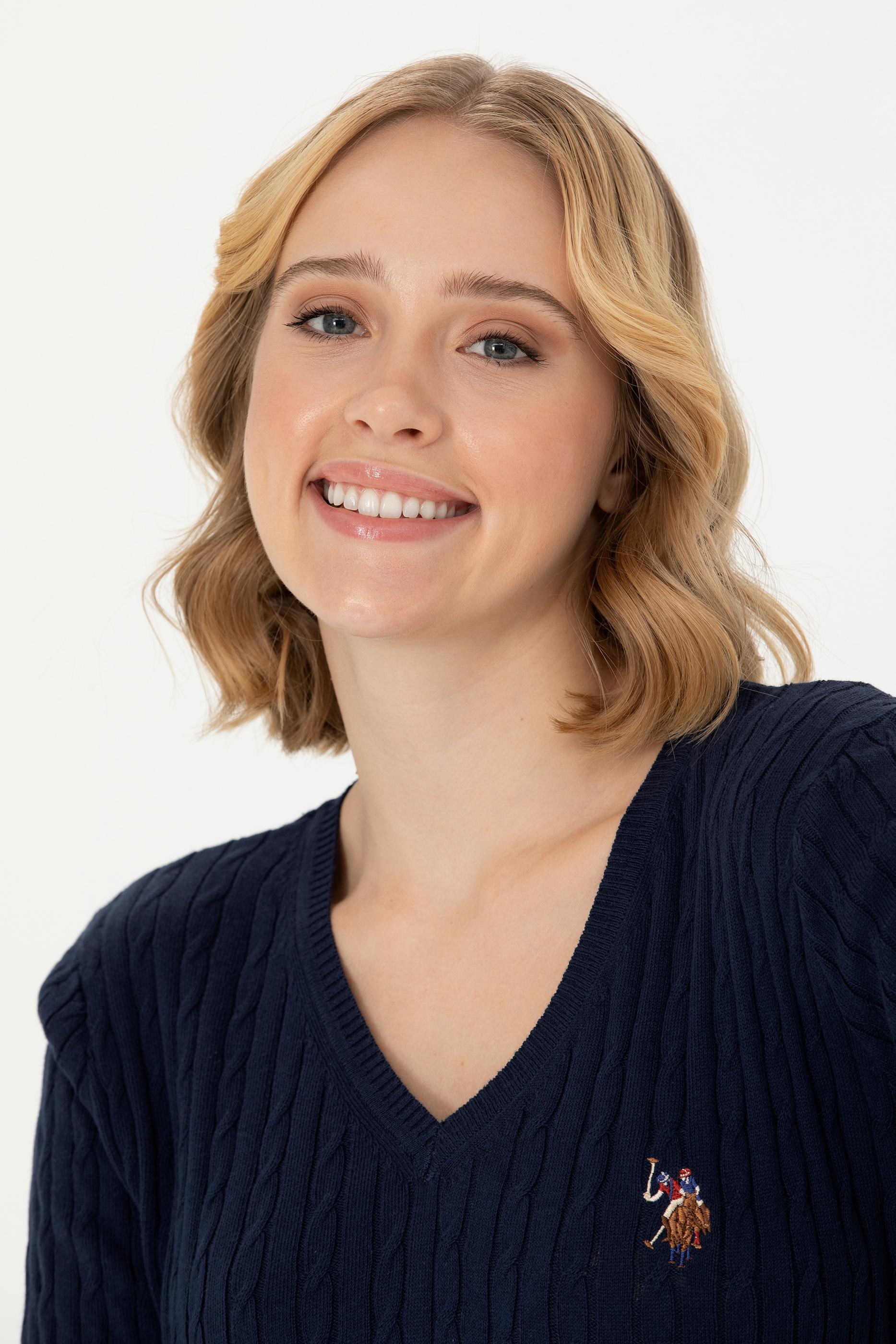 Kadın Lacivert V Yaka Basic Kazak