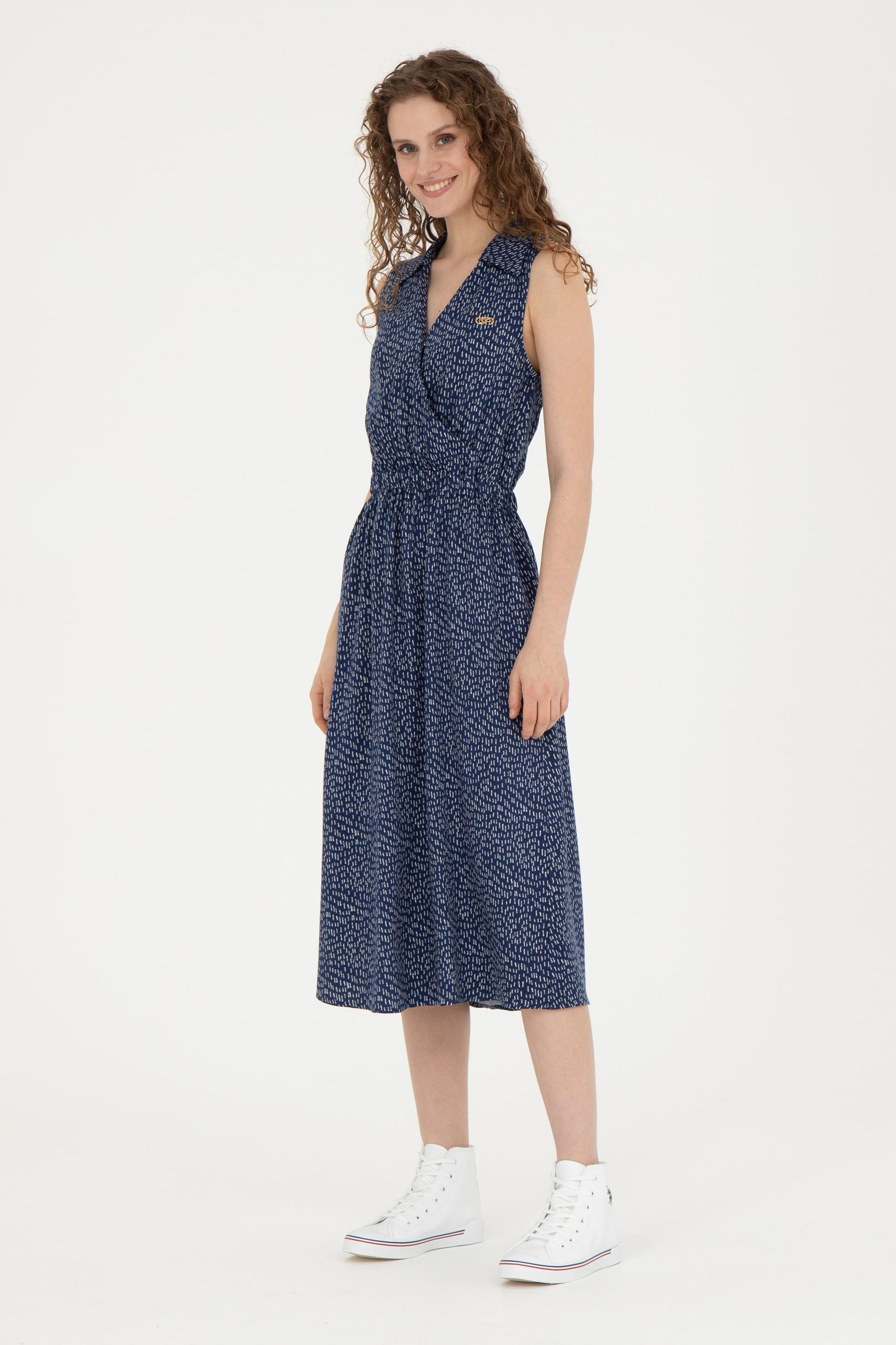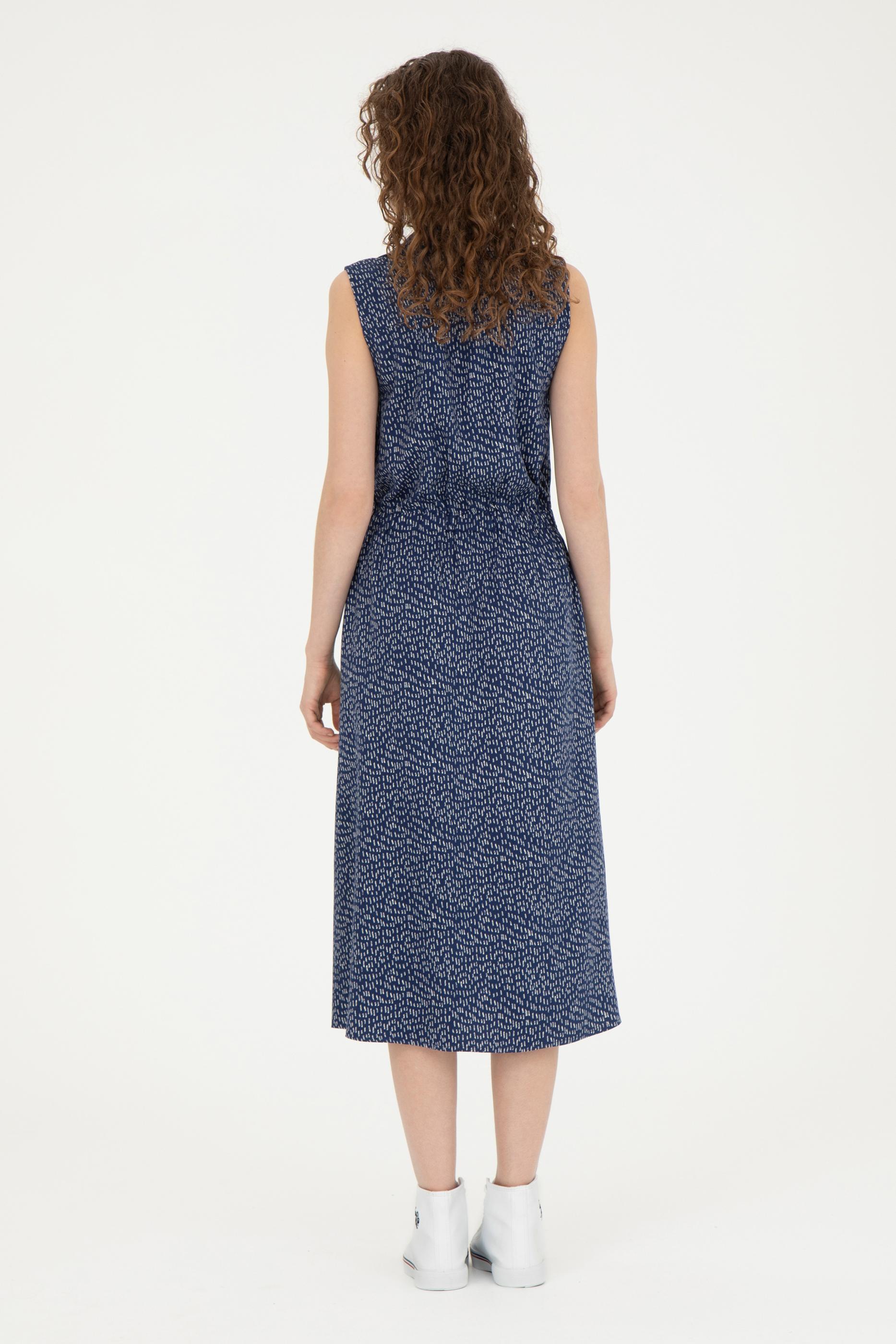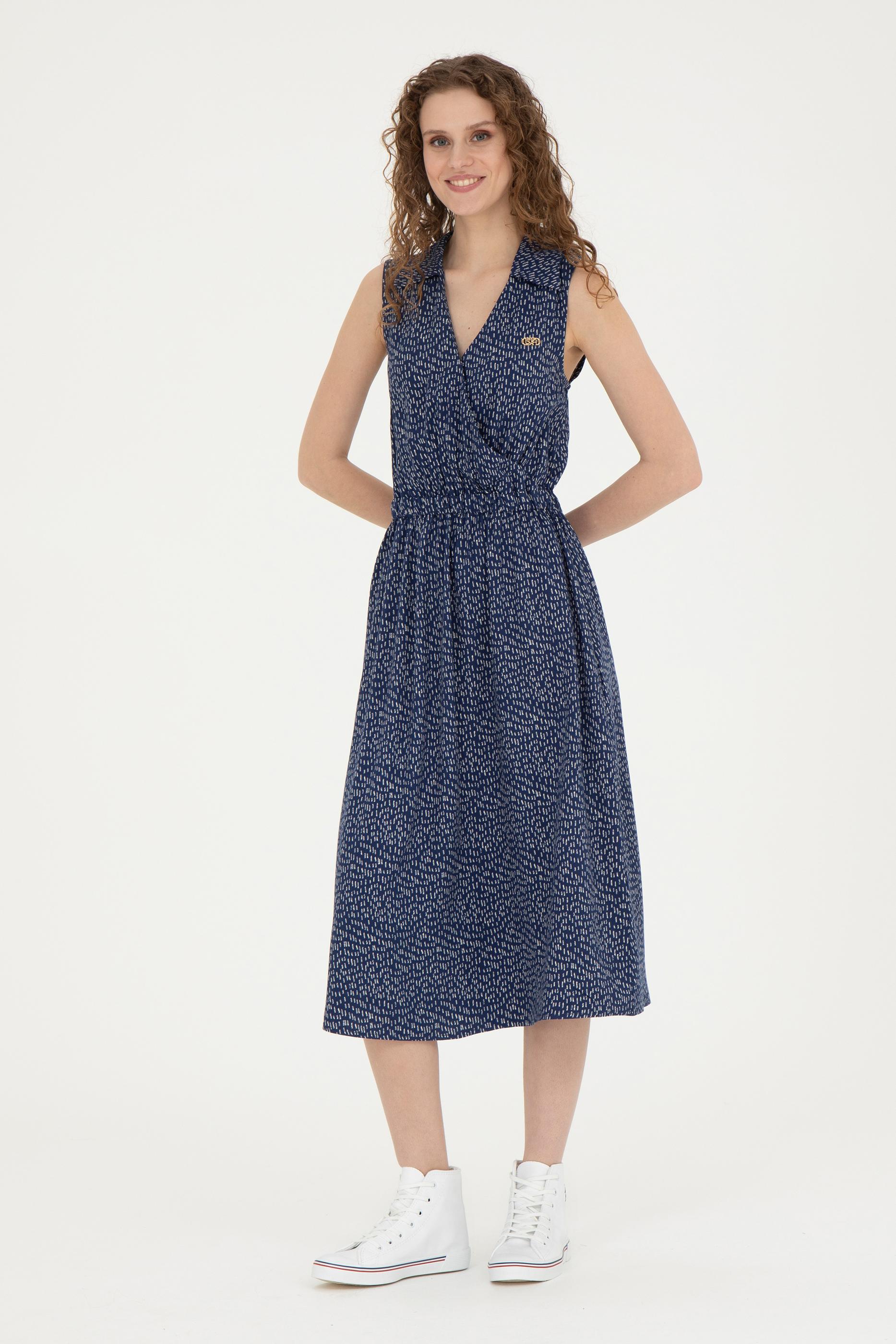 Lacivert desenli V yaka elbise zarif ve rahat bir stil sunar. %100 viskoz kumaşı ile cildinizde yumuşak bir dokunuş hissi yaratır. Nefes alabilir yapısı sayesinde gün boyu rahat hissetmenizi sağlar. Diz altı uzunluğu ve kolsuz tasarımı sıcak havalarda konforlu bir kullanım sunar.