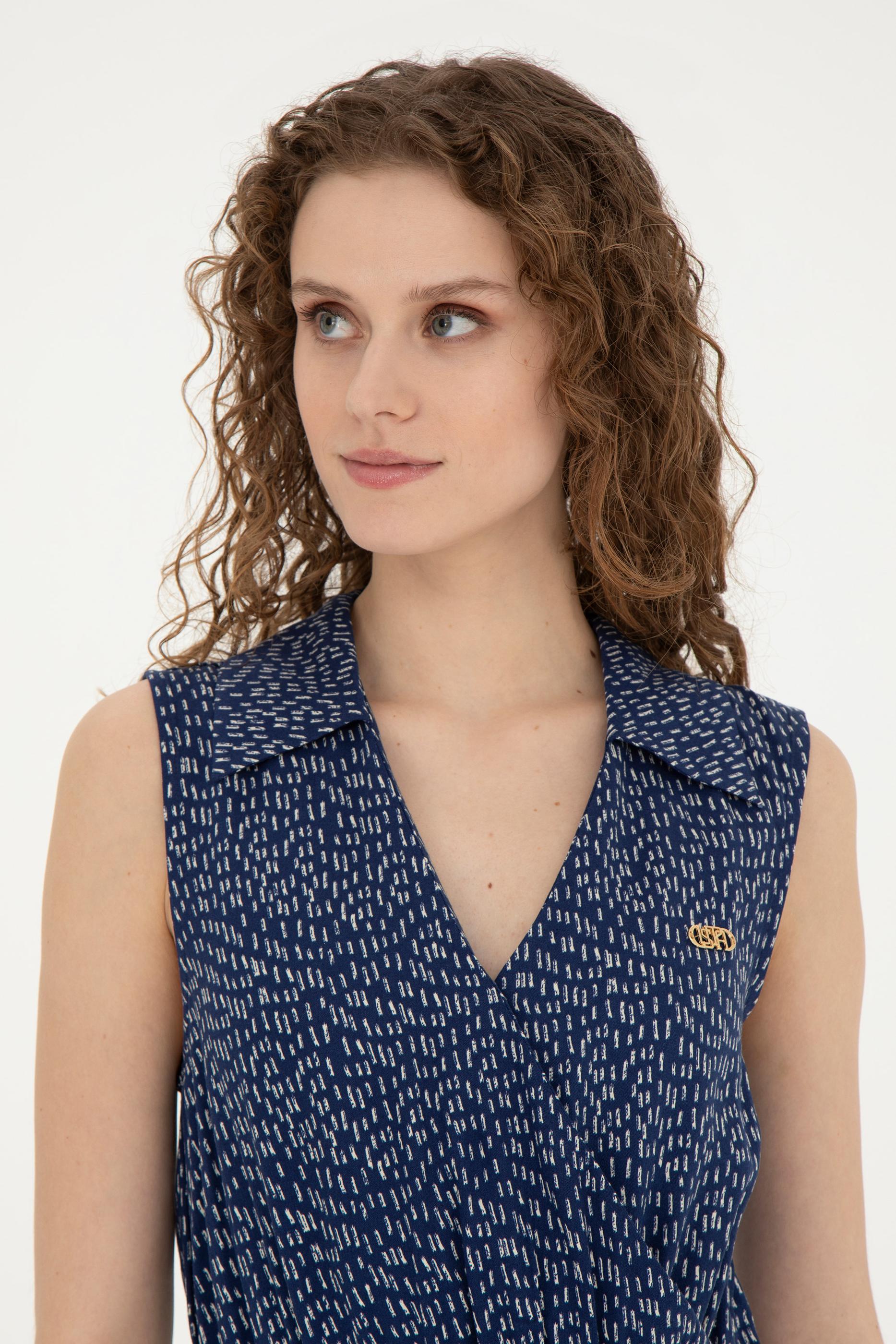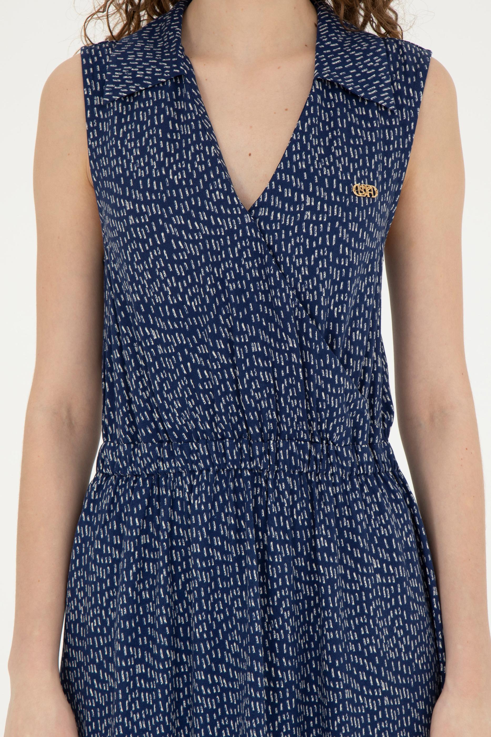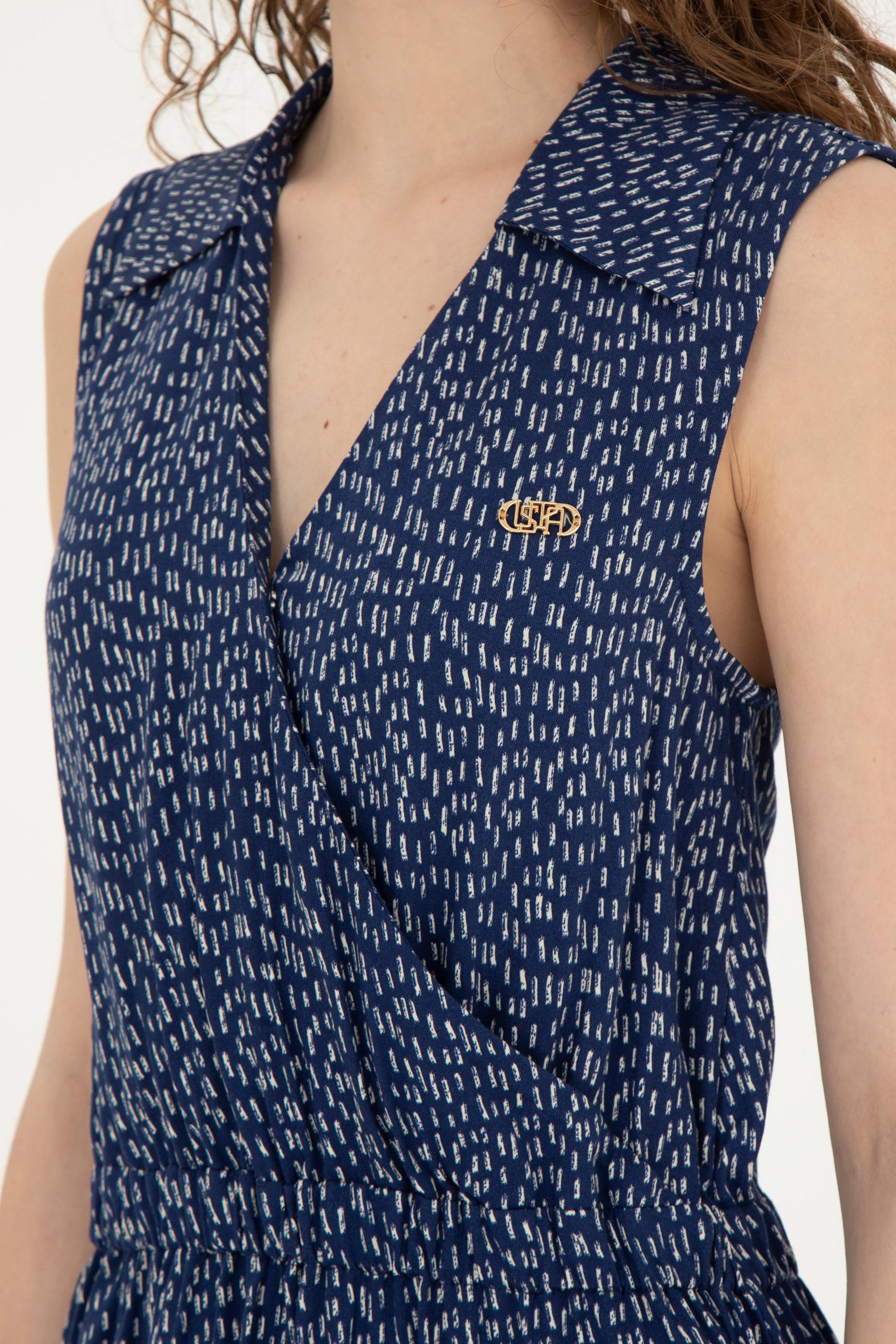 Lacivert desenli V yaka elbise zarif ve rahat bir stil sunar. %100 viskoz kumaşı ile cildinizde yumuşak bir dokunuş hissi yaratır. Nefes alabilir yapısı sayesinde gün boyu rahat hissetmenizi sağlar. Diz altı uzunluğu ve kolsuz tasarımı sıcak havalarda konforlu bir kullanım sunar.
