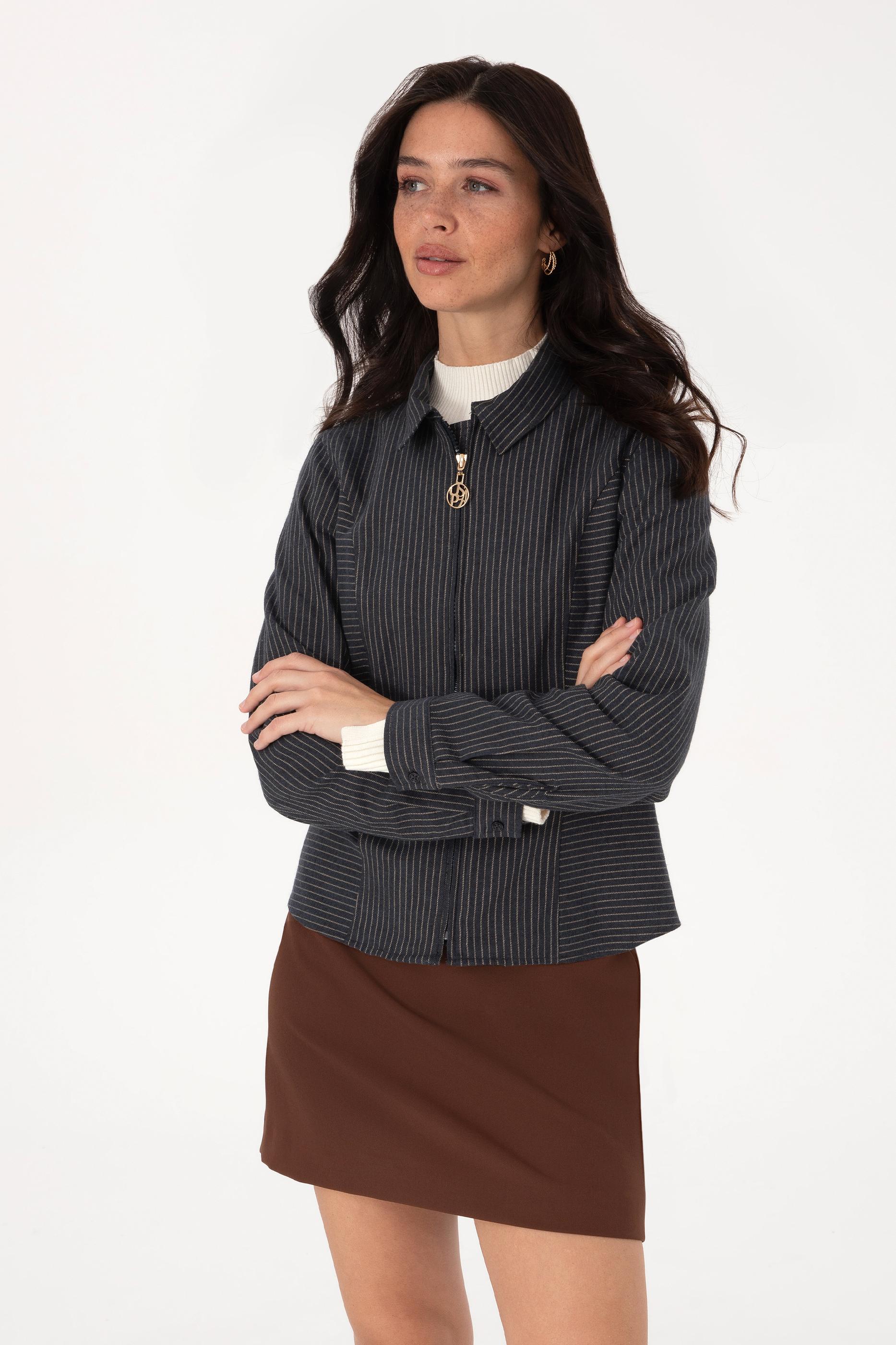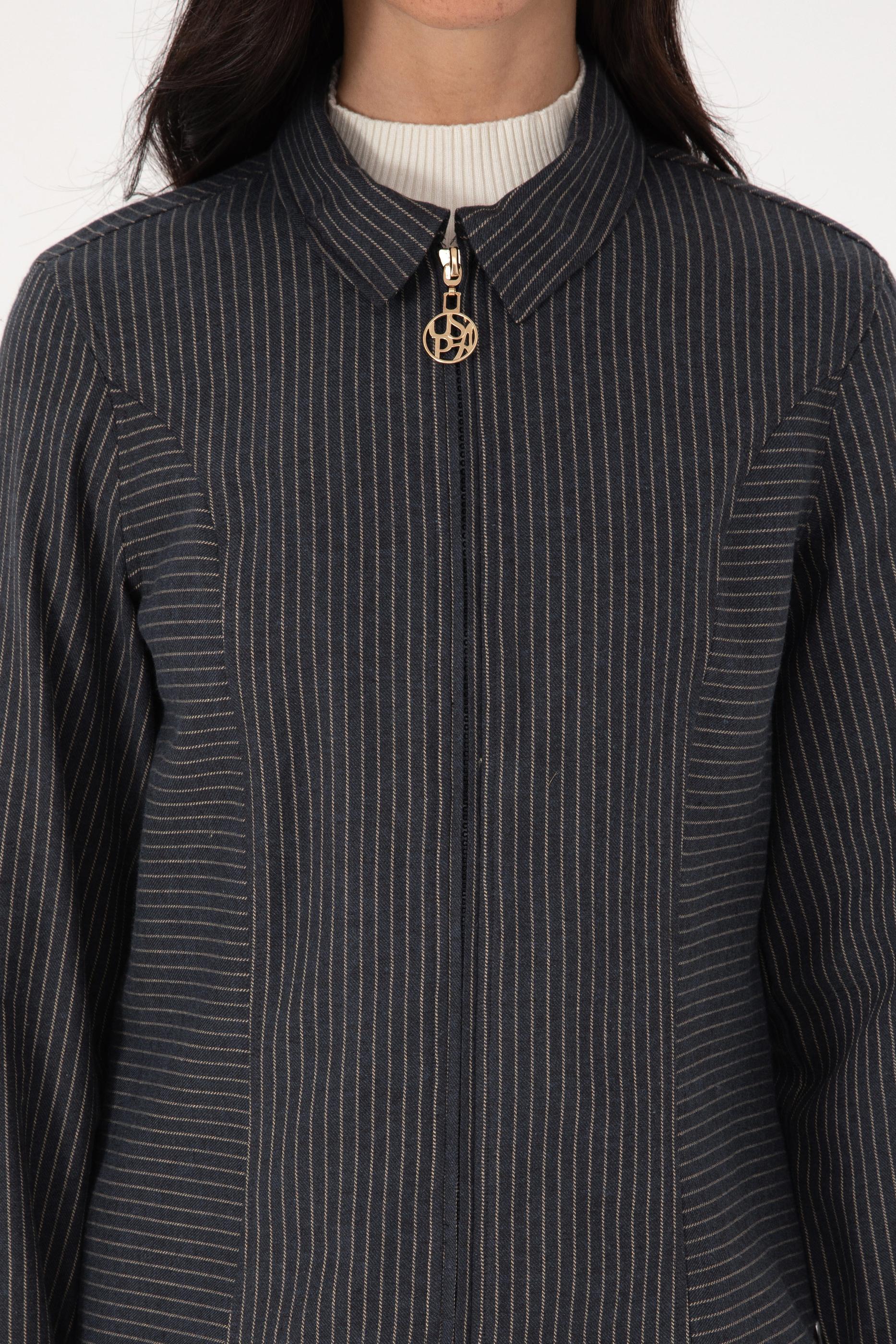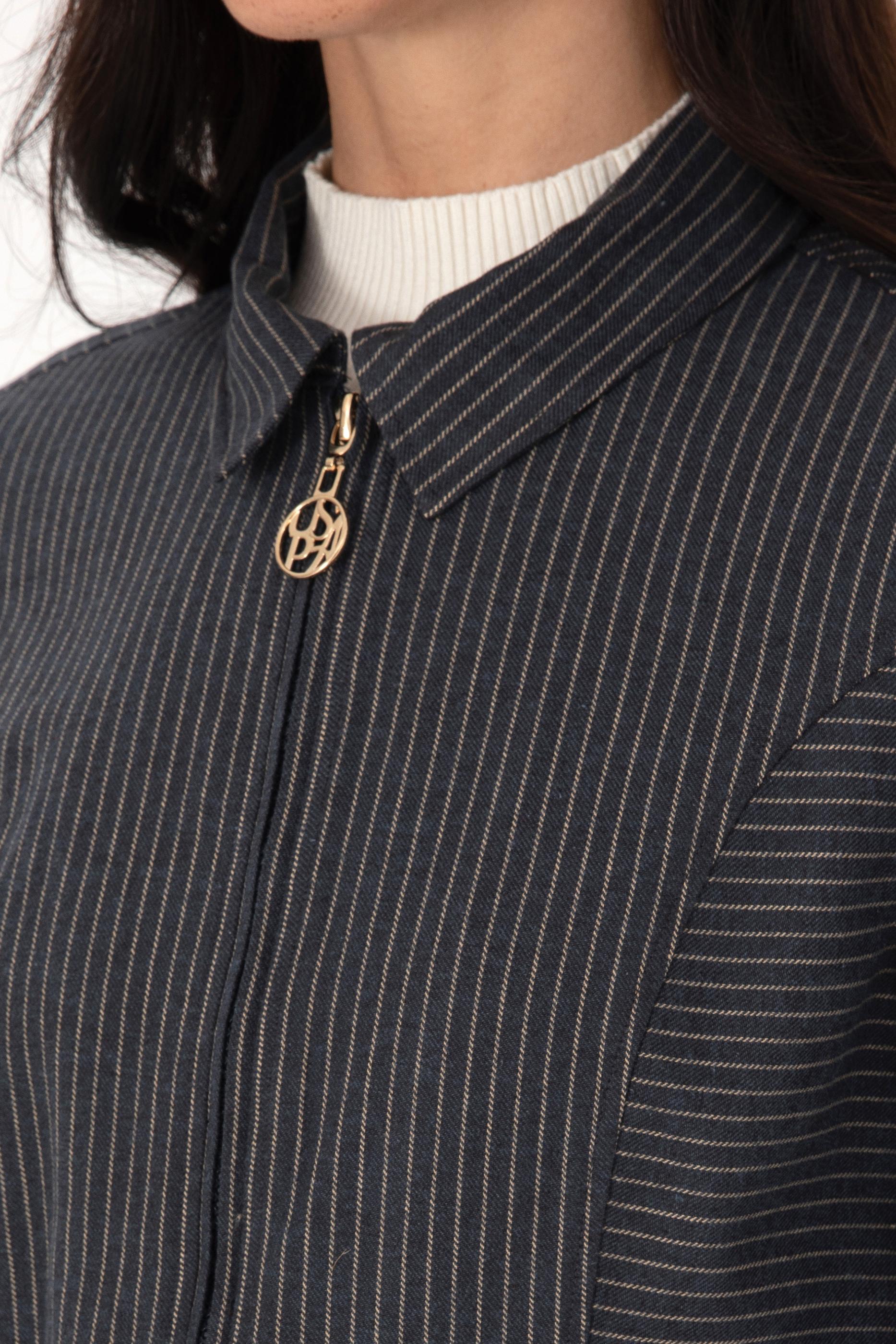 Kadın Lacivert Çizgili Fermuarlı Dokuma Gömlek