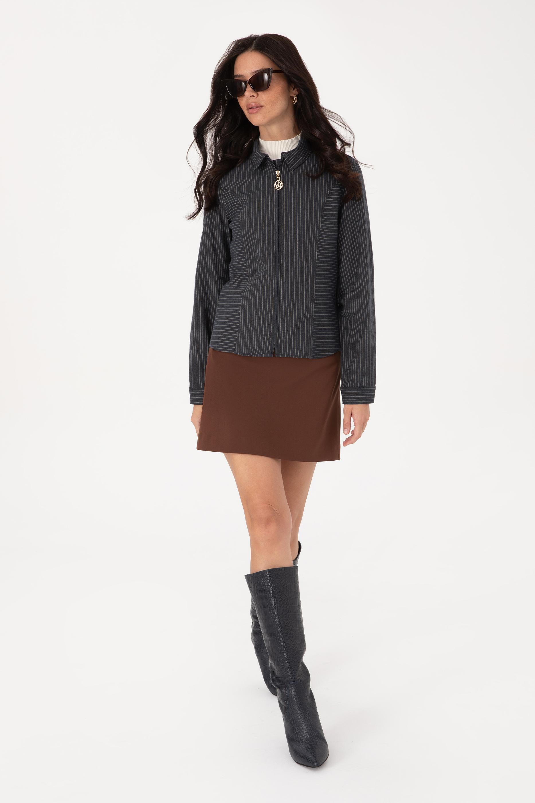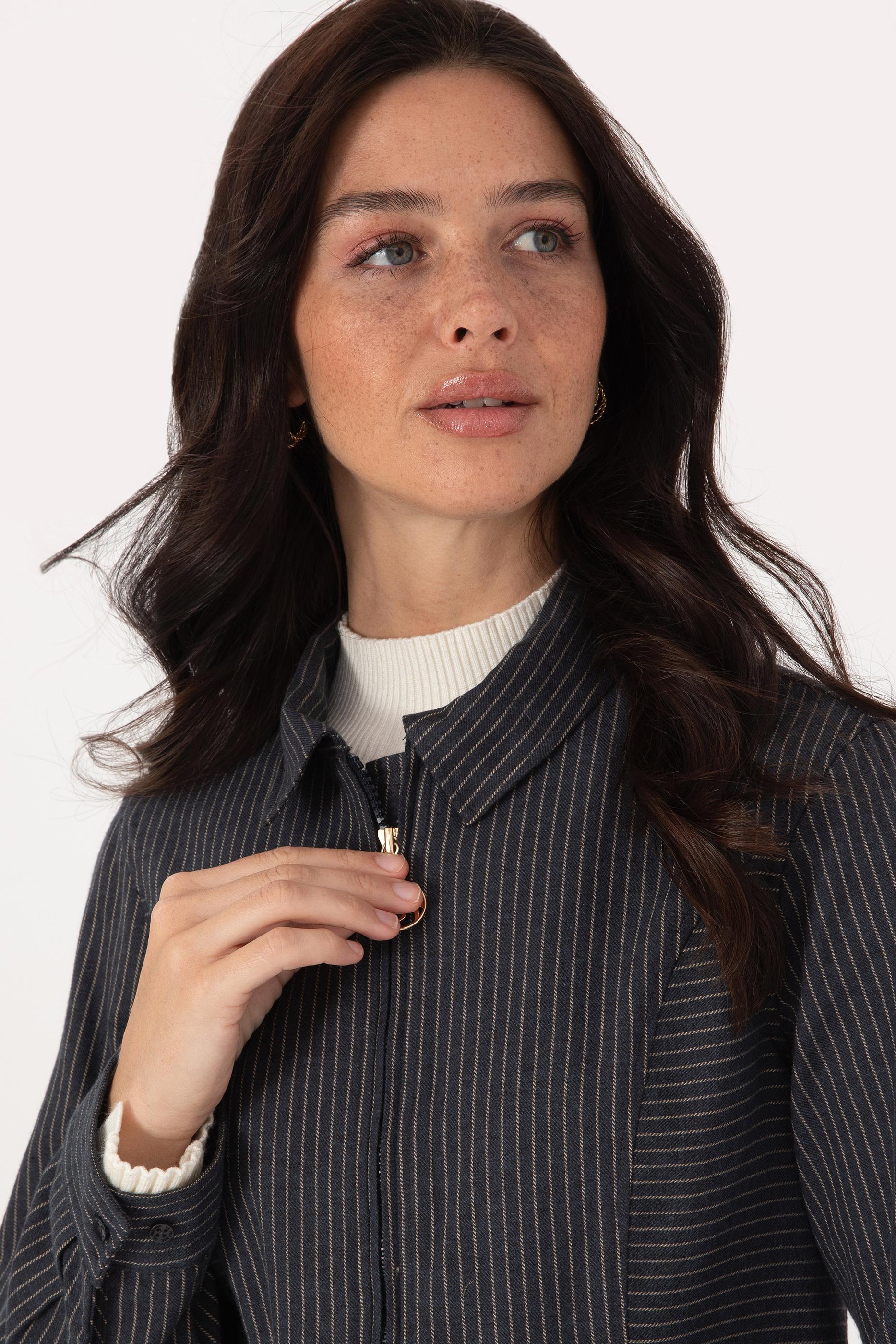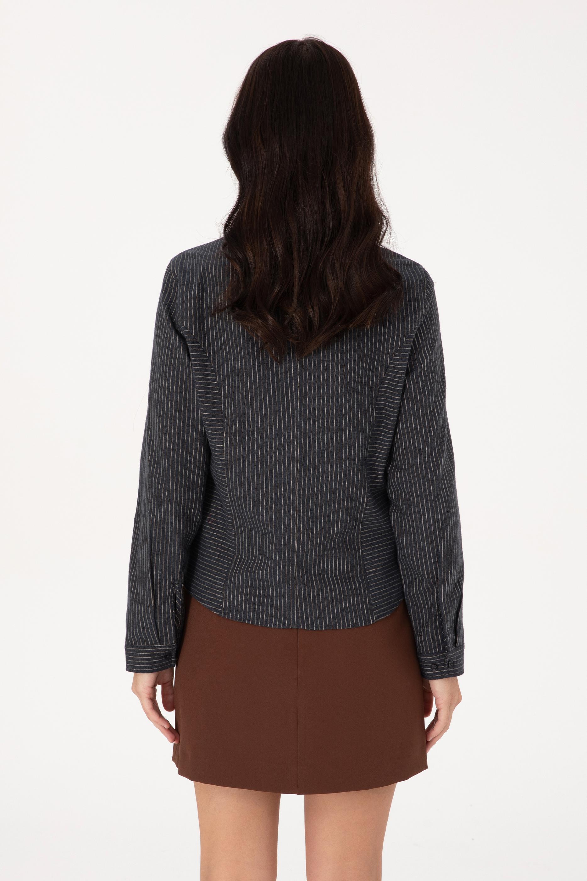 Kadın Lacivert Çizgili Fermuarlı Dokuma Gömlek