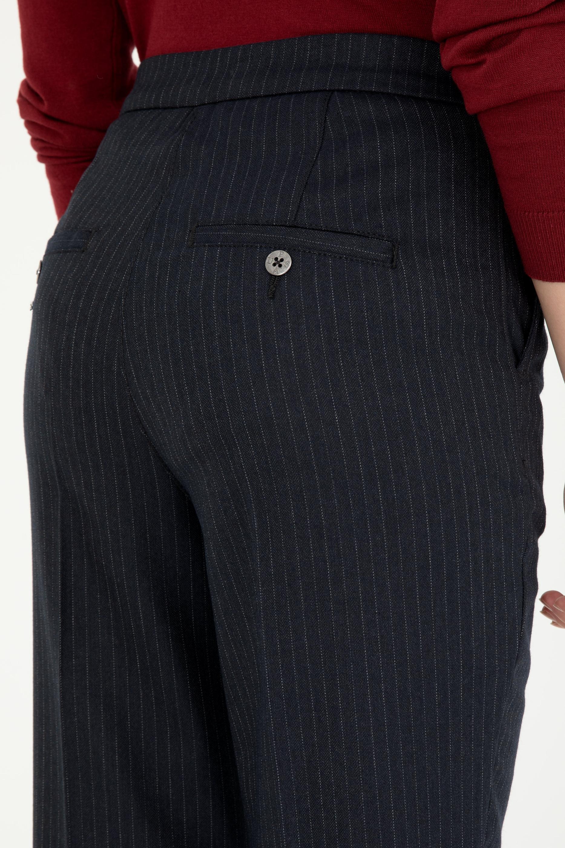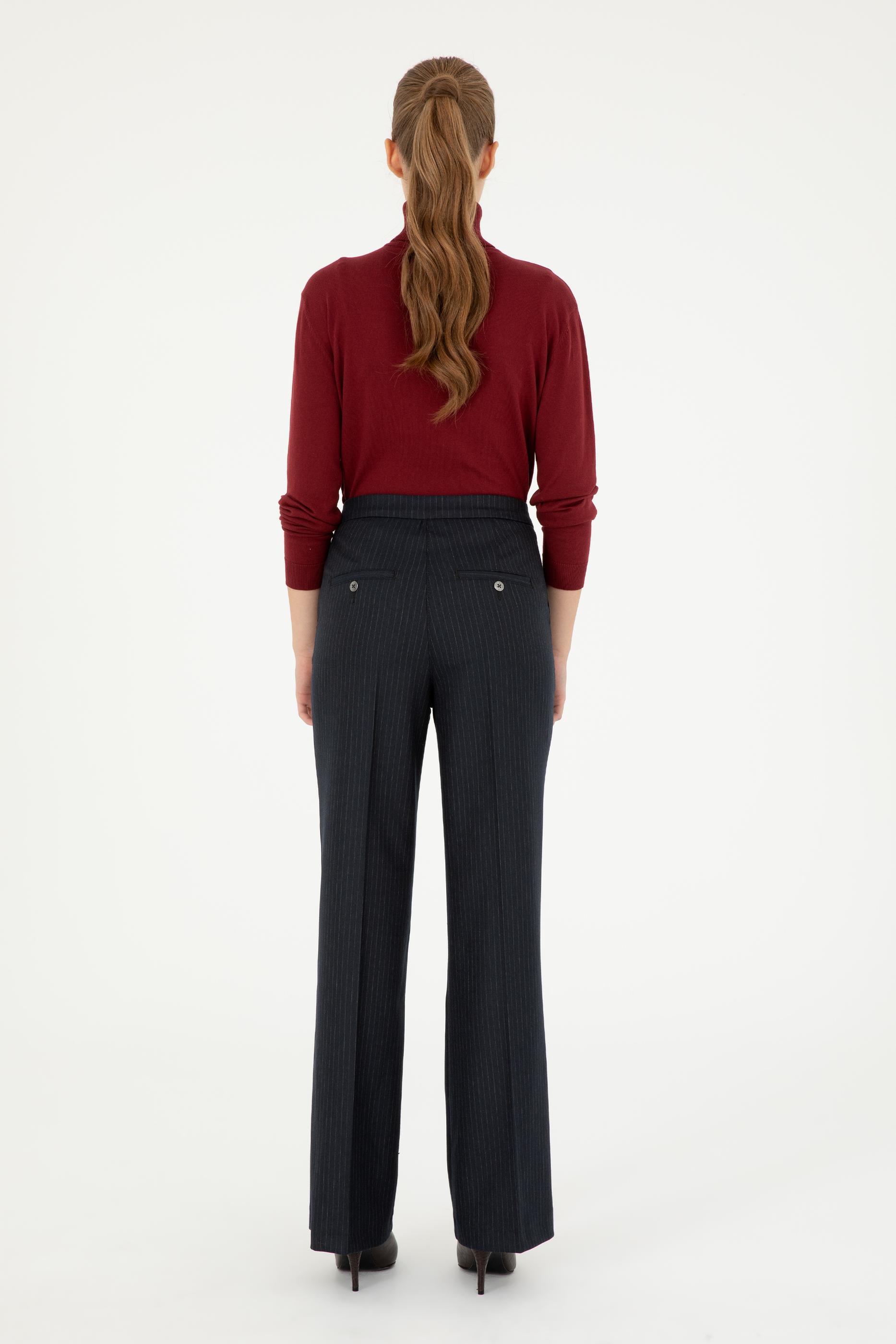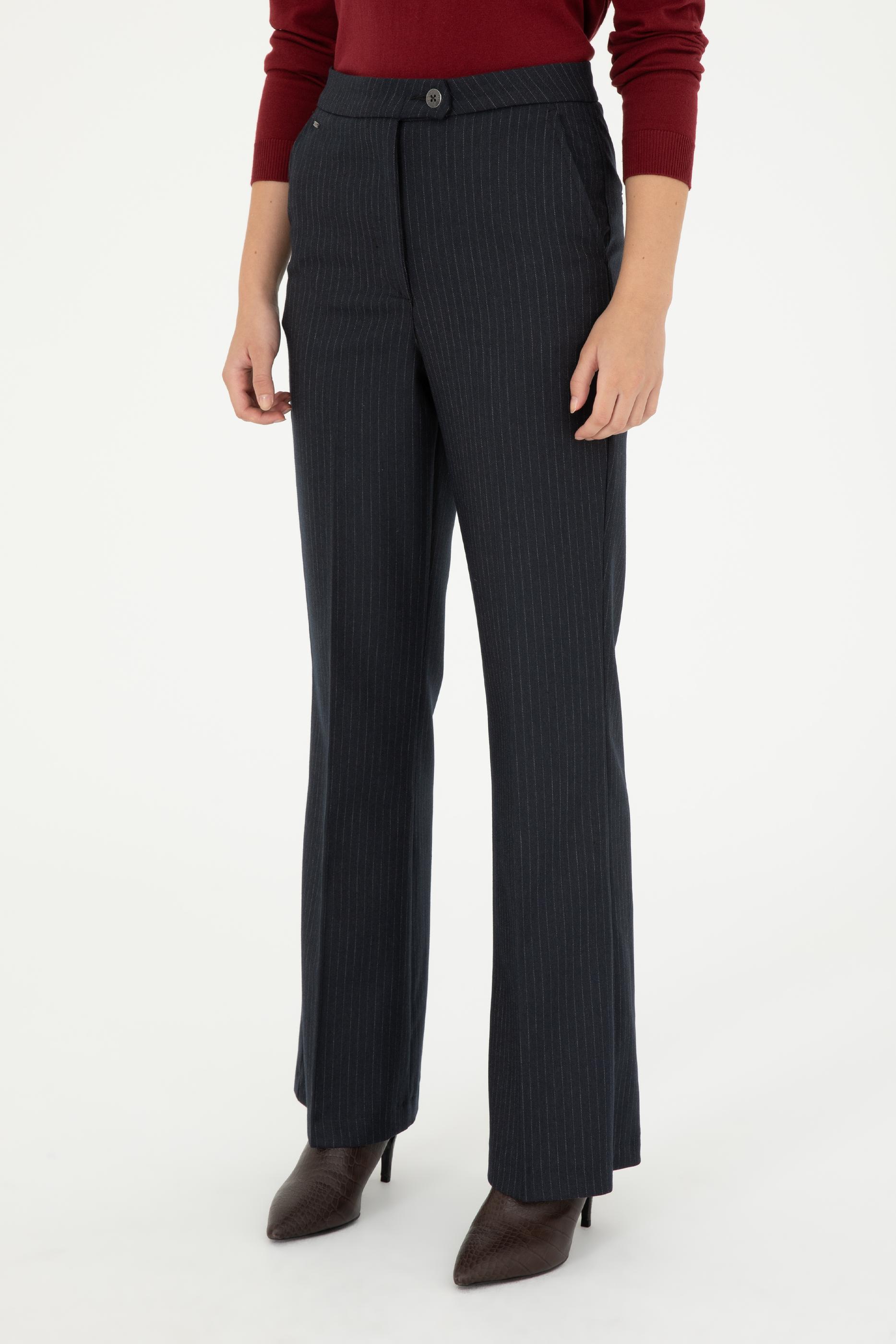 - Kadın Lacivert Çizgili Slim Flare Fit Kanvas Pantolon