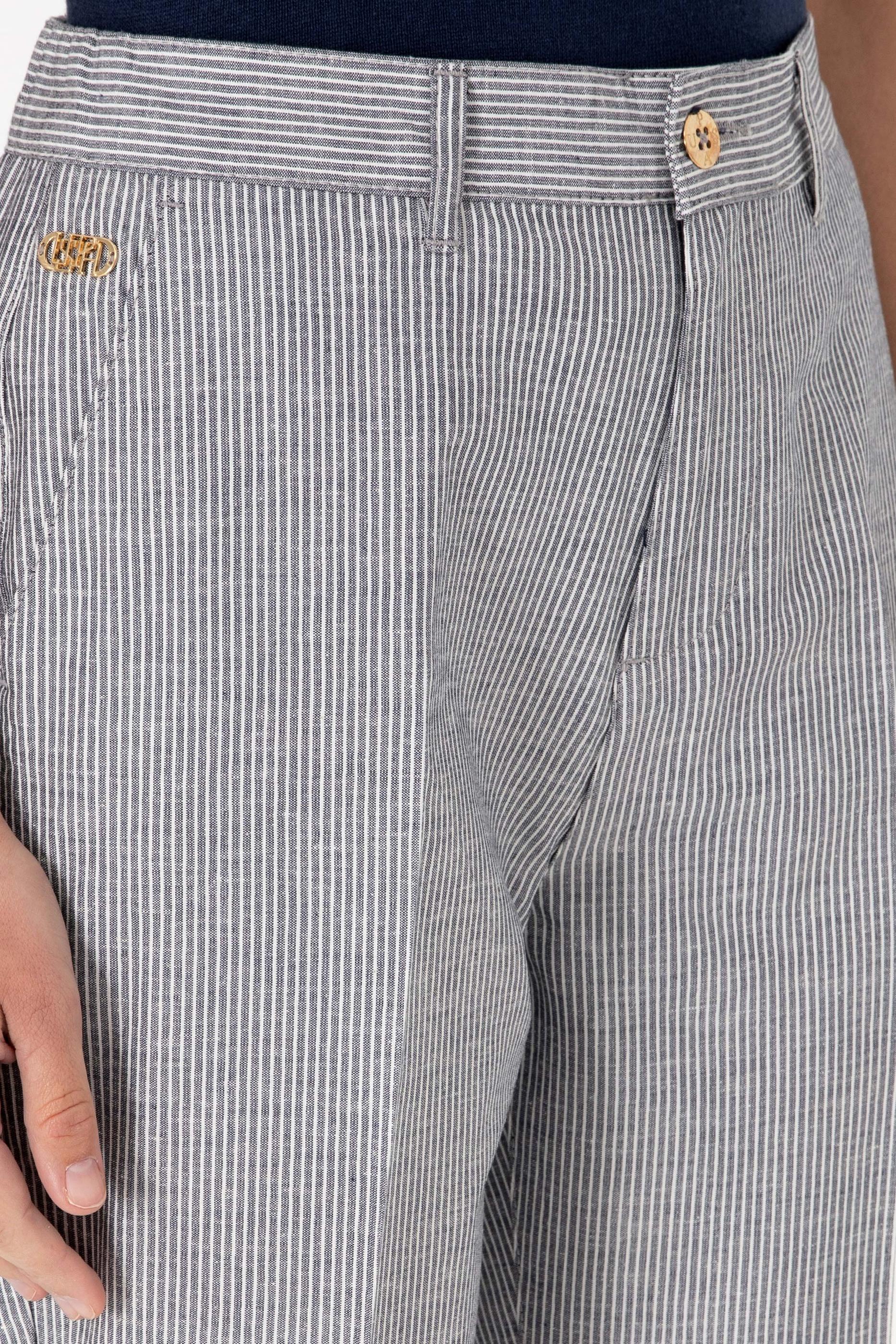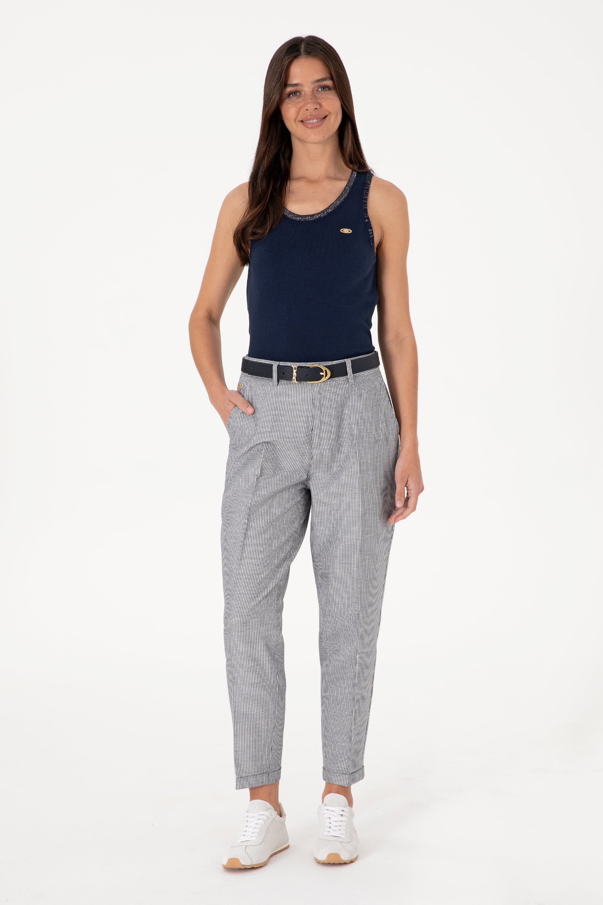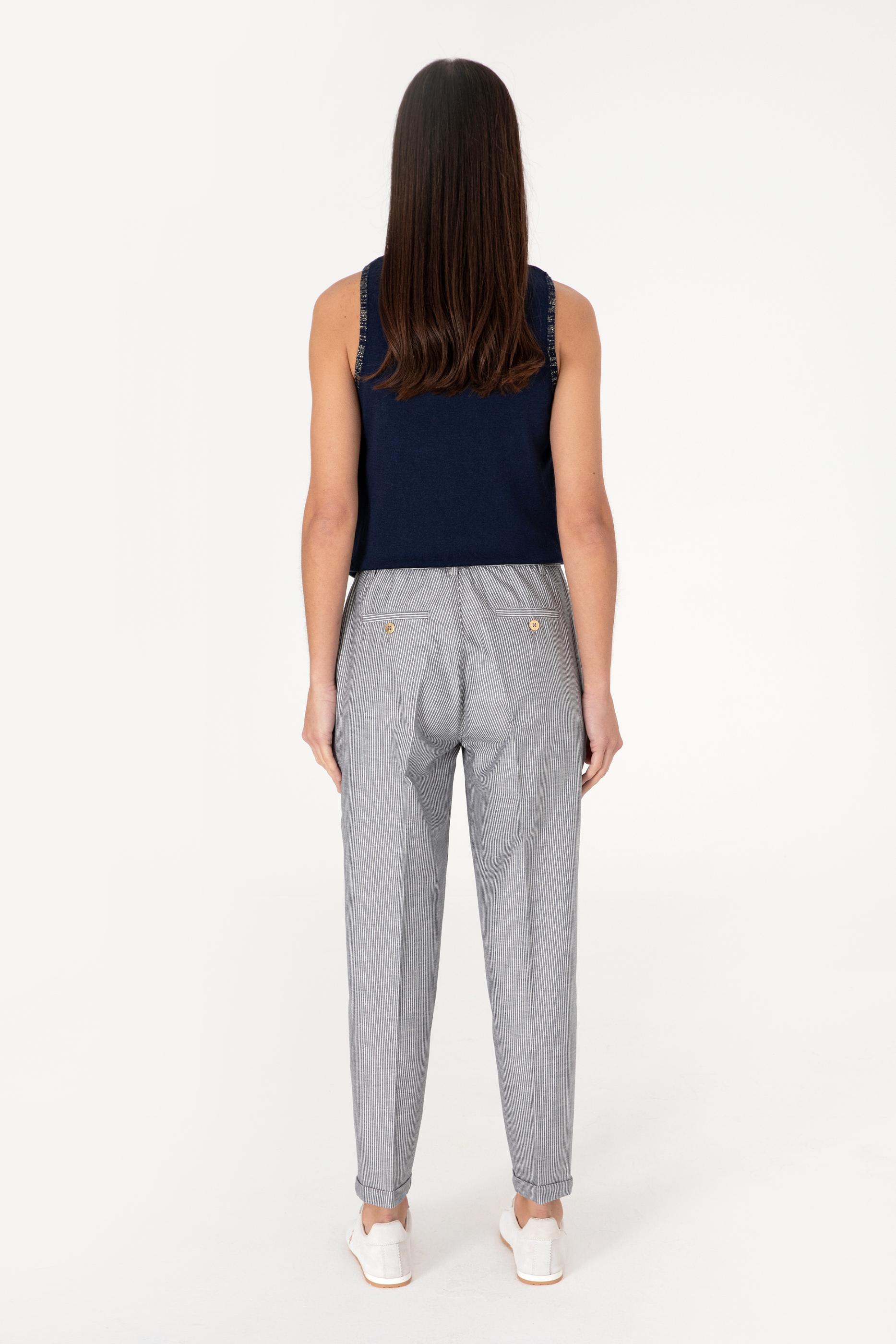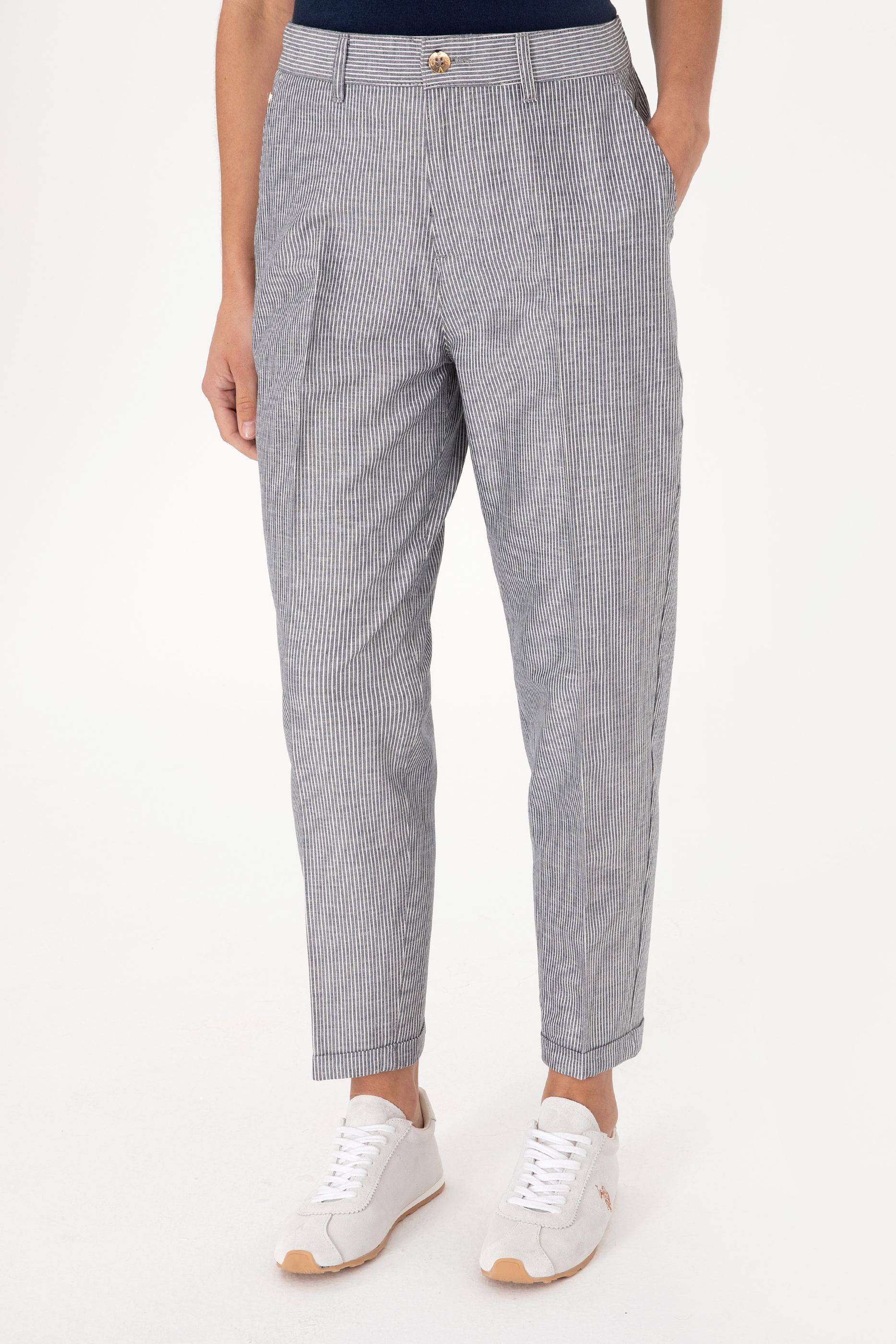 Kadın Lacivert Çizgili Keten Karışımlı Carrot Fit Kanvas Pantolon