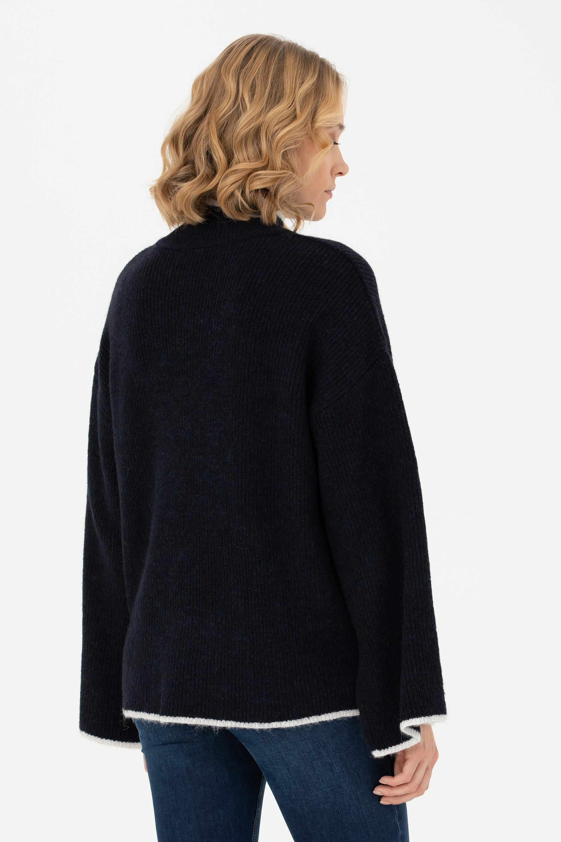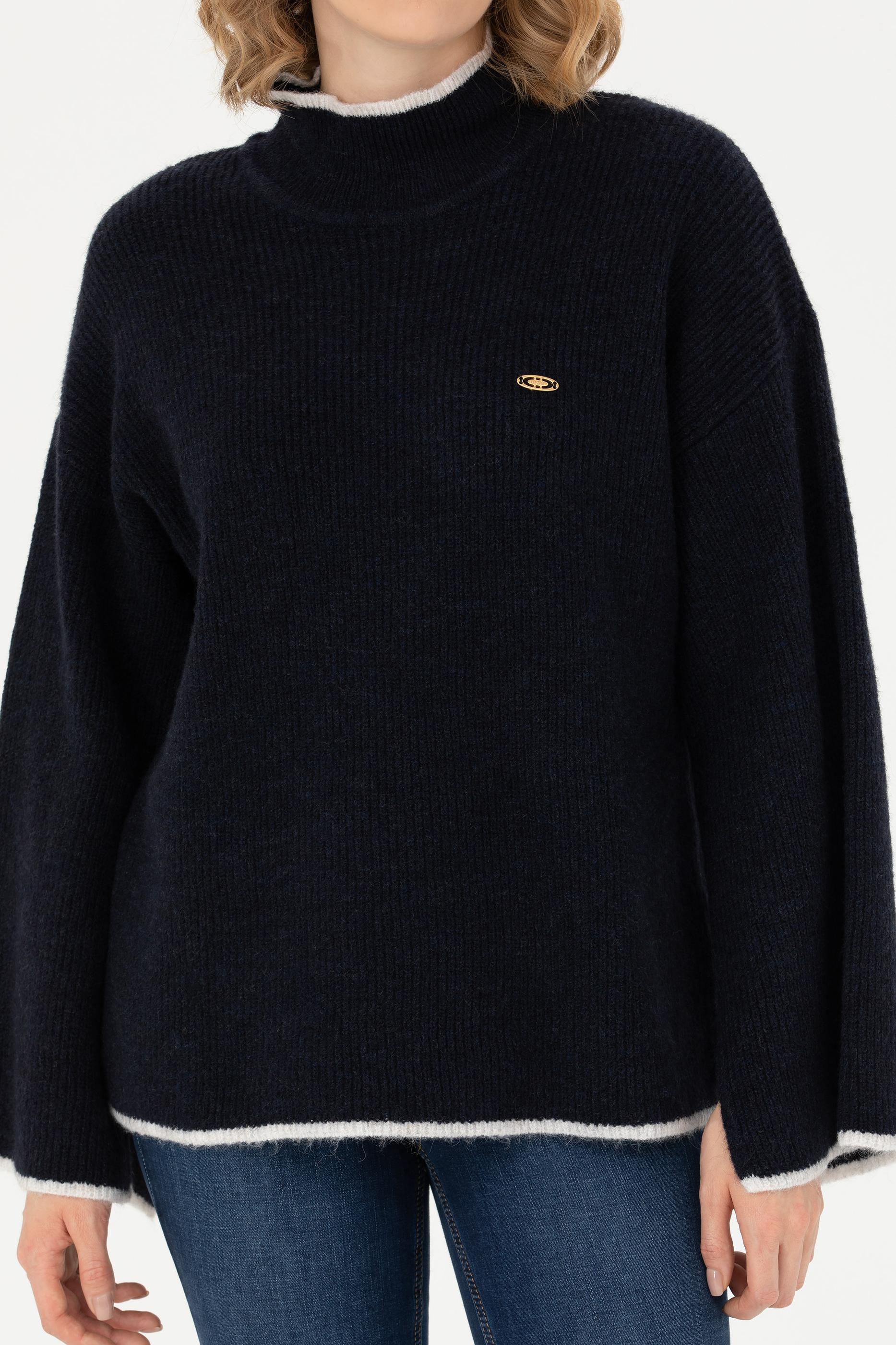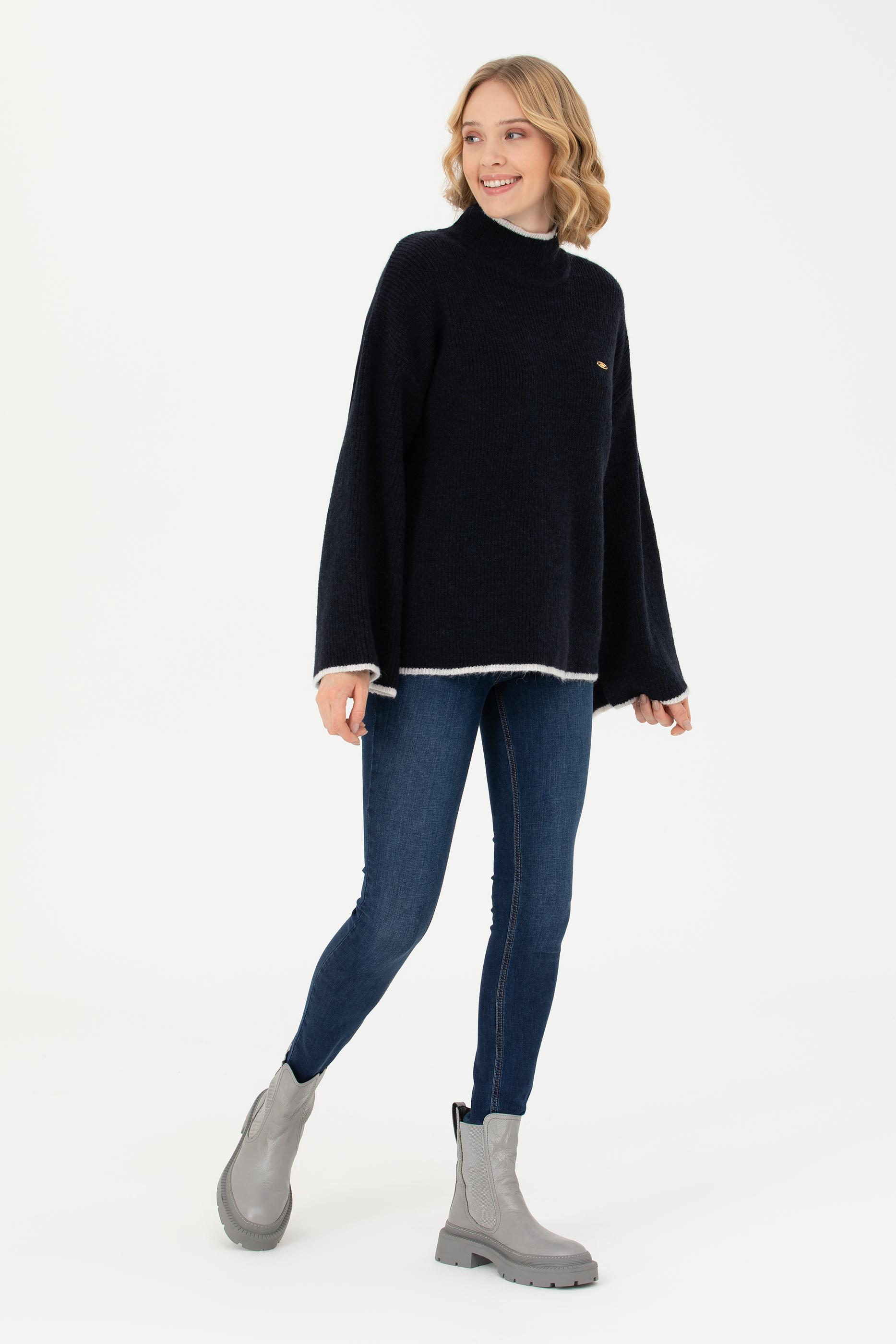 İnce detaylarla son derece şık ve göz alıcı bir parça haline gelen comfort fit kadın triko kazak modelimiz dik yakalıdır. Manşet kısmından yukarı doğru ilerleyen yırtmaç kol eklemesine sahip modelimiz, stil sahibi kadınların vazgeçilmezlerinden biridir. Polyester karışımlı iplikler kullanarak ürettiğimiz ve torba yaka forma sahip kadın triko kazak modelimize tek tıkla, sadece Online’da ulaşabilirsiniz.
