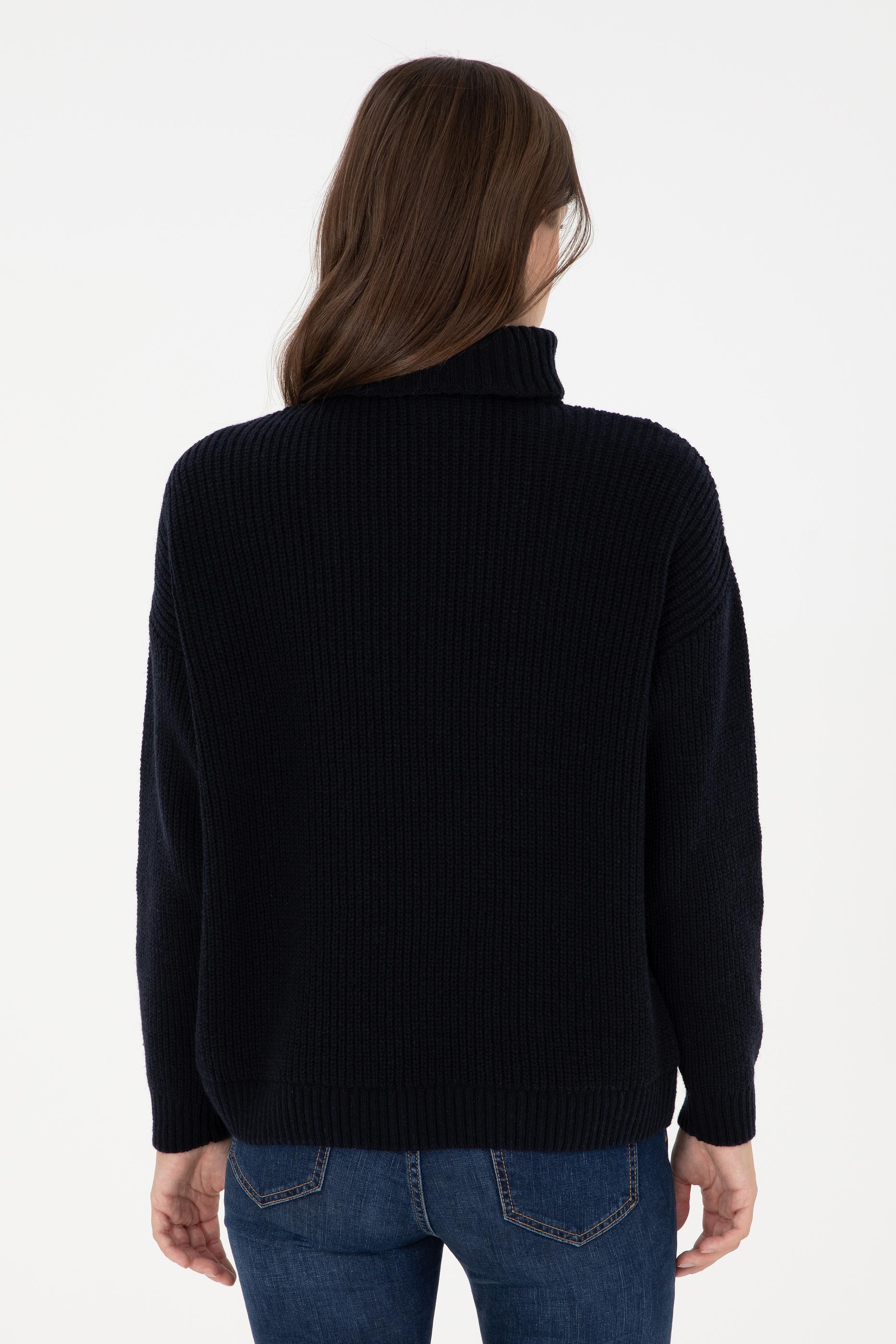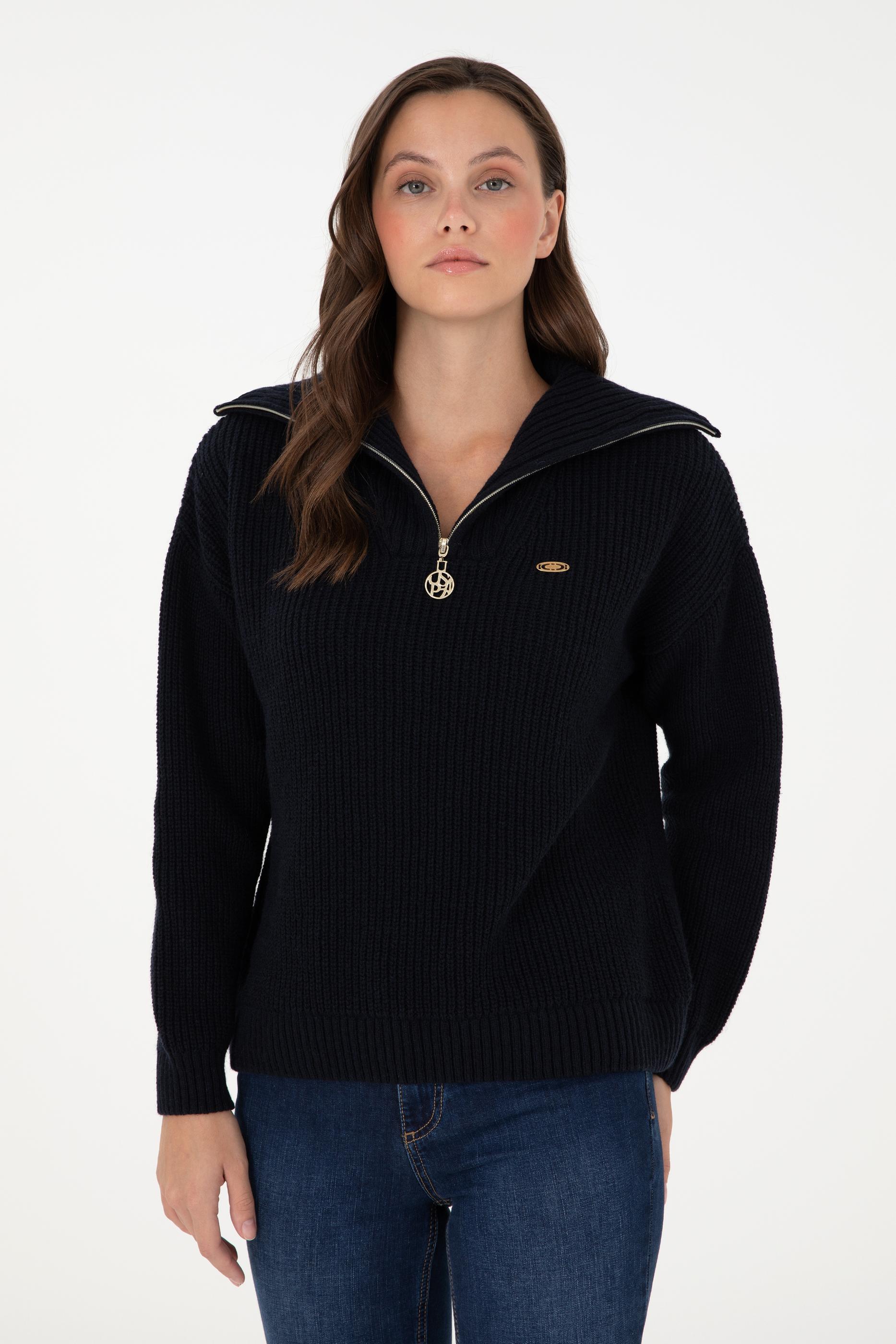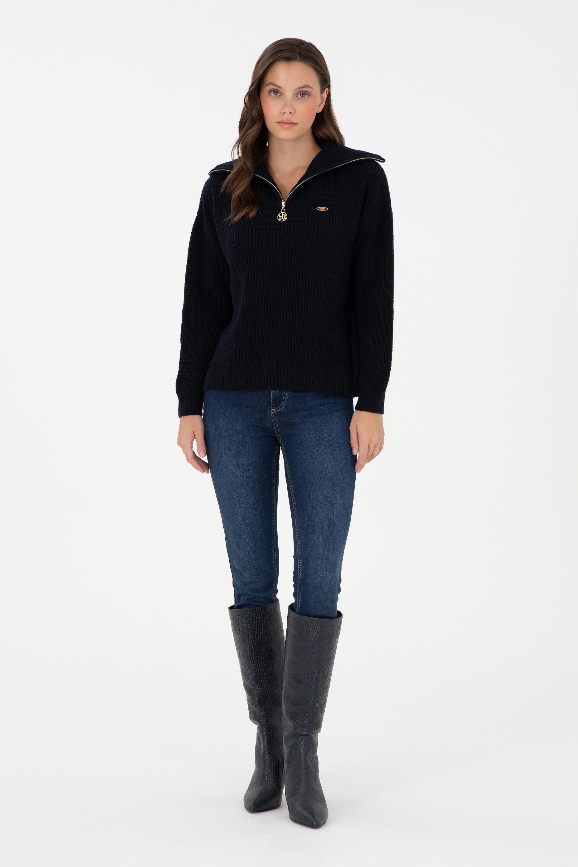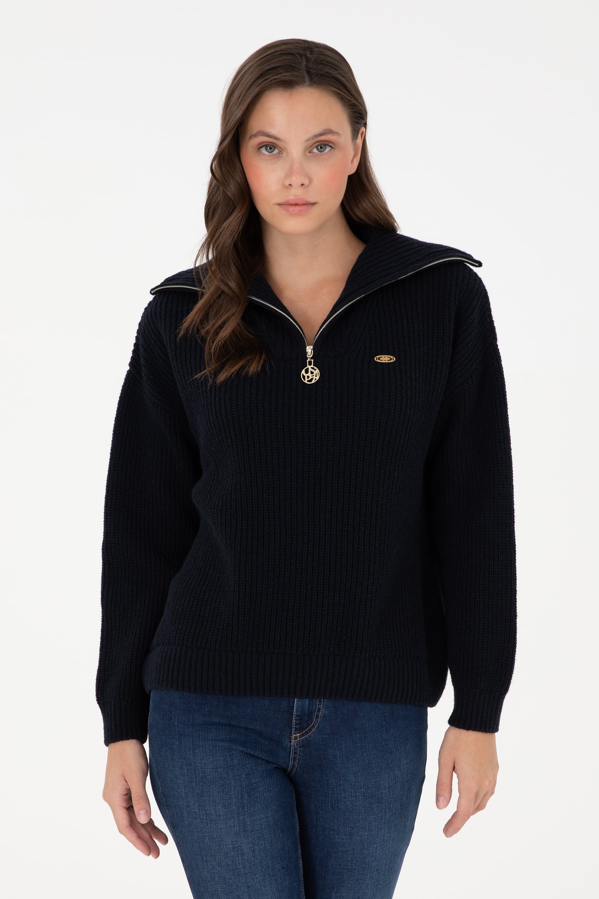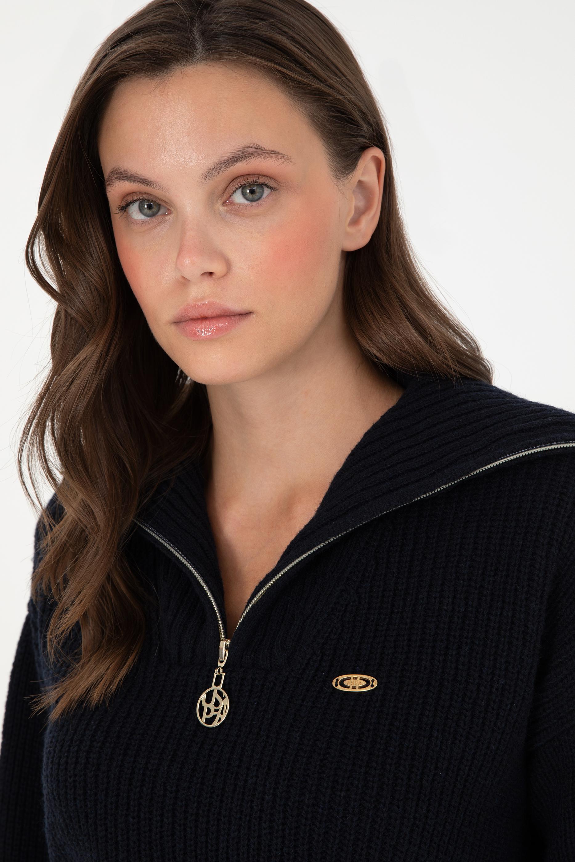 Kadın Lacivert V Yaka Fermuarlı Kazak
