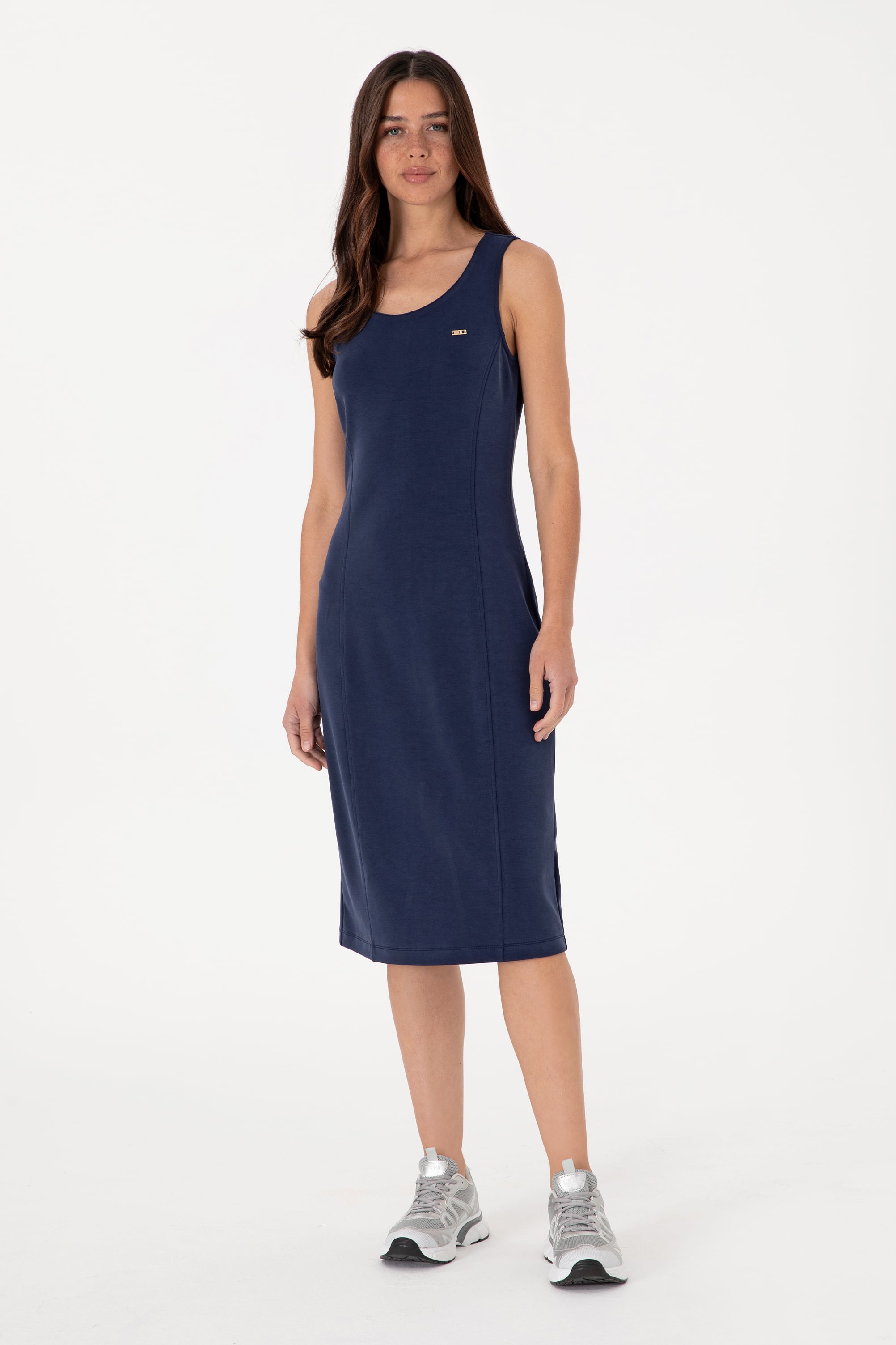 U.S. Polo Assn. tasarımı bu lacivert elbise, modal karışımlı yumuşak kumaşı ve vücuda oturan siluetiyle hem konforlu hem şık bir görünüm sunar. Kolsuz yapısı ve bisiklet yaka detayıyla yaz aylarında serin bir kullanım sağlarken, hafif esnek dokusu gün boyu rahat hareket etmeye olanak tanır. Minimal tasarımına eşlik eden küçük logo detayı markaya özgü zarif bir dokunuş katarken, diz altına kadar uzanan formu sportiften şıka geçiş yapabileceğiniz kombinler için idealdir. Lacivertin zamansız ve toparlayıcı etkisi ise elbiseyi hem sade hem güçlü kılar.