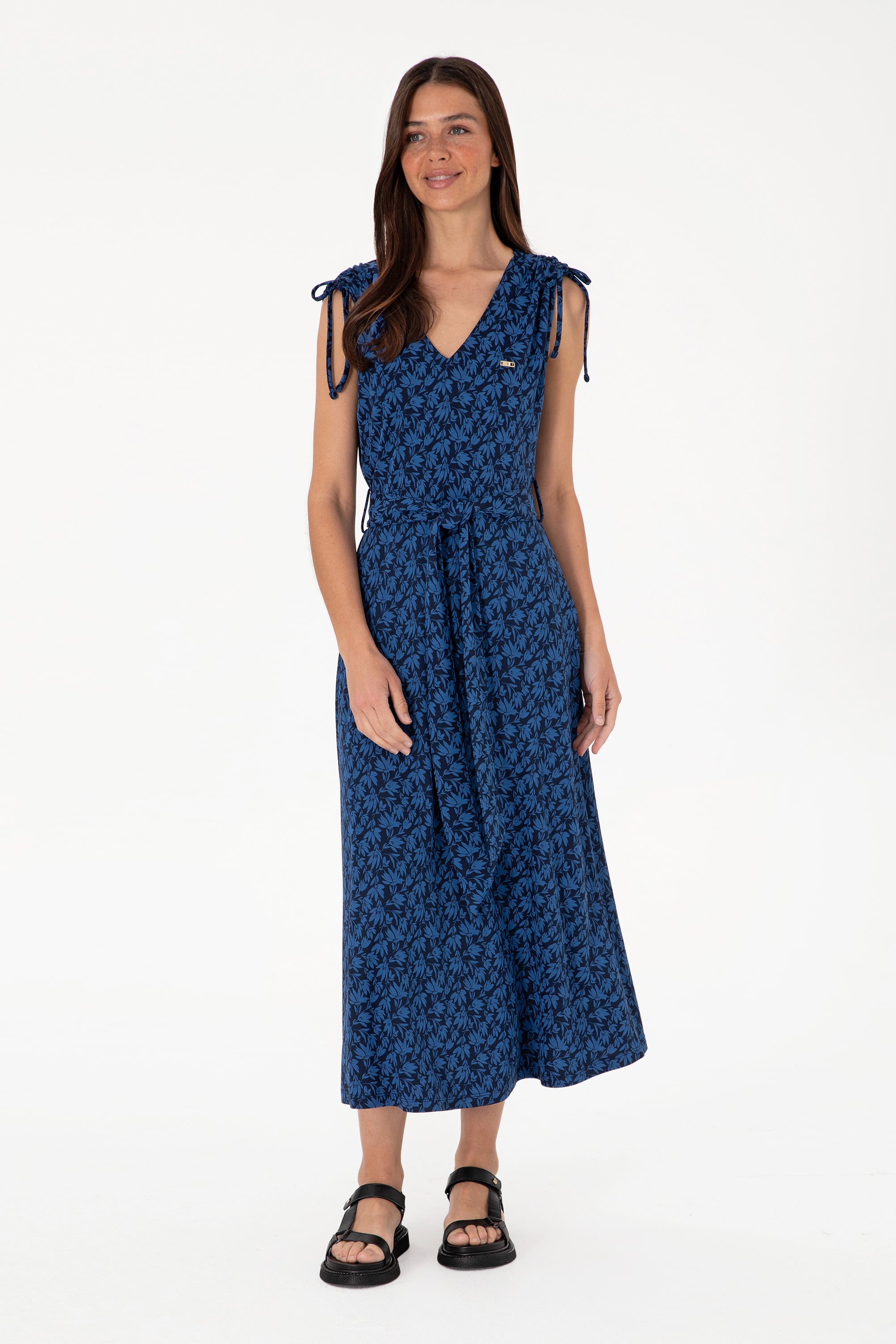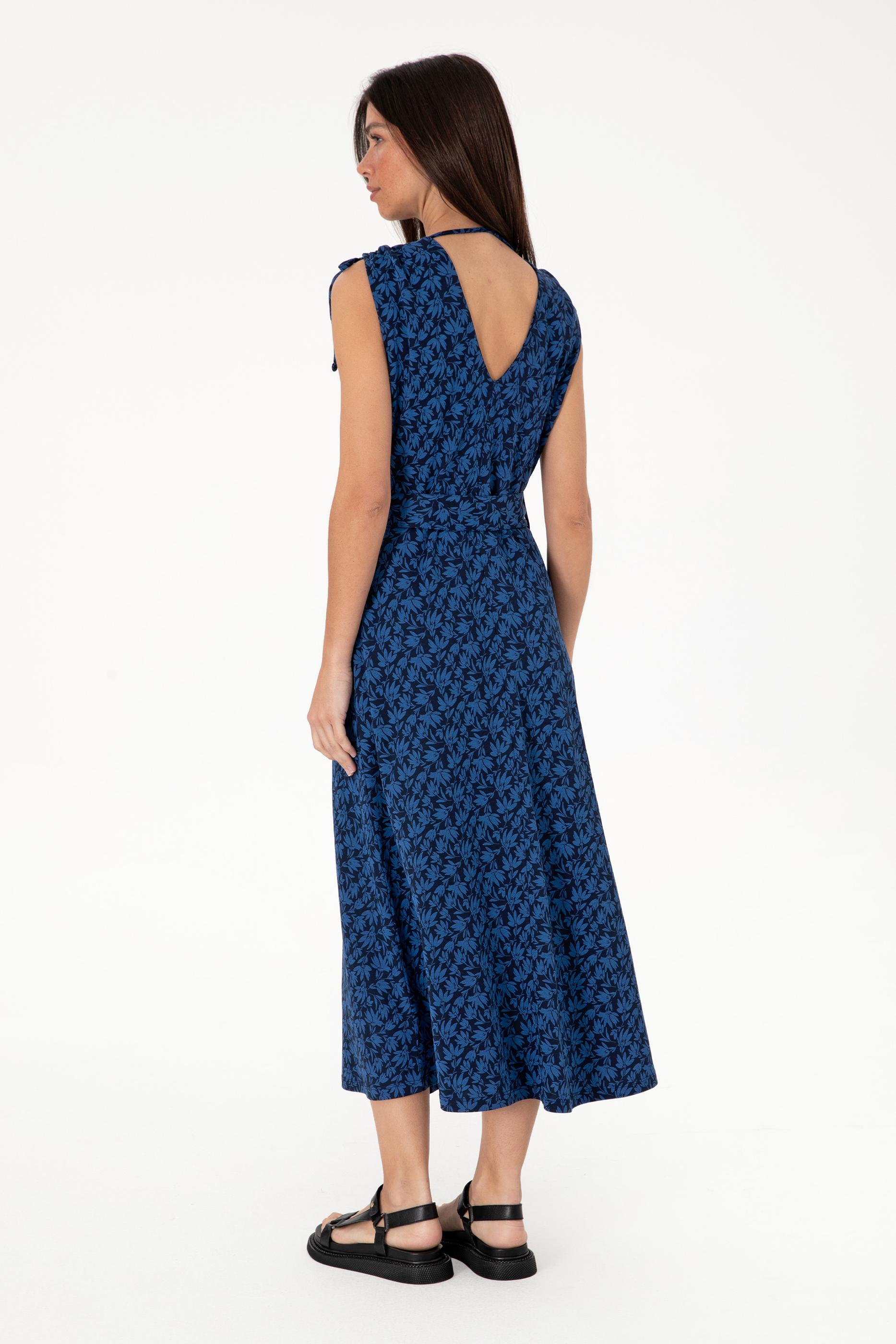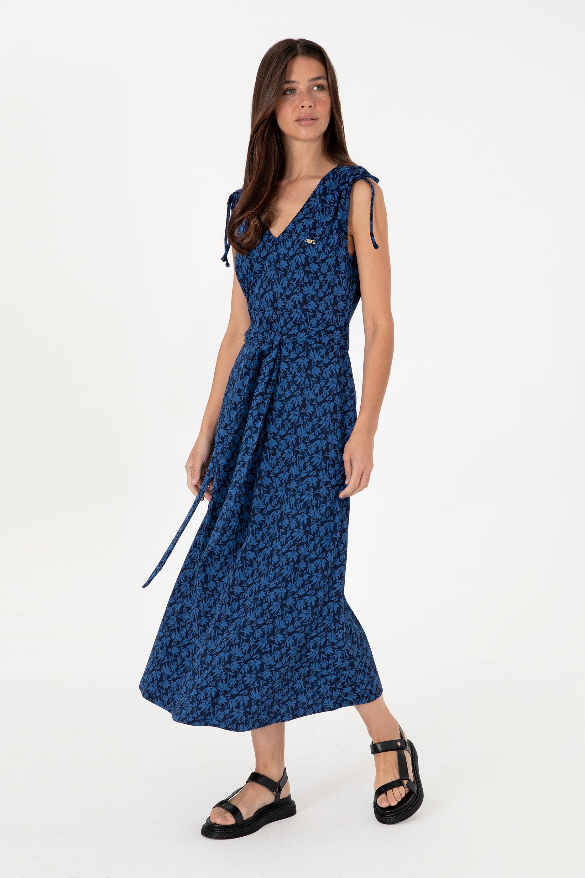 U.S. Polo Assn. stilini desenli ve feminen bir yorumla sunan bu lacivert renkli elbise, zarif V yaka kesimi ve kuşaklı bel detayıyla silueti dengeli şekilde vurgular. Yumuşak örme kumaşı sayesinde cilde konforlu bir temas sunarken, omuz bağcıkları ve yaprak desenleri modele hareket ve doğallık katar. Diz altı boyu ve dökümlü formu, yazın sıcak günlerinde hem şehir hem tatil stiline rahatça uyum sağlar. lacivert zemin üzerindeki kontrast yaprak desenleri ise bohem bir dokunuşla natürel ama dikkat çekici bir görünüm yaratır.