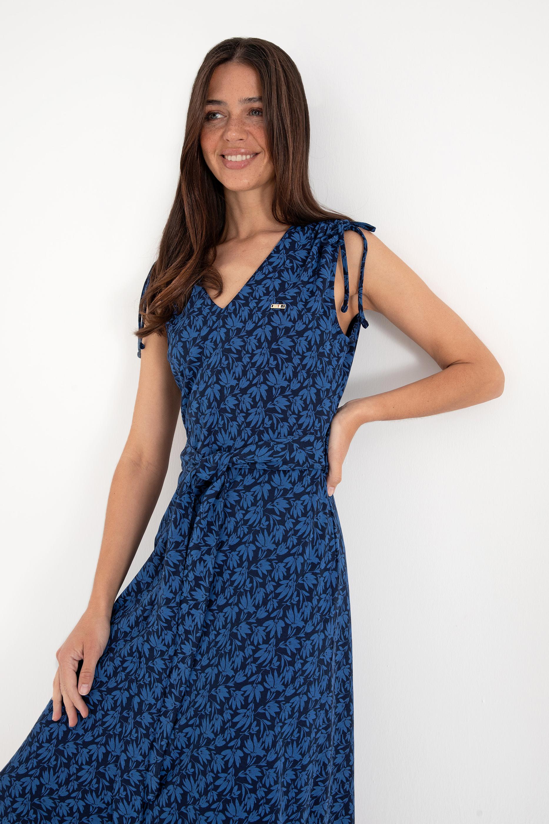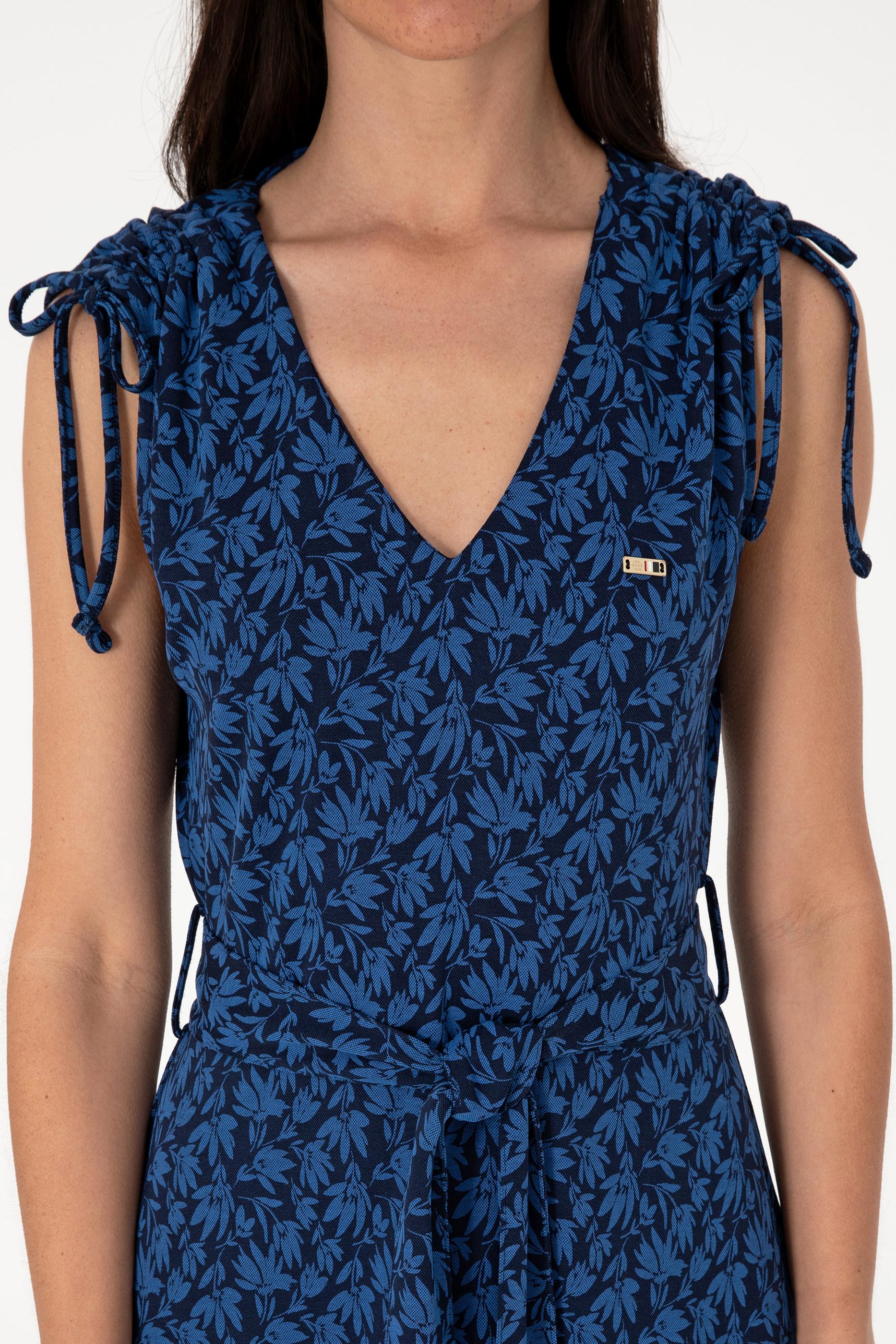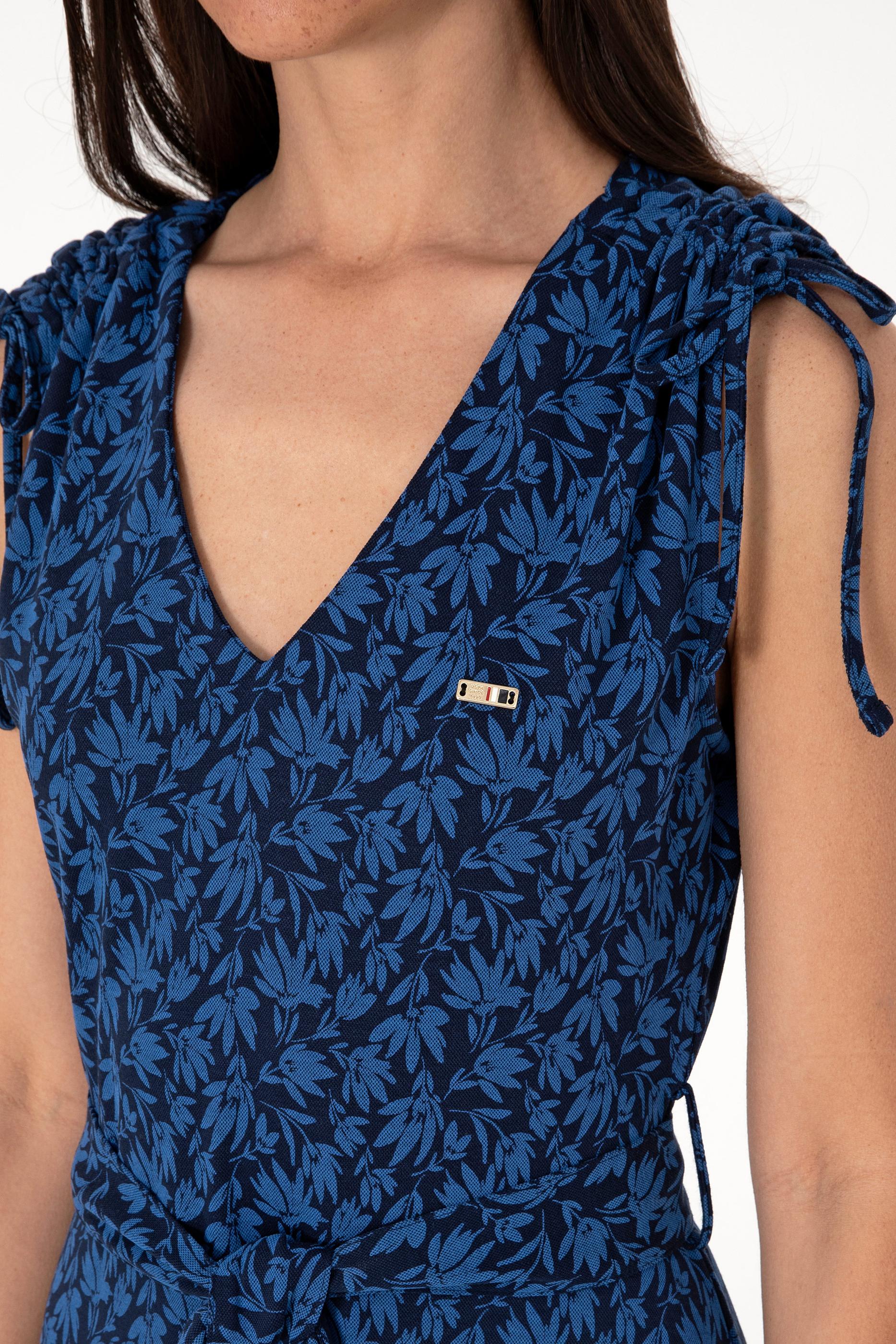 U.S. Polo Assn. stilini desenli ve feminen bir yorumla sunan bu lacivert renkli elbise, zarif V yaka kesimi ve kuşaklı bel detayıyla silueti dengeli şekilde vurgular. Yumuşak örme kumaşı sayesinde cilde konforlu bir temas sunarken, omuz bağcıkları ve yaprak desenleri modele hareket ve doğallık katar. Diz altı boyu ve dökümlü formu, yazın sıcak günlerinde hem şehir hem tatil stiline rahatça uyum sağlar. lacivert zemin üzerindeki kontrast yaprak desenleri ise bohem bir dokunuşla natürel ama dikkat çekici bir görünüm yaratır.