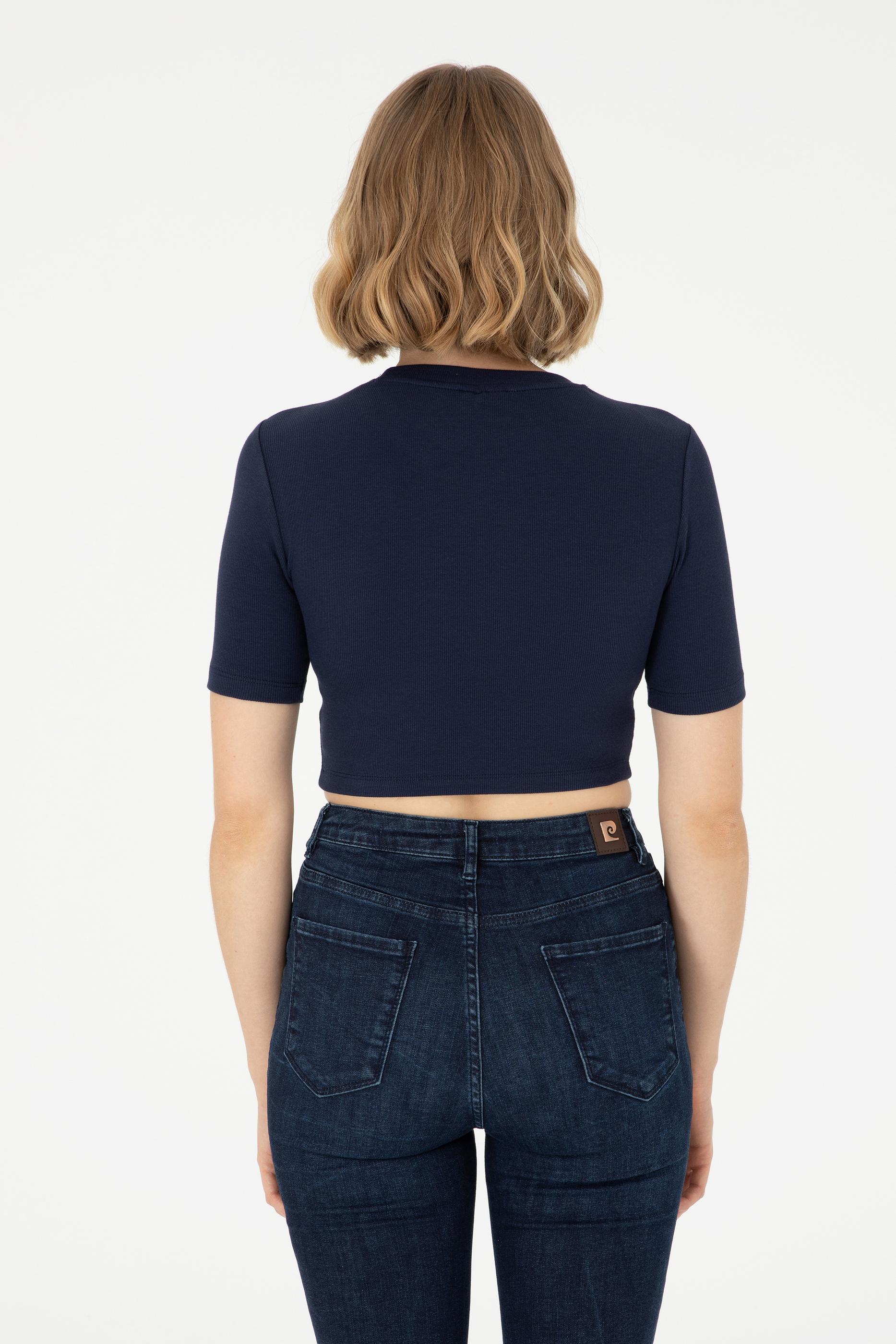 Kadın Lacivert Bisiklet Yaka Crop Tişört